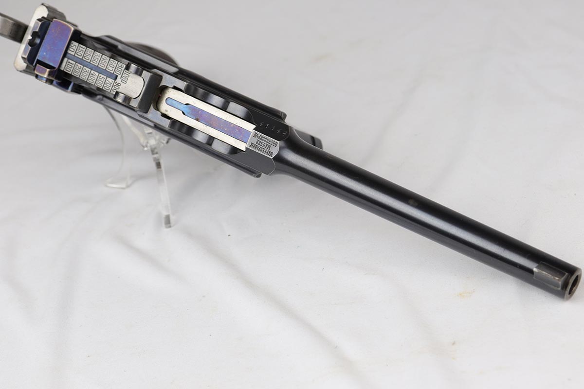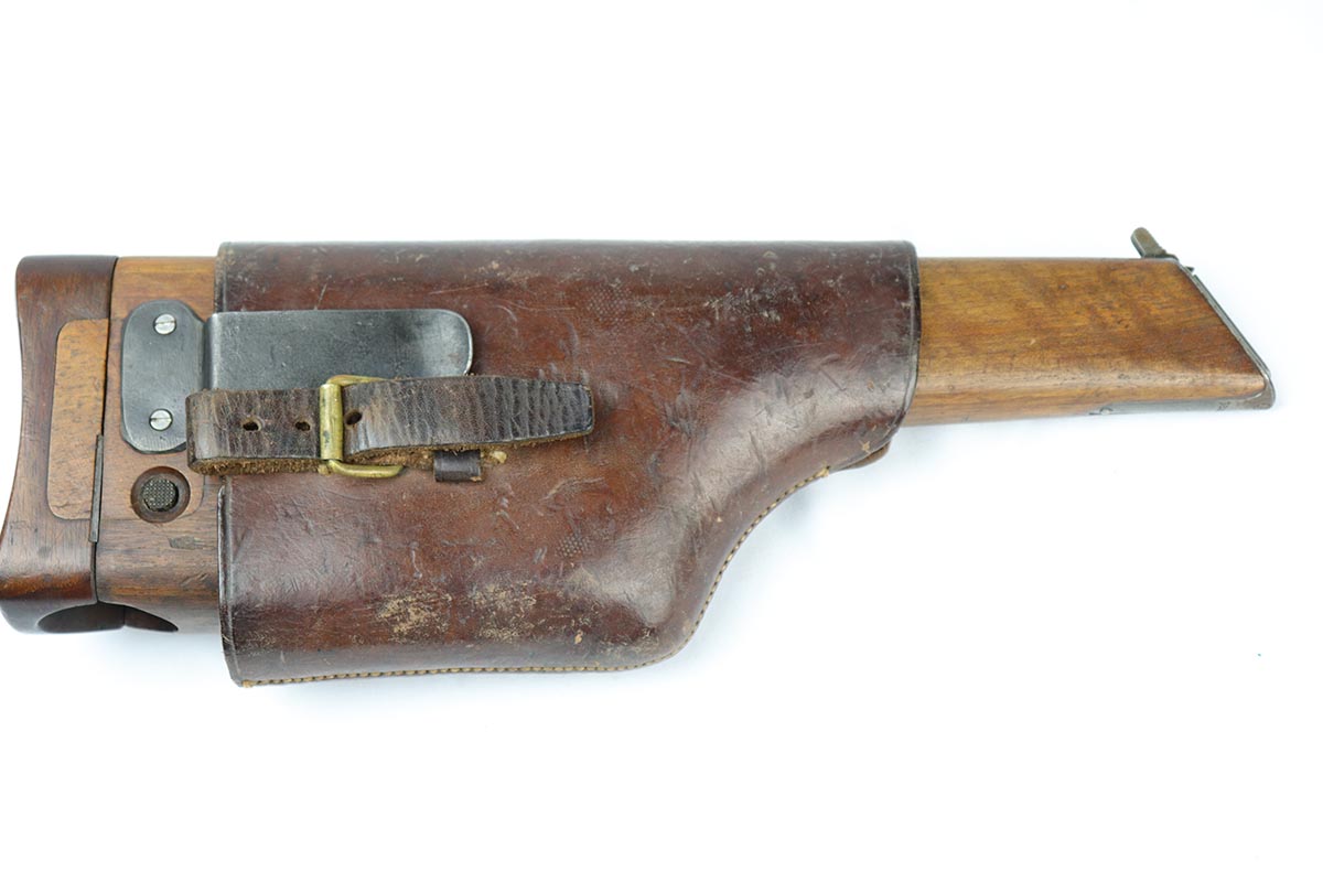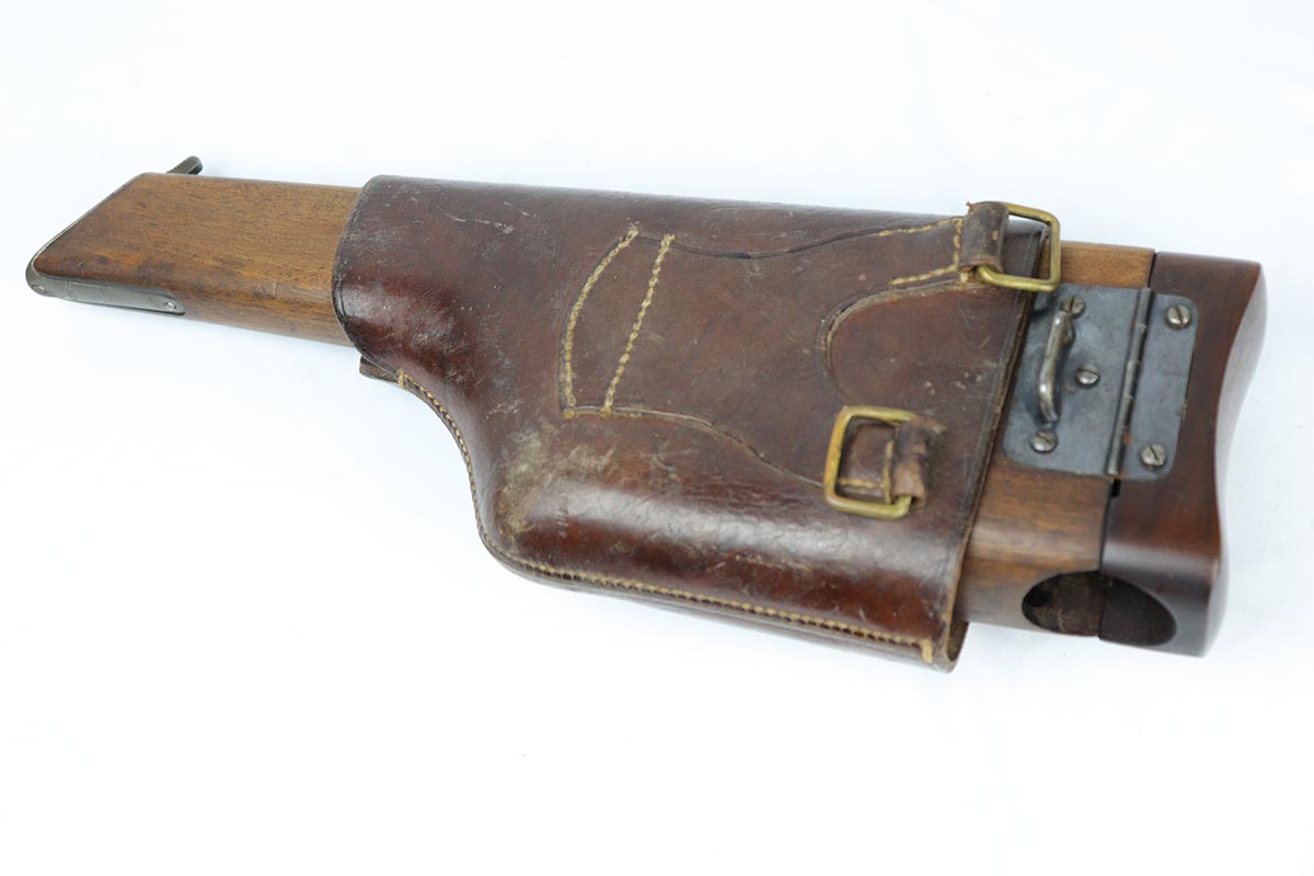7/26/18 – This is a near-mint, early commercial Broomhandle rig, dating back to the Pre-WWI era.  It has a desirable Von Lengerke & Detmold marking on the left side, and shows very little wear except for minor edge and stock wear on the barrel. Bright original blue is without any rust or pitting and shows practically no signs of use. All matching, including the grips and stock, which is without defects. Beautiful bore. Strong vivid fire blue on the small parts. Beautiful commercial leather harness without any markings. An outstanding example of an early all matching rig.