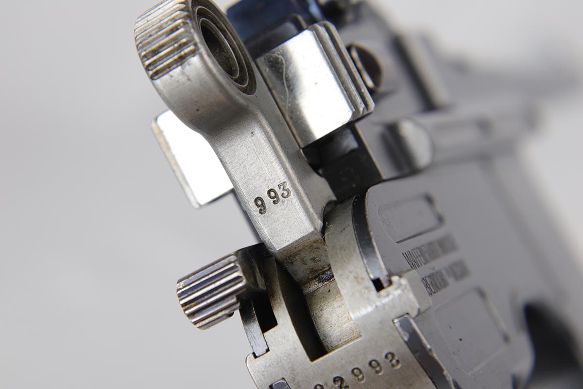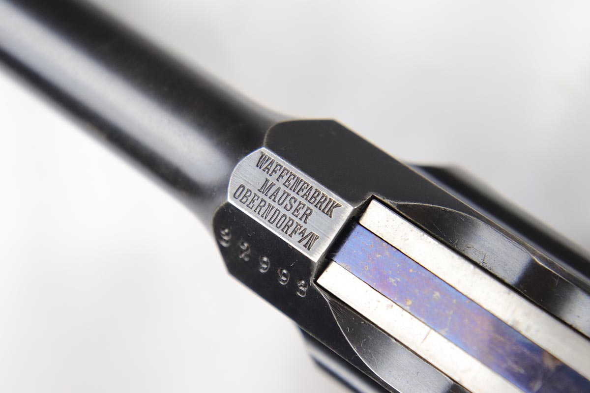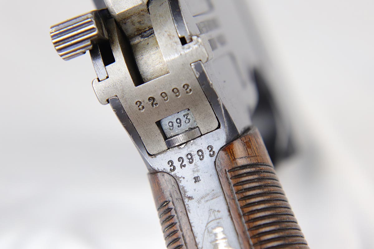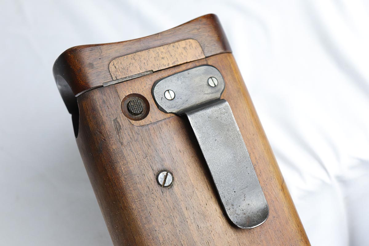7/26/18 – This is a near-mint, early commercial Broomhandle rig, dating back to the Pre-WWI era.  It has a desirable Von Lengerke & Detmold marking on the left side, and shows very little wear except for minor edge and stock wear on the barrel. Bright original blue is without any rust or pitting and shows practically no signs of use. All matching, including the grips and stock, which is without defects. Beautiful bore. Strong vivid fire blue on the small parts. Beautiful commercial leather harness without any markings. An outstanding example of an early all matching rig.