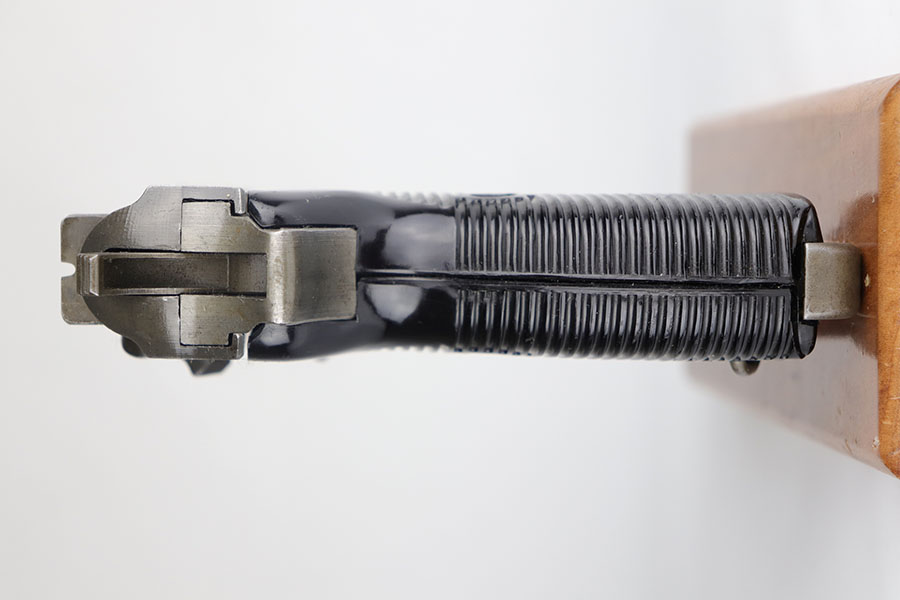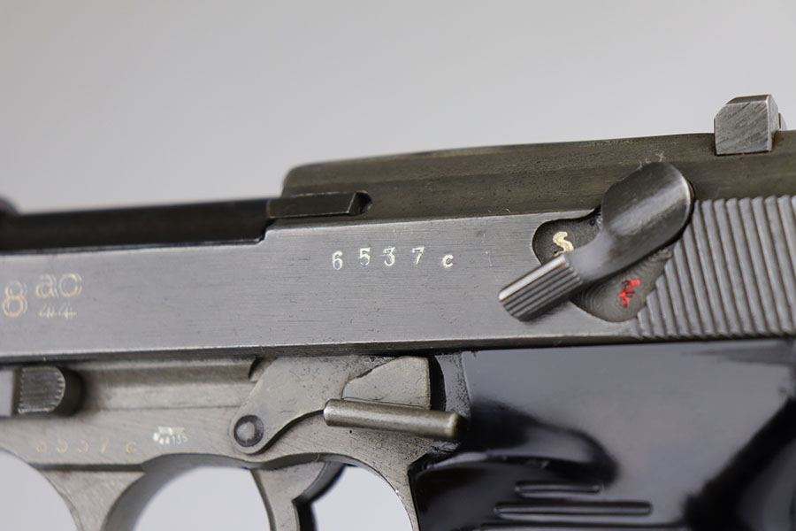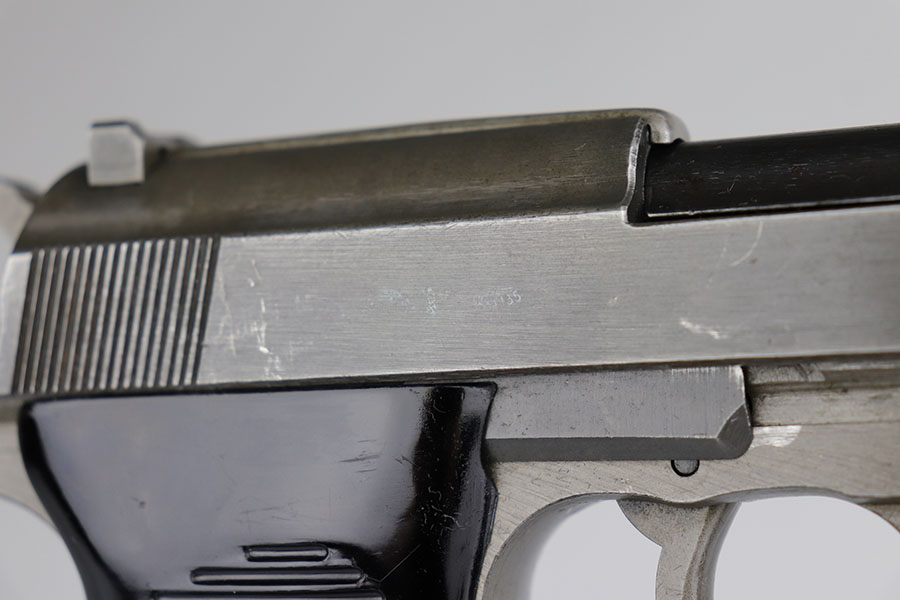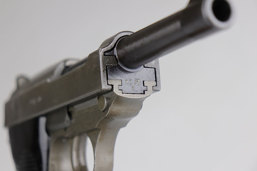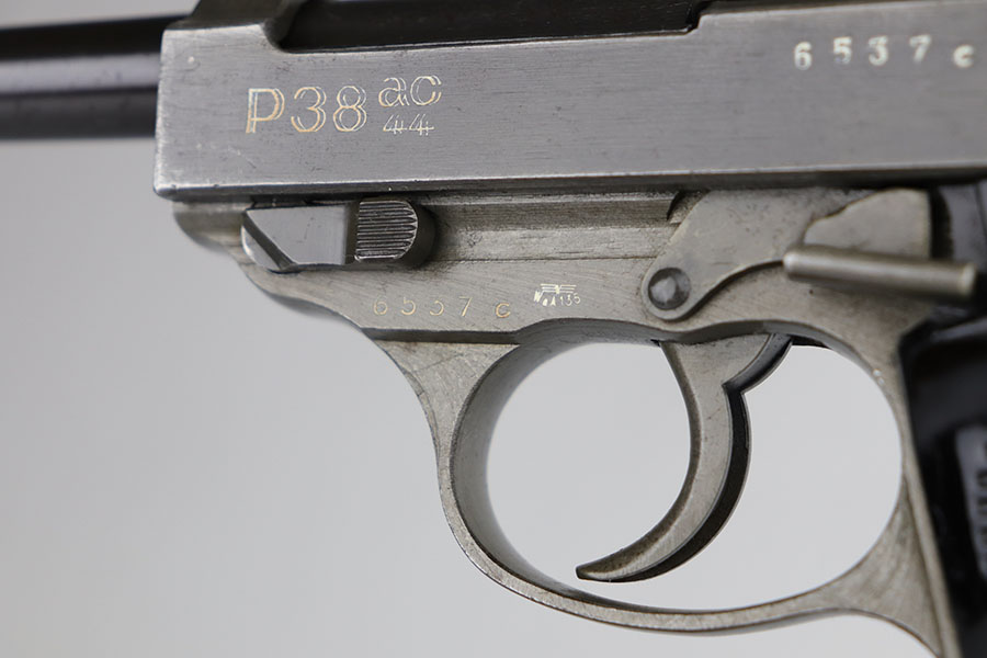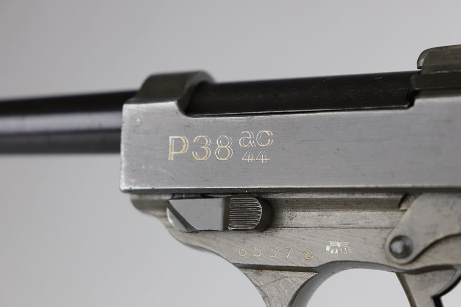 6/26/20 – This is a super rare Mauser P.38 in exceptional condition, one of only ~2850 ever produced. It’s a dual-tone pistol with ‘ac 44’ marked slide but Mauser proofed frame, indicating slide was produced at FN factory and assembly completed there. The slide legend does appear to have been a weak strike that was redone, but appears fully original. It’s all matching and original with just a bit of high edge wear on slide and muzzle, and two minor areas of finish loss on the right side of the slide. Mint bore and proper mechanics, including de-cocker. Excellent grips. Blued barrel but all other parts have phosphate finish.