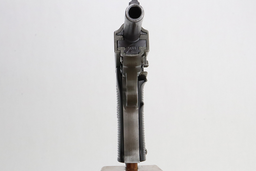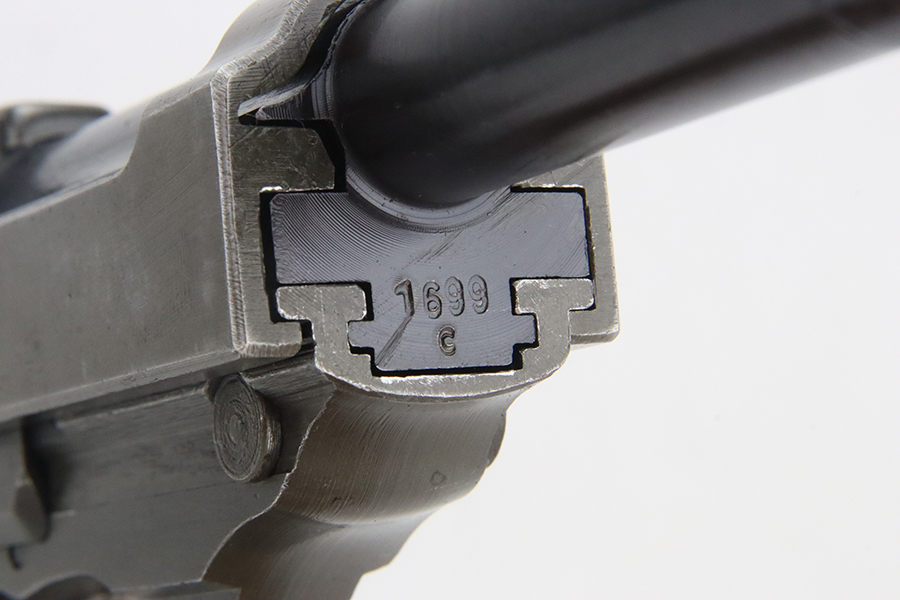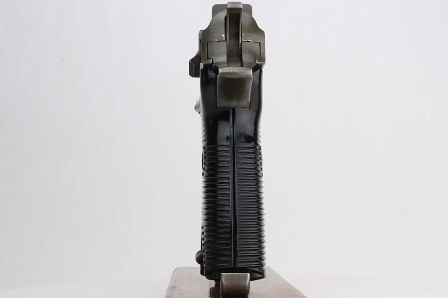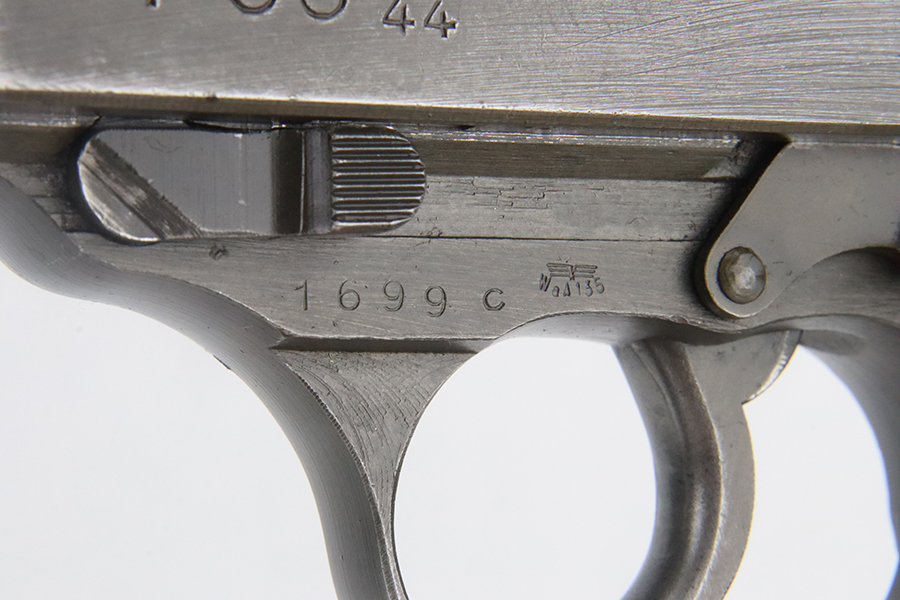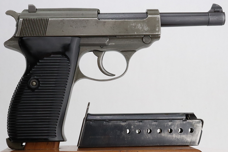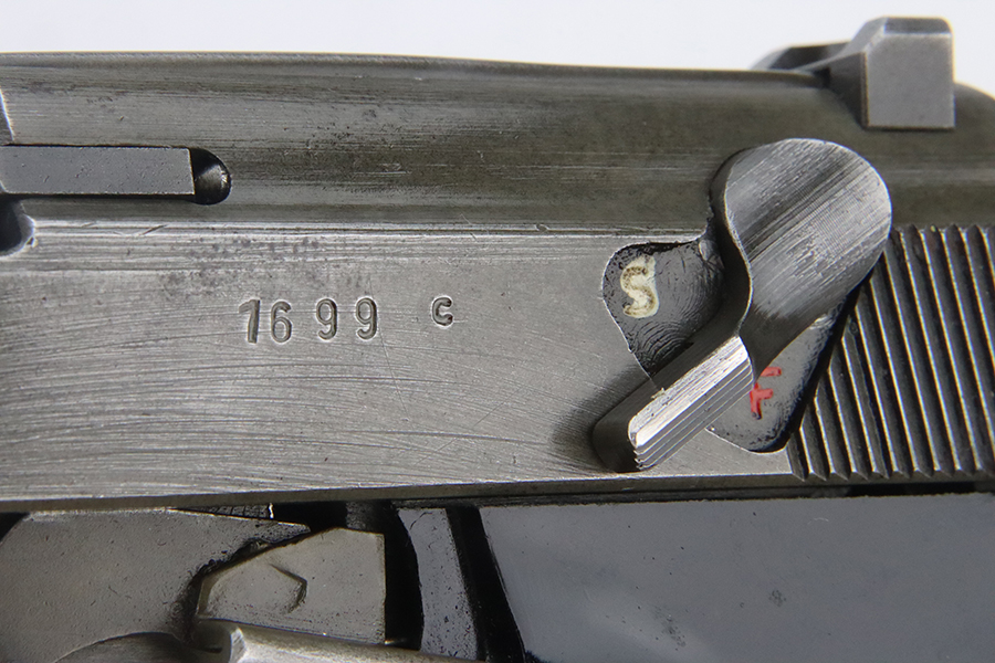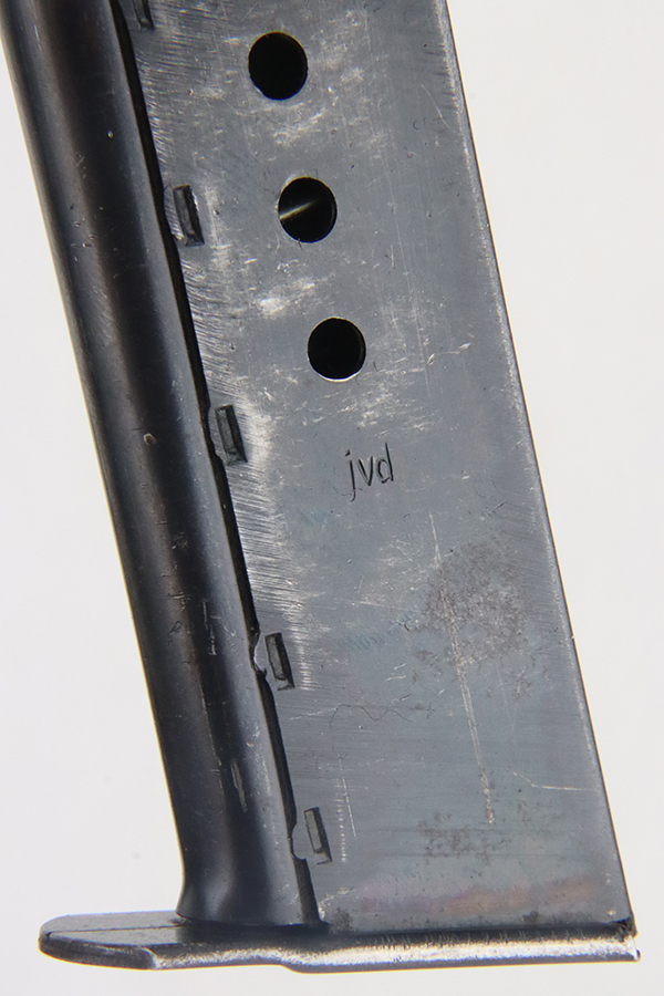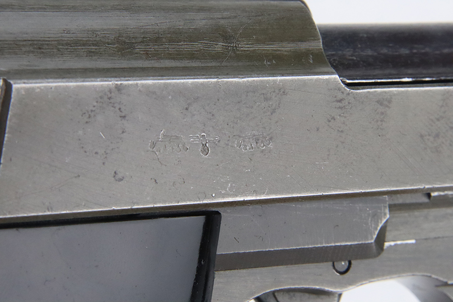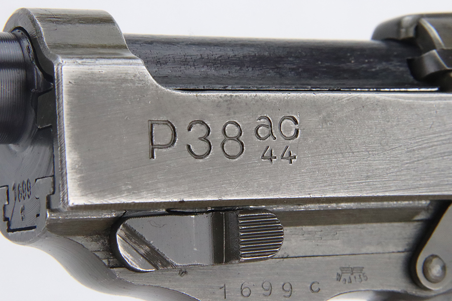 2/13/24 – This is a very rare Mauser P.38 in excellent condition, one of only ~2,850 ever produced. It’s a dual-tone pistol with ‘ac 44’ marked slide but Mauser proofed frame, indicating slide was produced at FN factory and assembly completed there. The pistol has a very nice profile view but some high edge wear on the slide and muzzle. Finish on front strap is thin/dull but this is commonly seen on phosphate P.38s. Phosphate finish on slide, frame and some small parts. Strong bore with only minor hints of frost. De-cocker is functional. Excellent, black grips aside from a couple scuffs on the left panel. Magazine is ‘jvd’ marked.