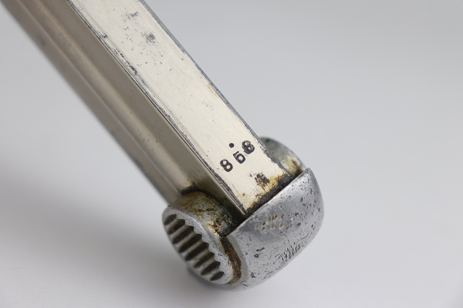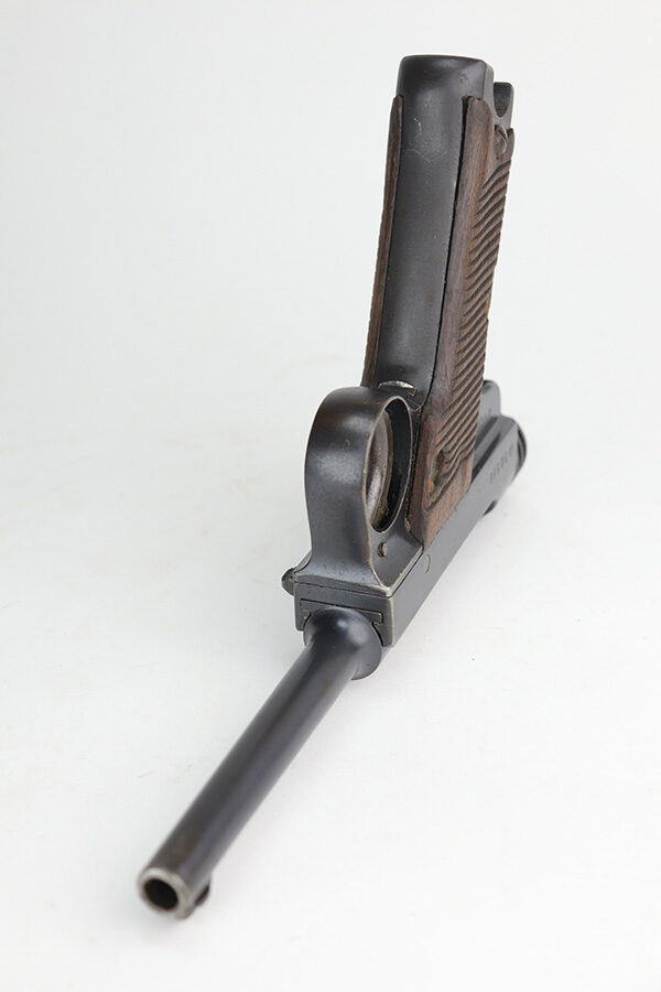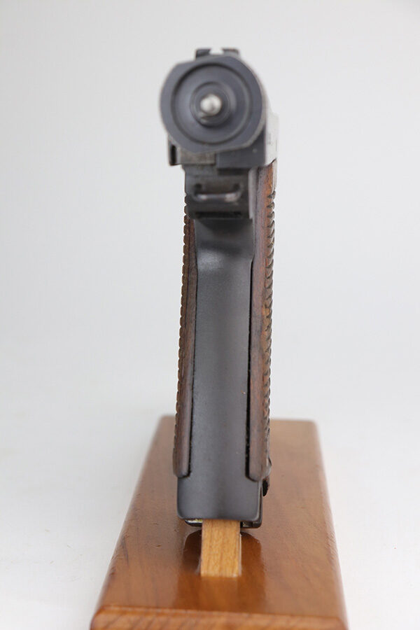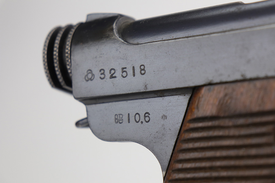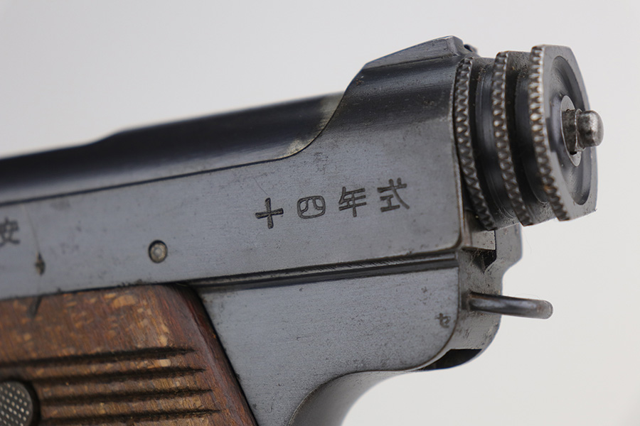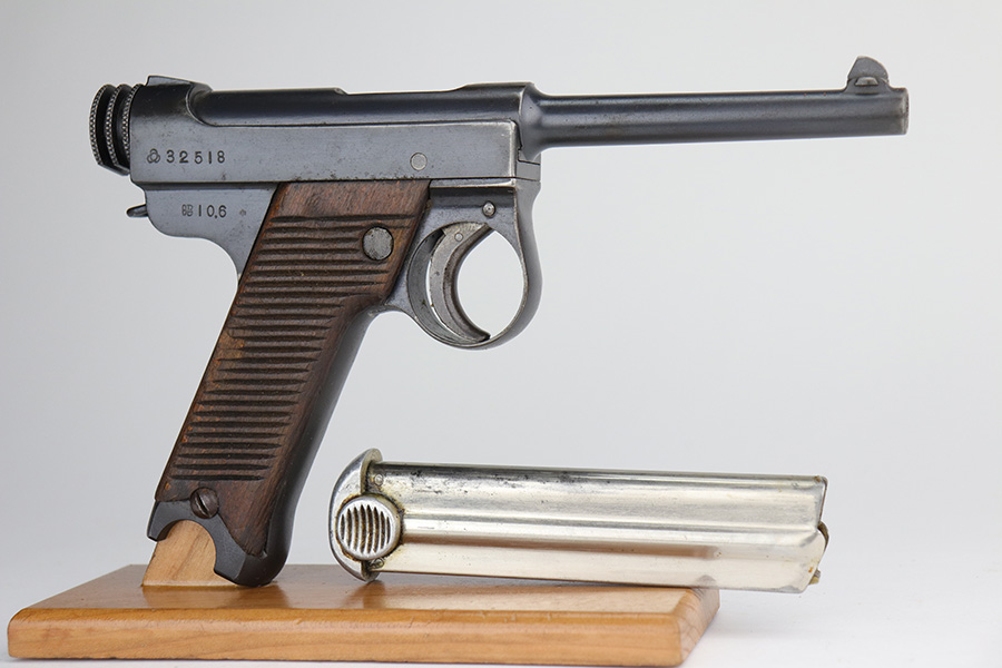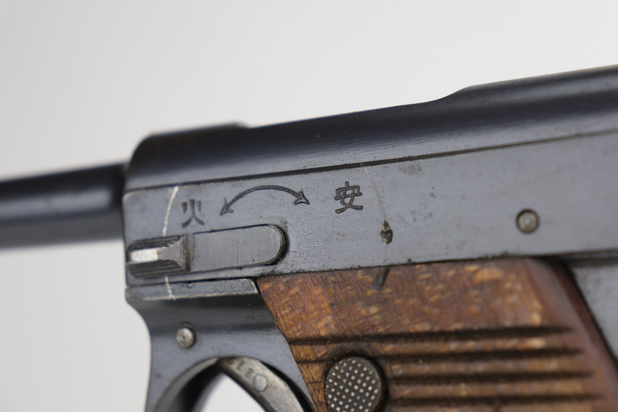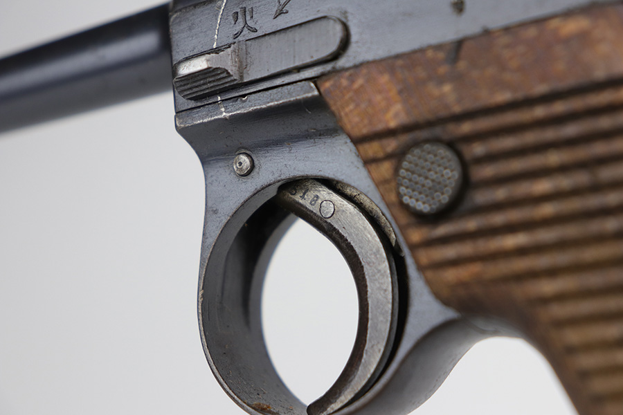 10/29/21 – This is a rare and excellent example of an early Nambu Type 14 issued to the Japanese military in June of 1935. Only ~1.7% of total Type 14 production was done at the Kokura Arsenal, all in serial range of 30735-35414 and made in 1935-46. The gun is all matching and was made in the Tokyo arsenal. It also has an early small trigger guard. There is an import mark under the left grip panel. It comes with an early mismatched magazine with a properly nickel-plated tube. The gun has retained about 96% of its original finish. There is minor wear on the very front edges of the frame (most noticeable on the right side) and around the muzzle. There is also an area of wear at the back of the top of the slide. While there isn’t much actual finish loss, there is a small area of minor pitting on the barrel. There is also heavy brown patina and pin-pricking on both grip straps. There is pitting under both grip panels. Comes with nice period-correct grips that are un-numbered. The rifling is a bit worn with minor pin-pricking throughout.