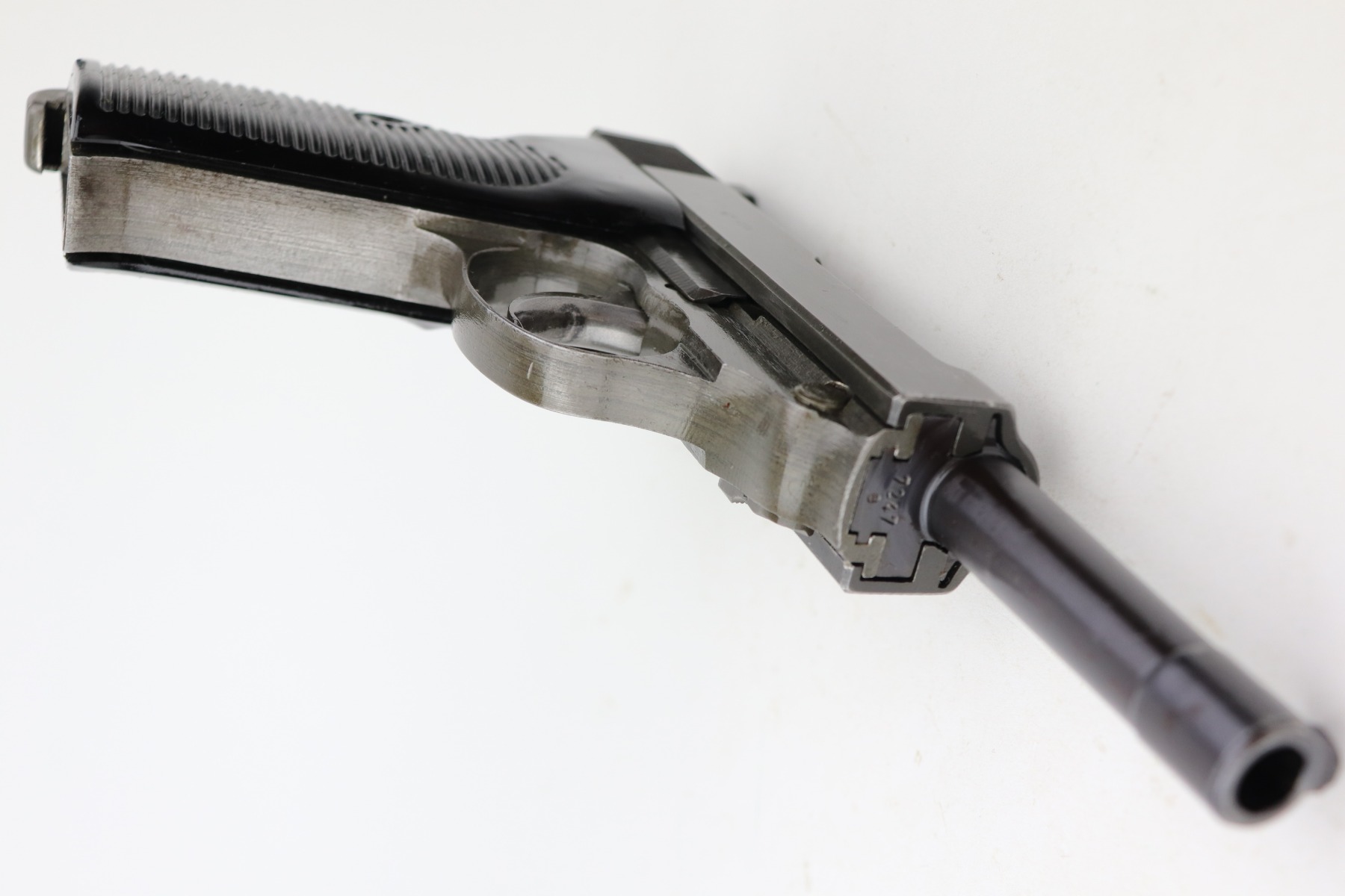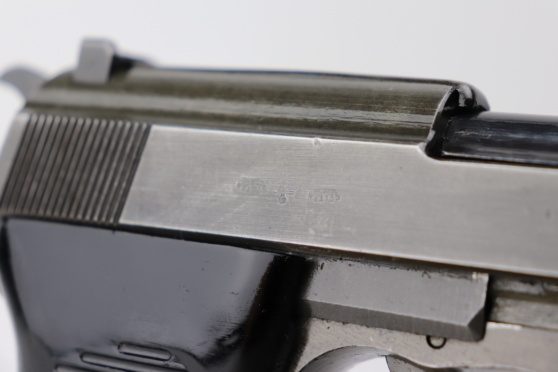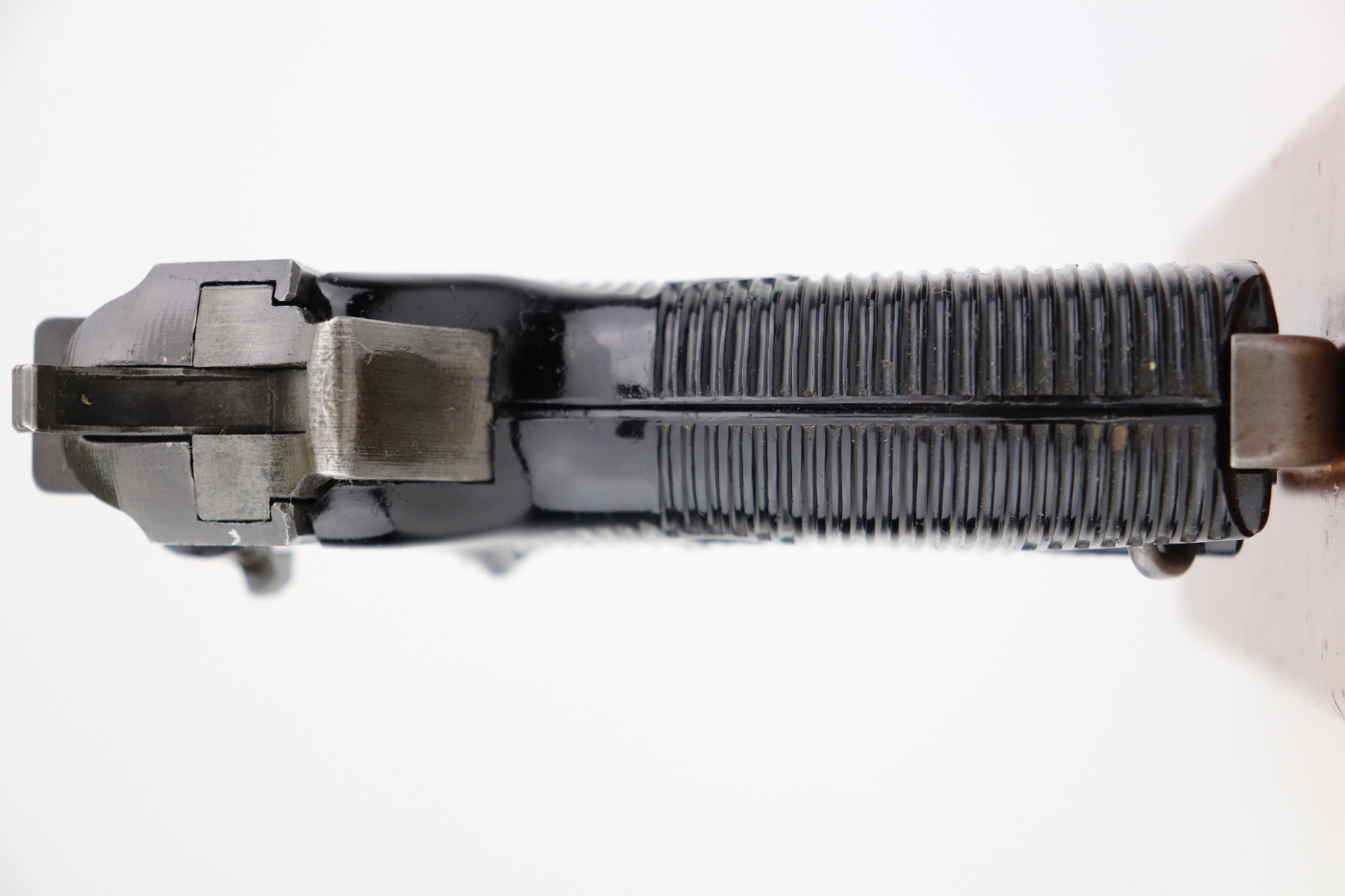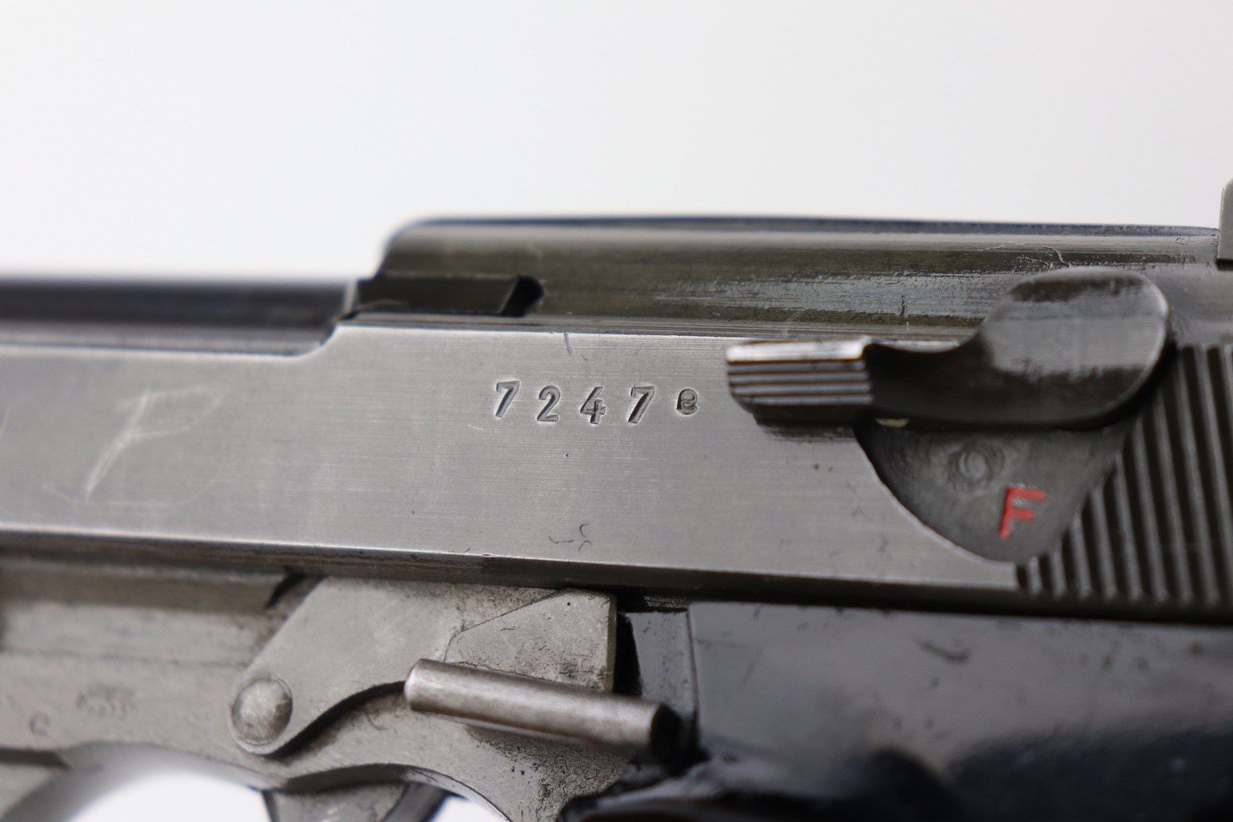 4/9/21 – This is an excellent example of a Mauser P.38 issued to the Nazi military in 1945. There were only 15,000 SVW 45’s produced, and over 346,000 total Mauser P.38’s produced during the war (Jan Still, Axis Pistols). These SVW’s are rare and Legacy does not get them often. This gun has a dual-tone finish, with a phosphate slide and frame, but blued barrel. This one is all matching and has the proper “Waffen 135” military proofs. It has retained about 96% of its original finish. There is minor thinning on the front strap and a hint of wear around the muzzle. There is a “P” scratched into the left side of the slide. Comes with excellent grips and a proper magazine. The bore is mint. De-cocker is functional.