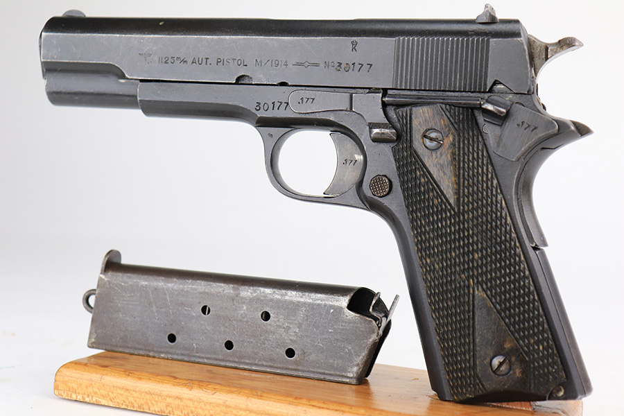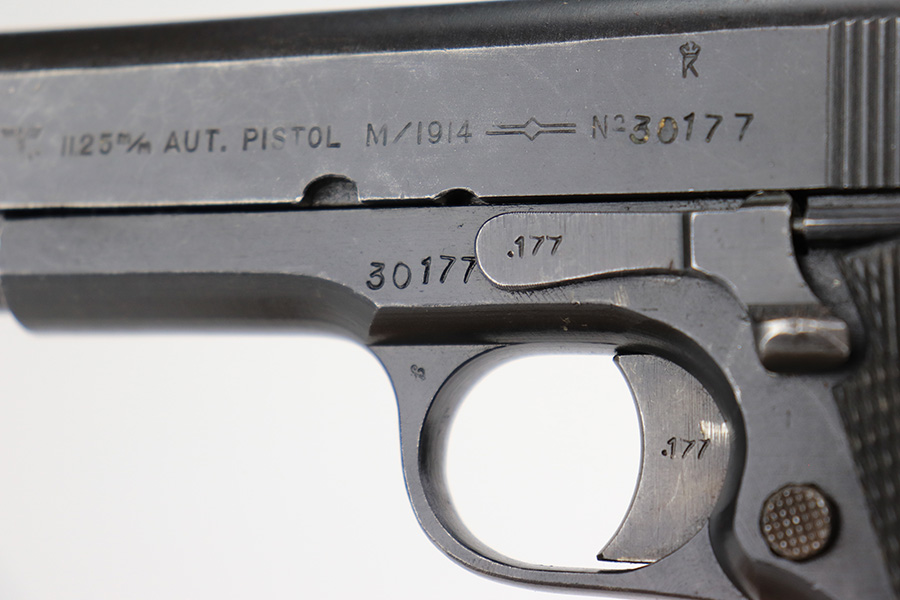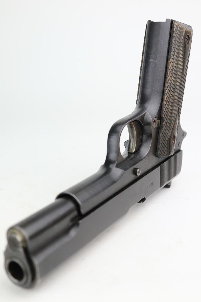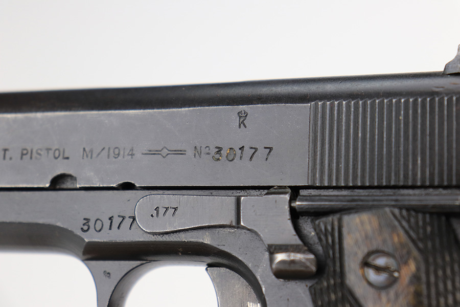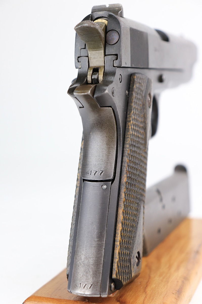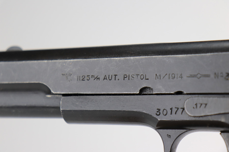 5/8/24 – This is an excellent Kongsberg Colt model 1914, manufactured in 1945 and issued to the Nazi Army. These are rare pistols, and this one is all original and correct. The finish rates at about 95% with nearly all of the wear on the grip safety and mainspring housing. Colt licensed out production of the 1911 to Kongsberg Vaapenfabrik in Norway, who in 1945 produced less than 1,000 of this waffen variation according to Jan Still’s book. This particular piece falls in the documented serial range of 29261-30523, where only ~75 have been reported. It has the original matte blue finish and stained birch grips, which have retained a good portion of the dark stain finish. The gun is 1945 dated, and it is stamped along the left side of the slide “11.25m/m AUT. PISTOL M/1914” followed by the serial number, above which is a crown/K inspector proof. To the left of this stamp is an E/WaA84 Nazi proof, showing this gun was delivered to the German occupying forces in Norway. The barrel is numbered to the pistol and has the German eagle on the side of the lug. Correct mag with lanyard ring. No import marks.
