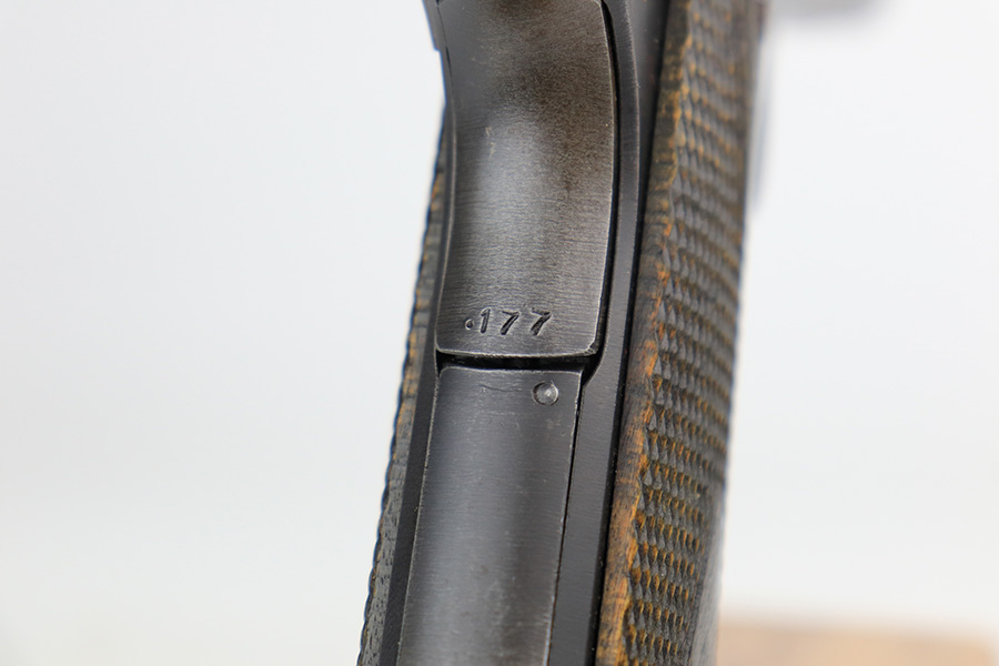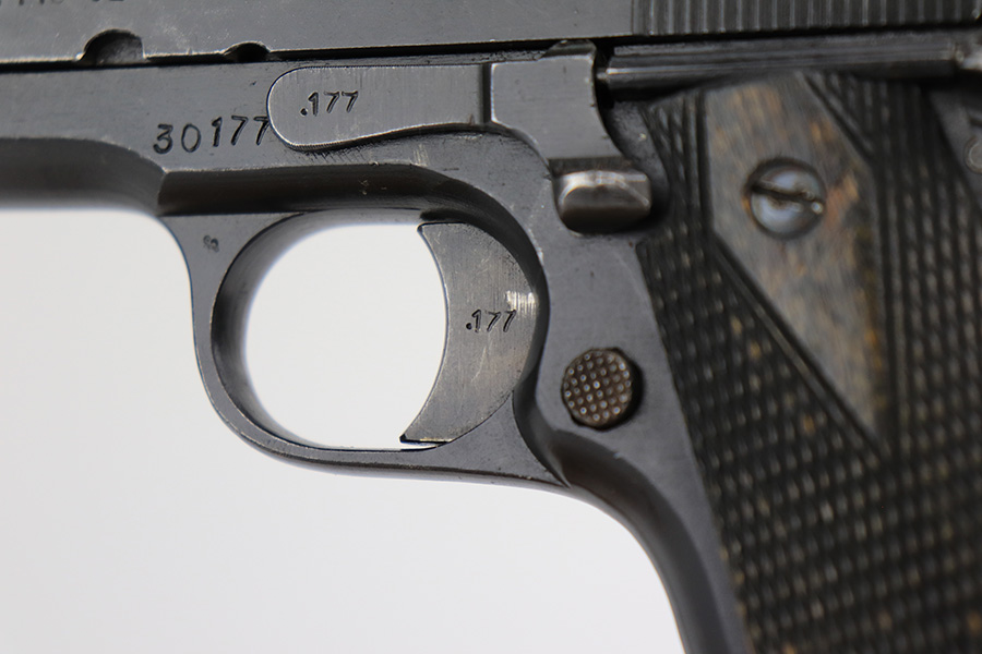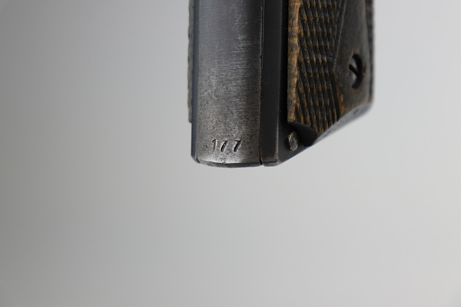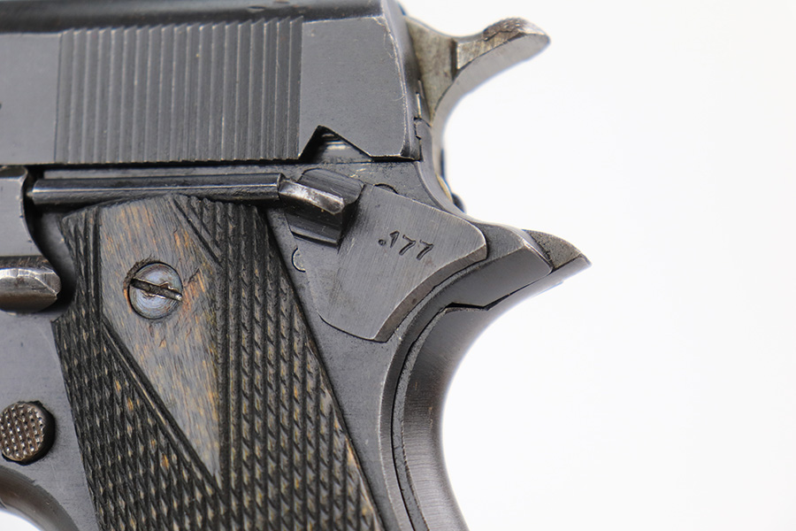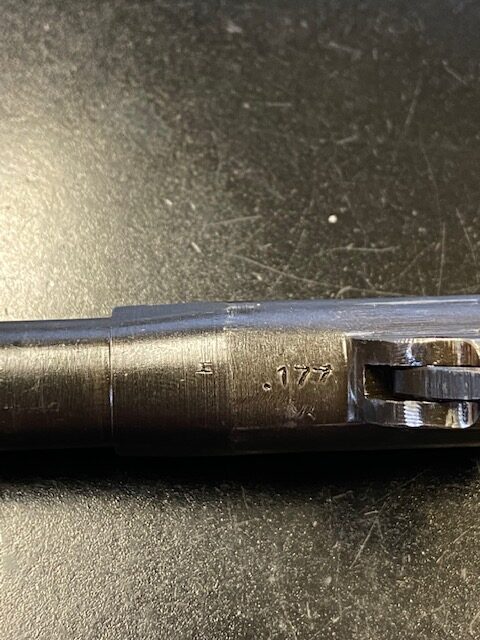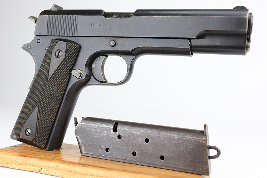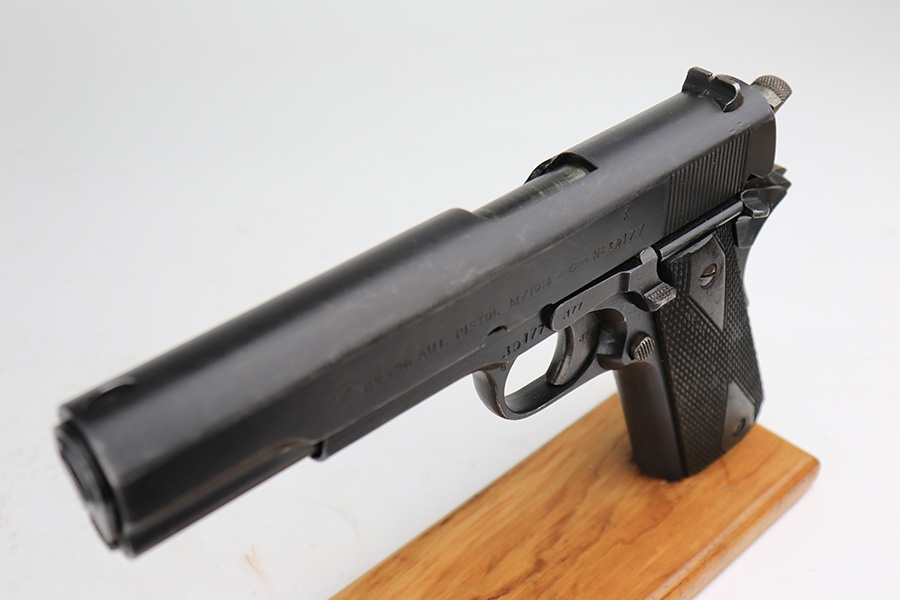 5/8/24 – This is an excellent Kongsberg Colt model 1914, manufactured in 1945 and issued to the Nazi Army. These are rare pistols, and this one is all original and correct. The finish rates at about 95% with nearly all of the wear on the grip safety and mainspring housing. Colt licensed out production of the 1911 to Kongsberg Vaapenfabrik in Norway, who in 1945 produced less than 1,000 of this waffen variation according to Jan Still’s book. This particular piece falls in the documented serial range of 29261-30523, where only ~75 have been reported. It has the original matte blue finish and stained birch grips, which have retained a good portion of the dark stain finish. The gun is 1945 dated, and it is stamped along the left side of the slide “11.25m/m AUT. PISTOL M/1914” followed by the serial number, above which is a crown/K inspector proof. To the left of this stamp is an E/WaA84 Nazi proof, showing this gun was delivered to the German occupying forces in Norway. The barrel is numbered to the pistol and has the German eagle on the side of the lug. Correct mag with lanyard ring. No import marks.
