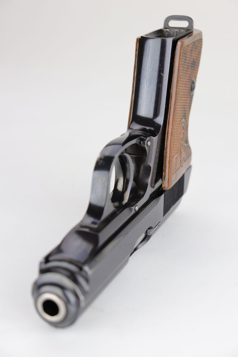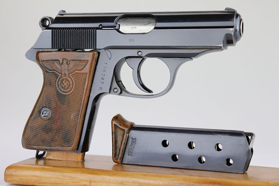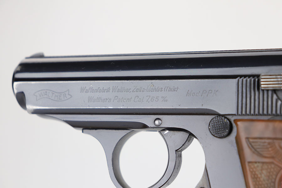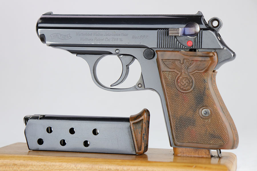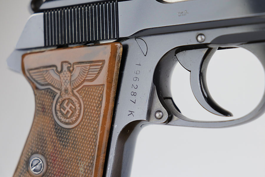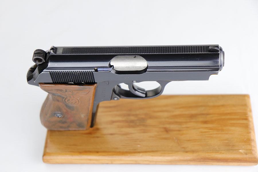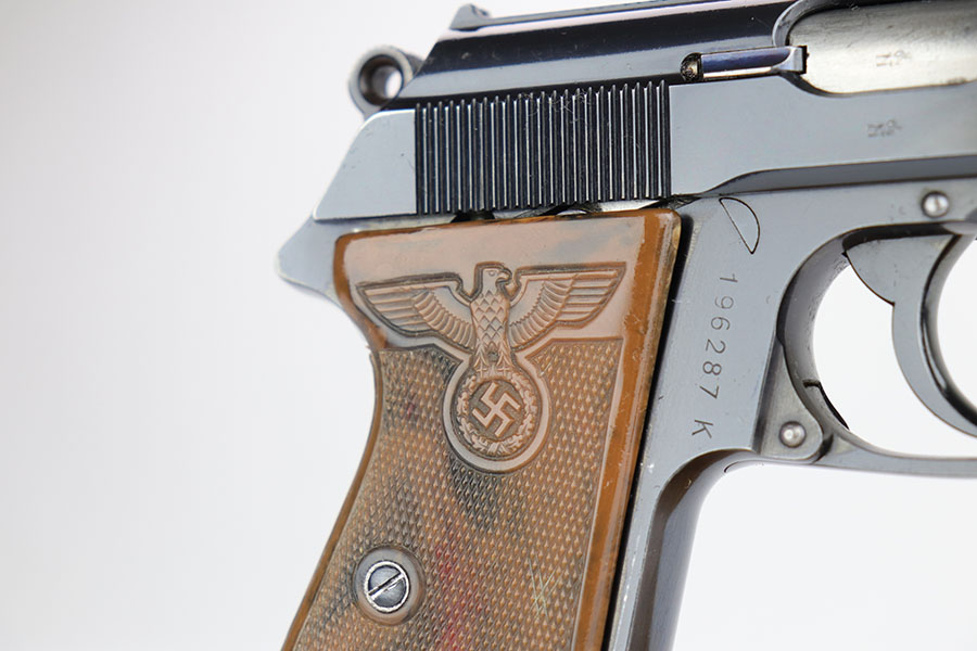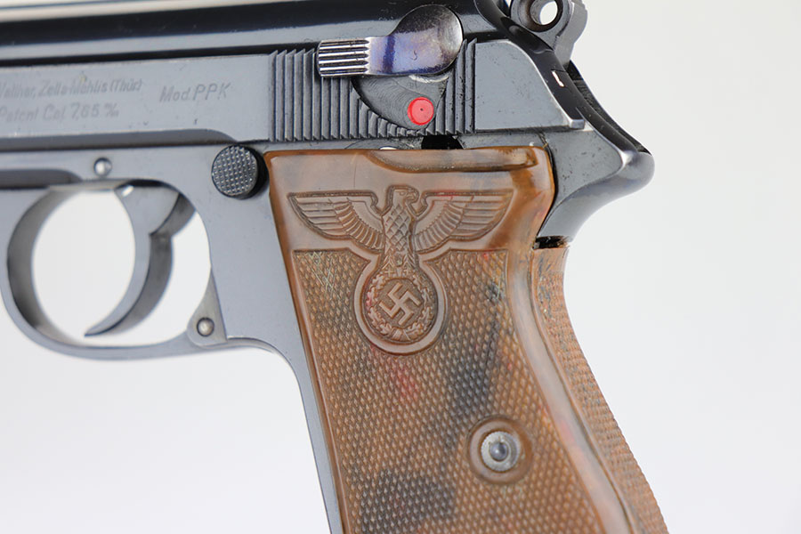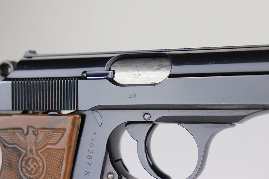 The Walther PPK with Party Leader Grips was the “Honor Weapon of the Political Leaders”. The Hoheitsabzeichen or High Insignia is the Eagle over Swastika found on either side of the grips where the Walther banner is normally located. The person entitled to wear the honor weapons that were awarded them by the Fuhrer were the Political Leaders of the national, regional and district territories, as well as leaders of local and support units. The persons who wore the honor weapon had their authorizations listed in the district personnel offices, and had to have in their possession a weapons permit issued by the police, which was obtained through official channels. These rare pistols were estimated to number around 3,500, and are widely faked, but this one is guaranteed original.