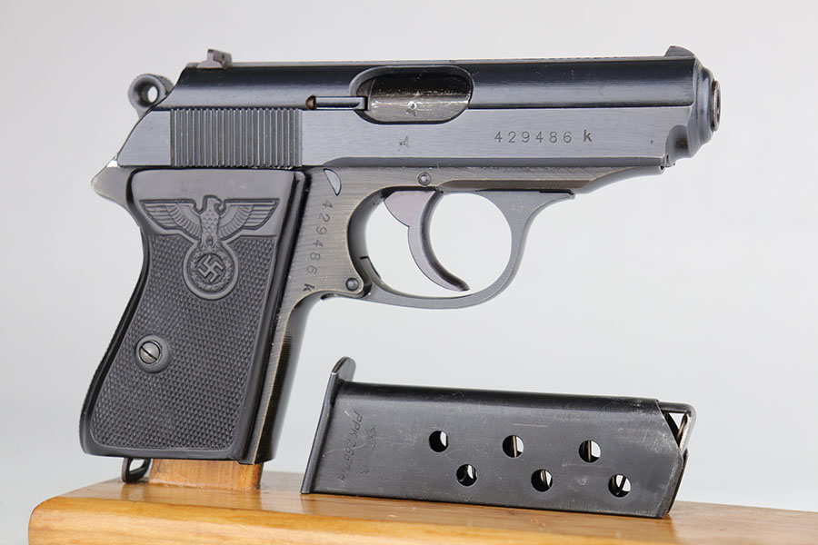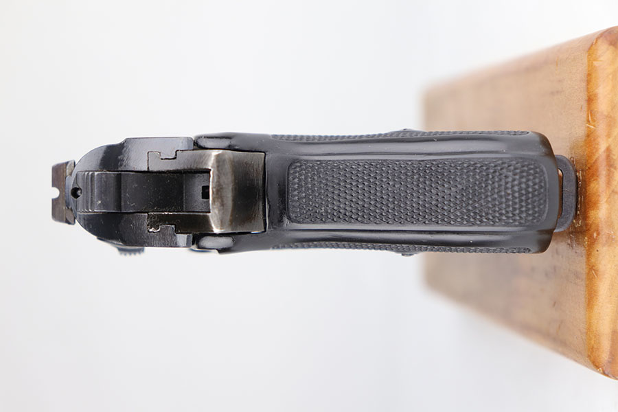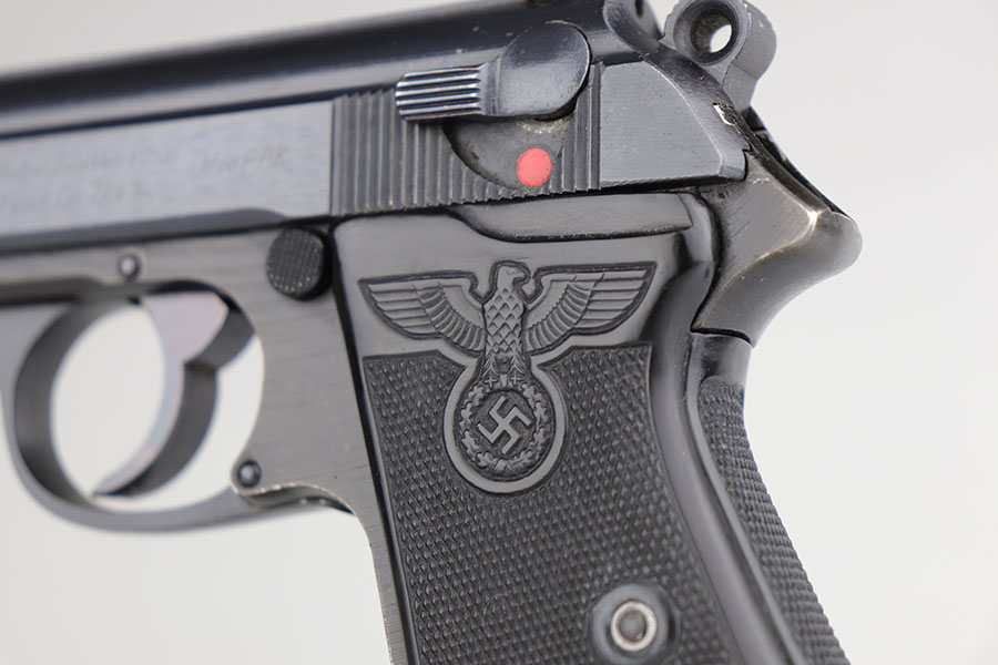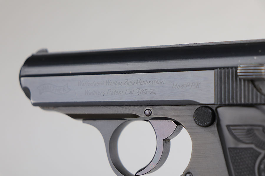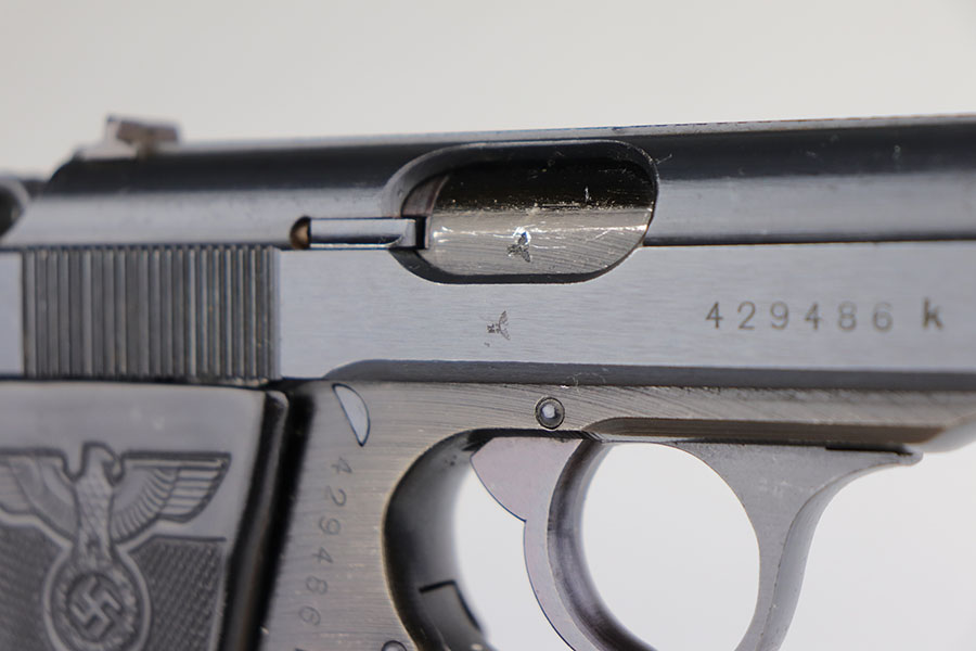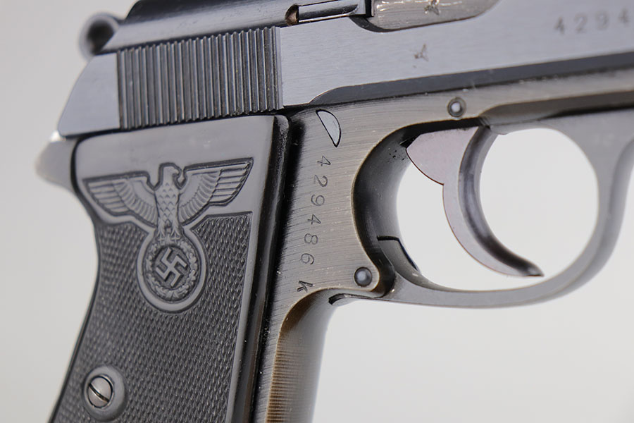 6/18/20 – This is a rare Party Leader Walther PPK with black grip, in excellent condition. We observe far less of the black grips than the brown, but research on the black grips is also less extensive and there is some debate over whether they were ever made by the Walther factory. This particular example has a duraluminum frame, and was made in 1944. The finish rates at 96-97% with a minty profile but a bit of thinning of the front strap. The grip has the proper metal insert and no cracks or defects. Just a little bit of warping to the upper corners. Mint bore.