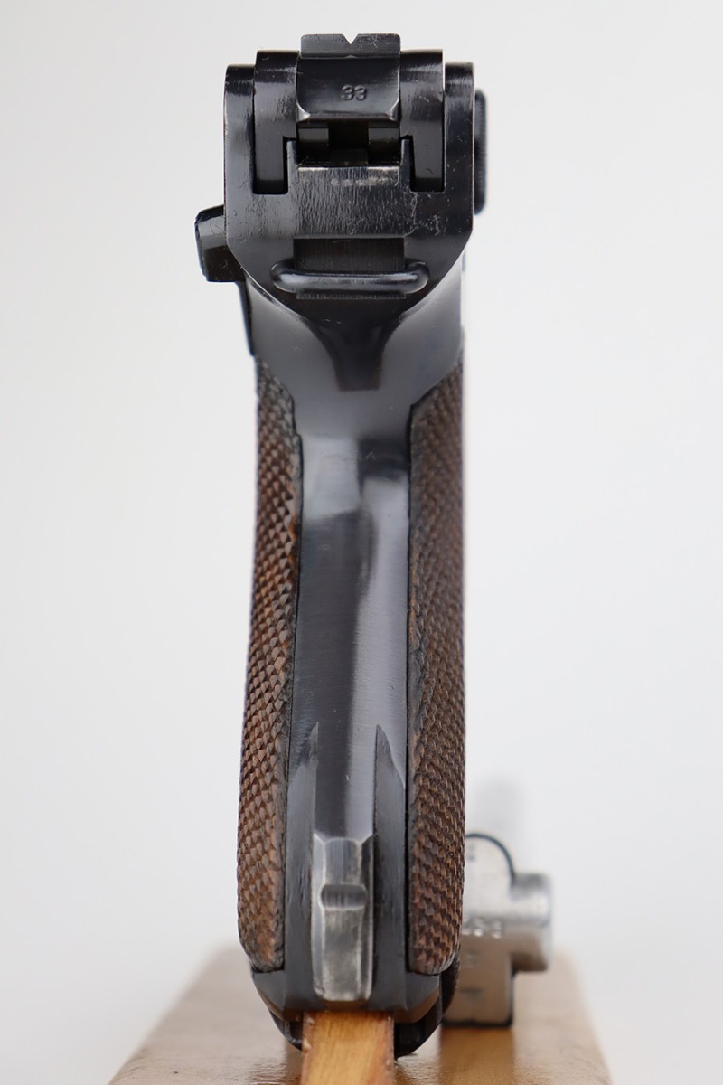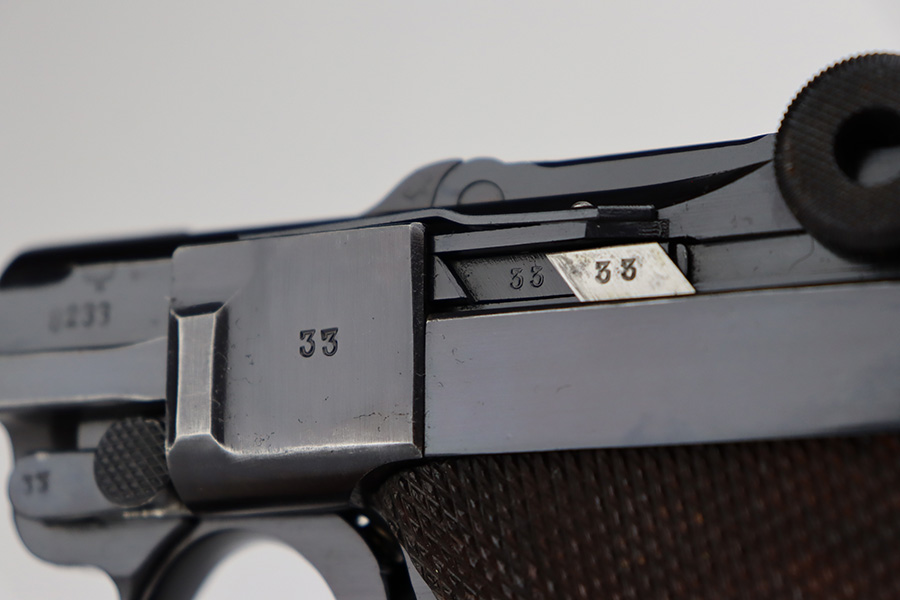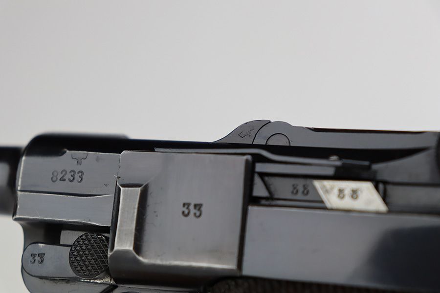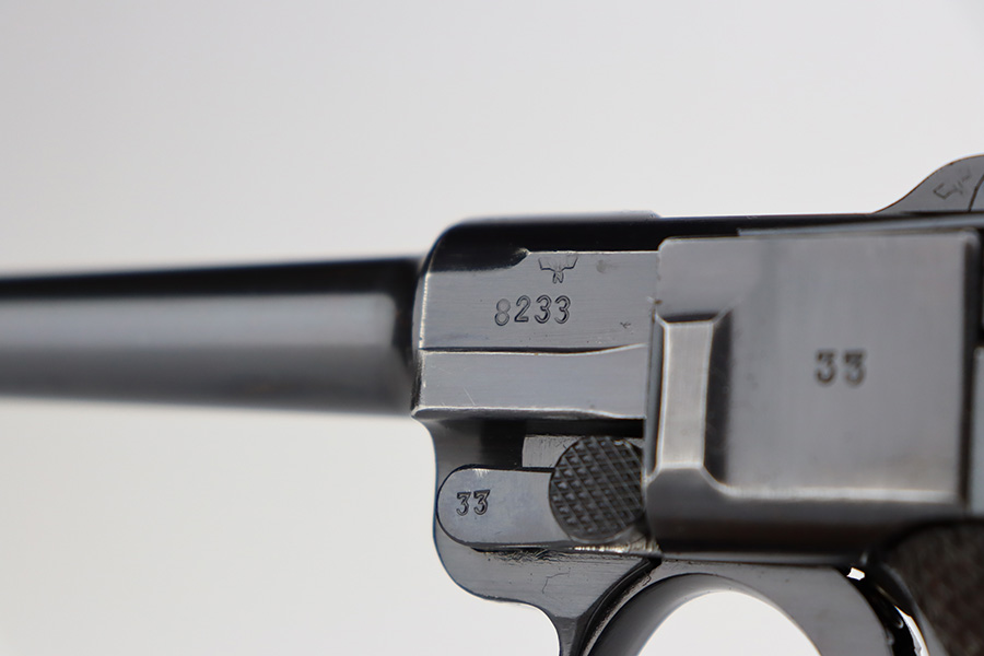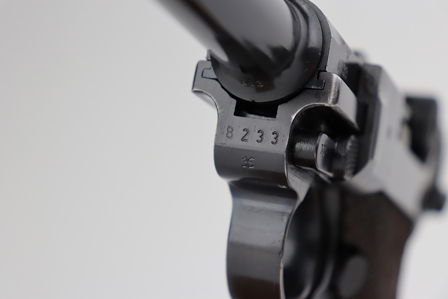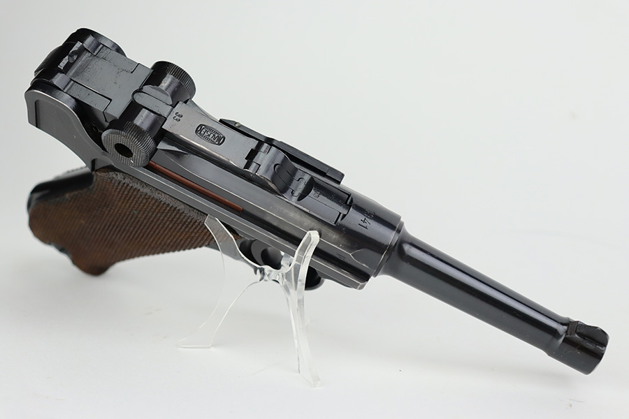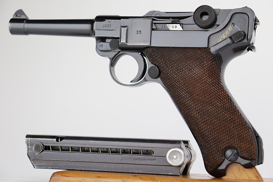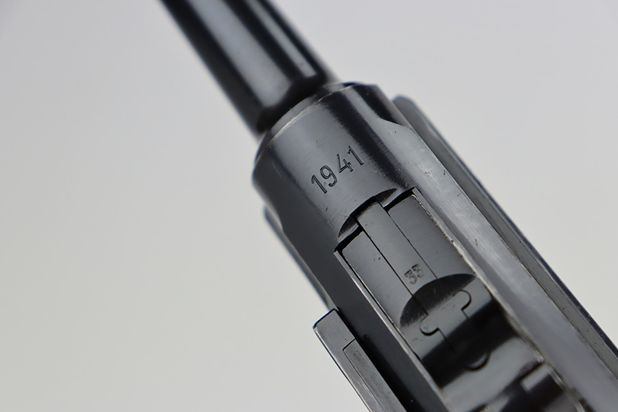7/25/23 – This is a rare police-issued Mauser Banner Luger from 1941. One of about 6,000 produced with 1941 date and Eagle/L inspector’s mark, this one comes with two matching numbered magazines. Both mags are Eagle/C stamped, but the ‘1’ mag has an overstamp in the first ‘3’ on the base. The pistol has matching numbers throughout, including the original grips. Excellent blue, with most of the finish loss found on the right side of the receiver. Minor additional wear on sideplate and muzzle. Minty bore. Excellent grips with no chips.