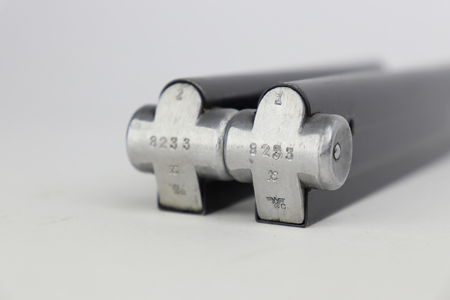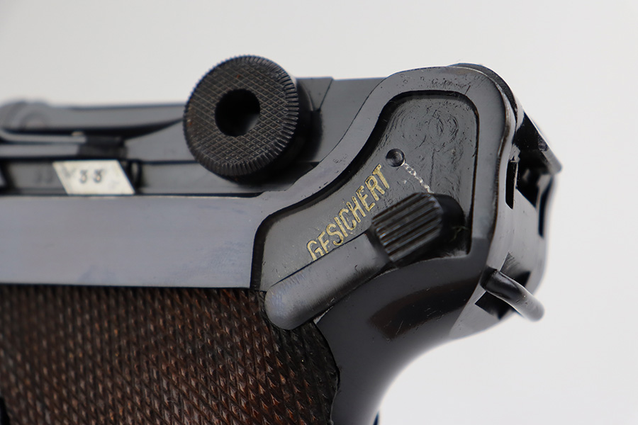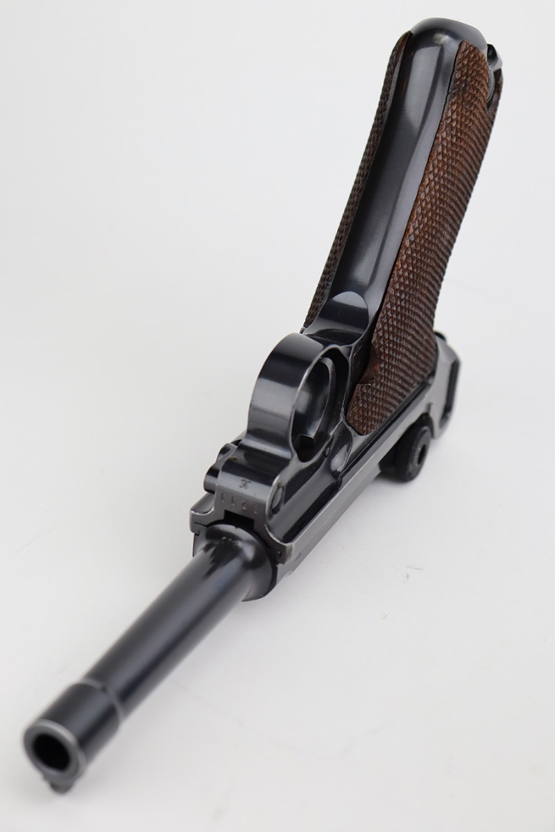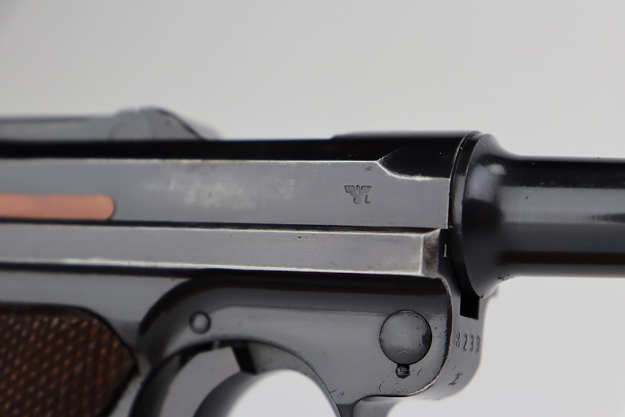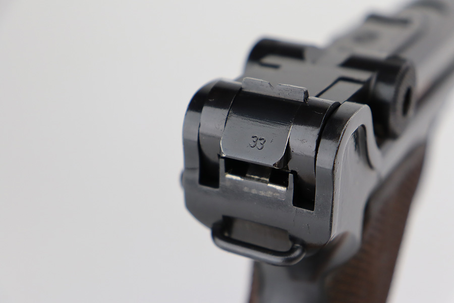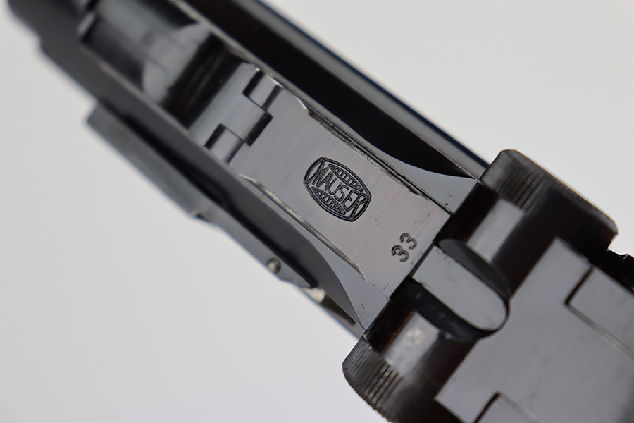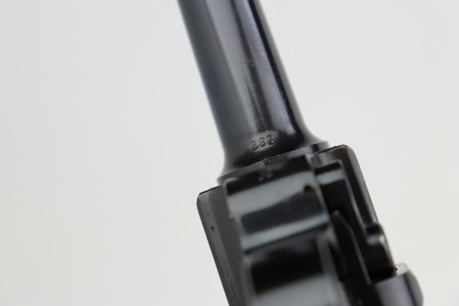 7/25/23 – This is a rare police-issued Mauser Banner Luger from 1941. One of about 6,000 produced with 1941 date and Eagle/L inspector’s mark, this one comes with two matching numbered magazines. Both mags are Eagle/C stamped, but the ‘1’ mag has an overstamp in the first ‘3’ on the base. The pistol has matching numbers throughout, including the original grips. Excellent blue, with most of the finish loss found on the right side of the receiver. Minor additional wear on sideplate and muzzle. Minty bore. Excellent grips with no chips.