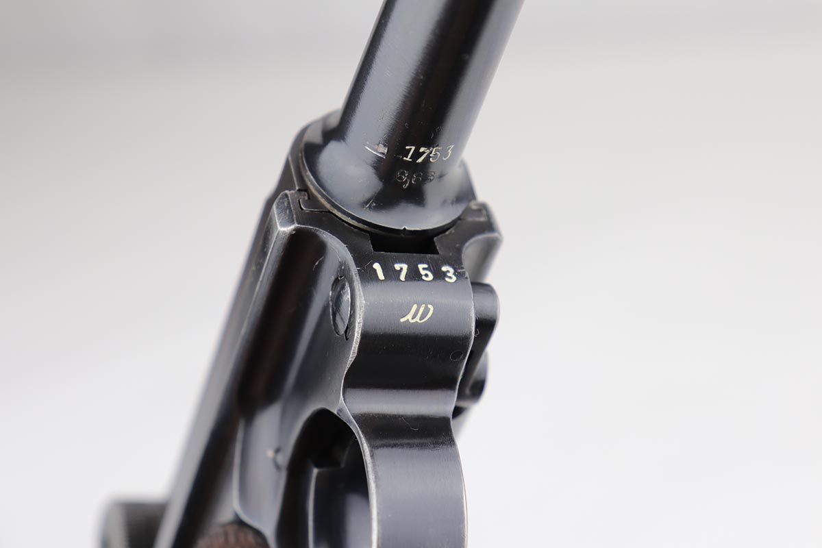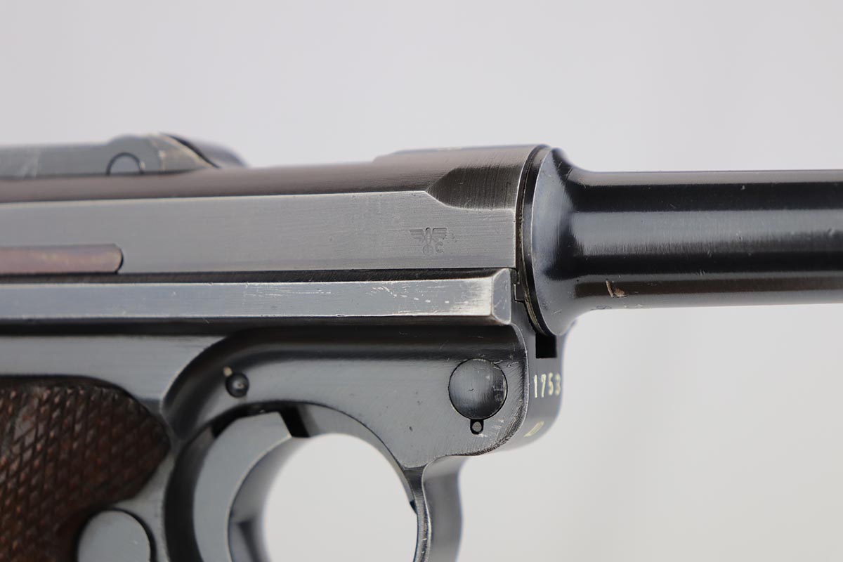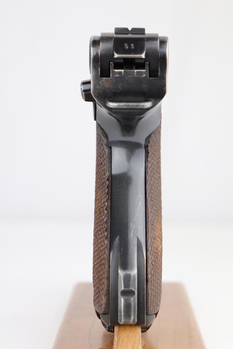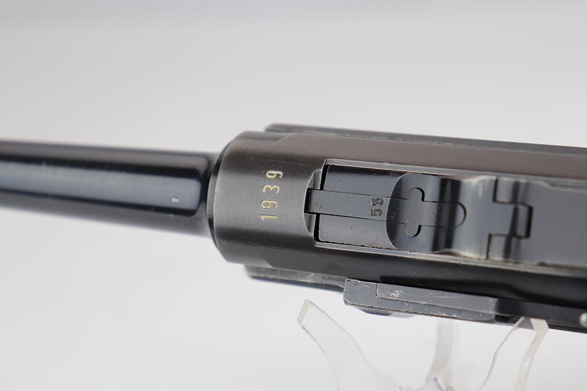 8/27/19 – This is a fantastic example of a rare and complete Police issued Mauser Luge rig. The receiver is marked Eagle over C, and is one of only ~2,850 produced with that marking, and only ~1,400 in 1939. The pistol is all matching and original with 95-97% original blue remaining, showing standard high edge wear on the sideplate and barrel, and some thinning on the rear strap/stock lug. The bore is strong and shiny. The grips are in excellent condition, without major defect. The right panel is matching to the pistol, and left panel is unmarked. The magazine is original and numbered to the pistol.