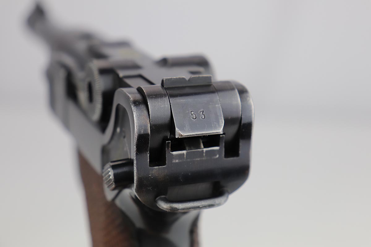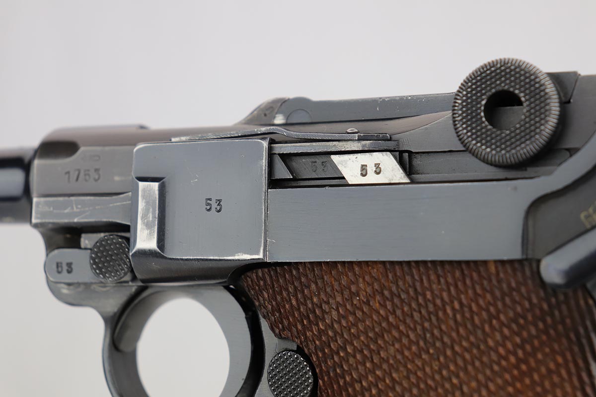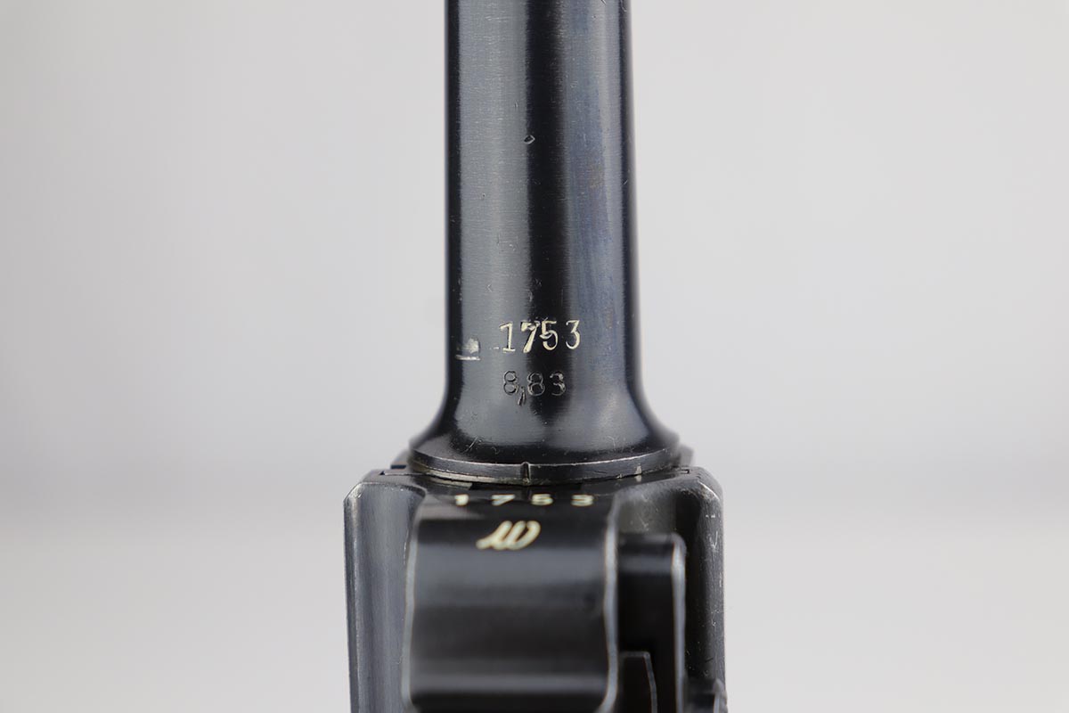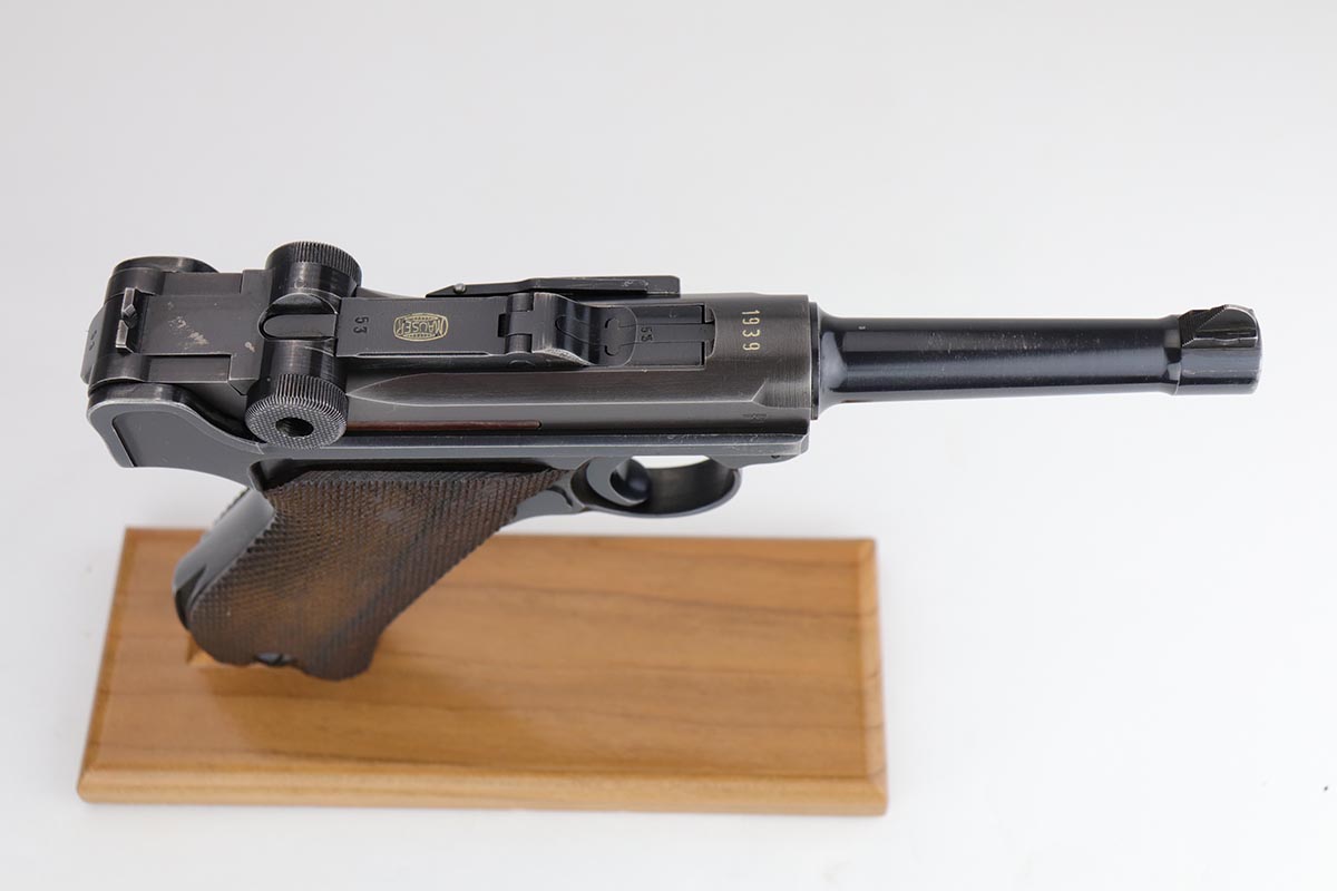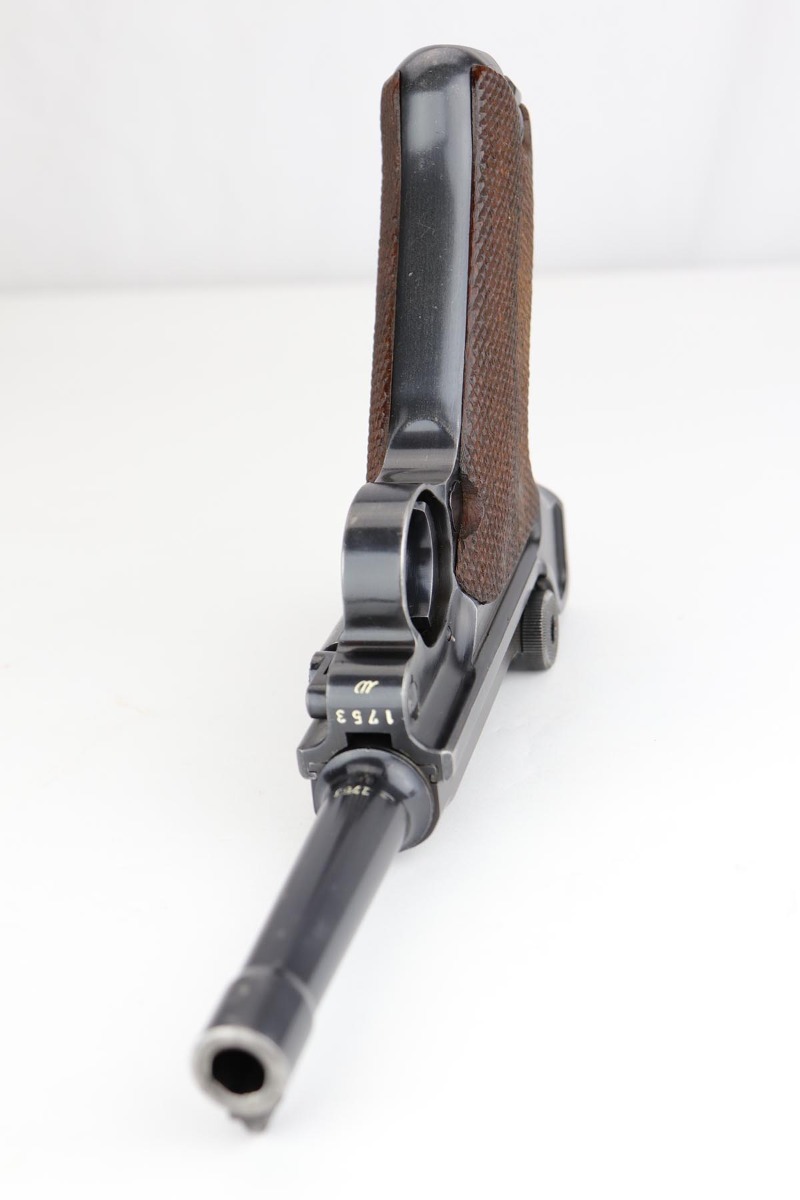 8/27/19 – This is a fantastic example of a rare and complete Police issued Mauser Luge rig. The receiver is marked Eagle over C, and is one of only ~2,850 produced with that marking, and only ~1,400 in 1939. The pistol is all matching and original with 95-97% original blue remaining, showing standard high edge wear on the sideplate and barrel, and some thinning on the rear strap/stock lug. The bore is strong and shiny. The grips are in excellent condition, without major defect. The right panel is matching to the pistol, and left panel is unmarked. The magazine is original and numbered to the pistol.