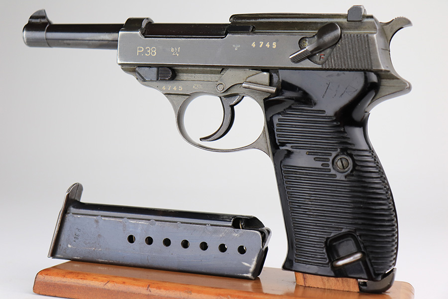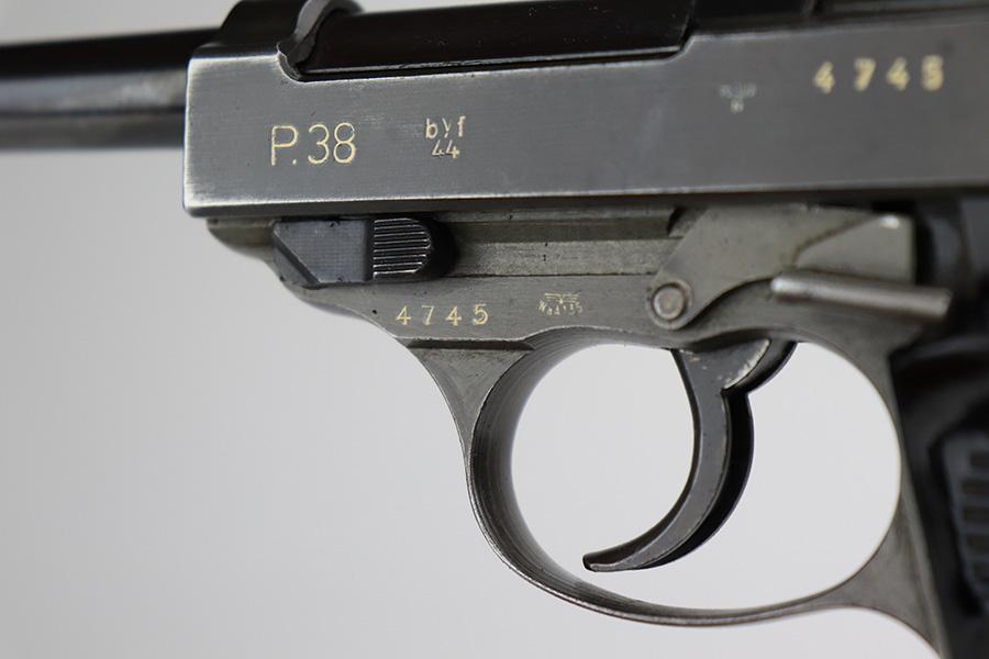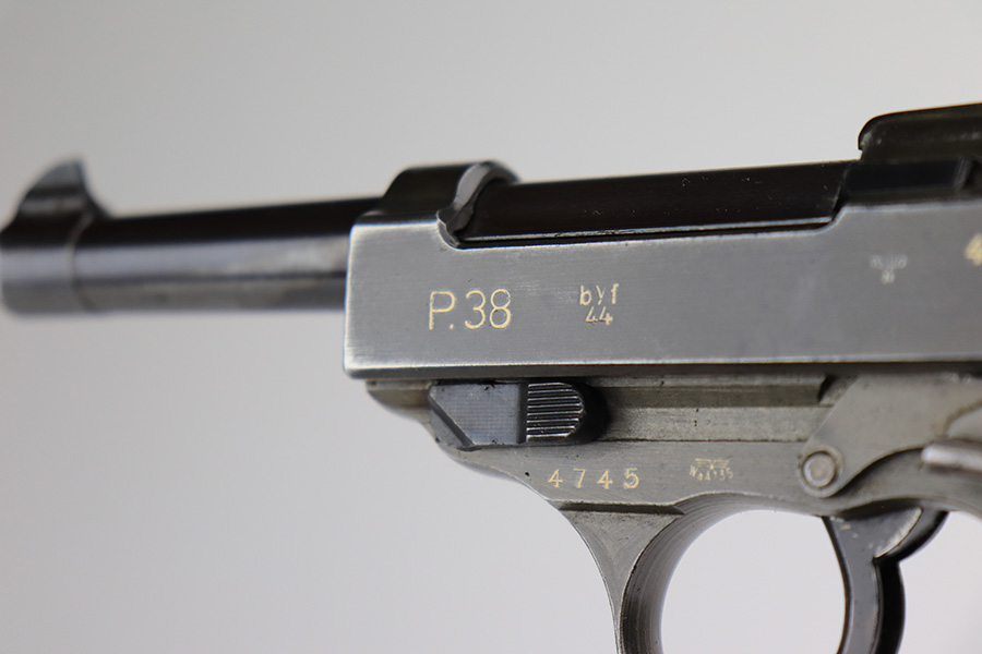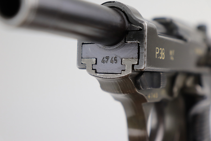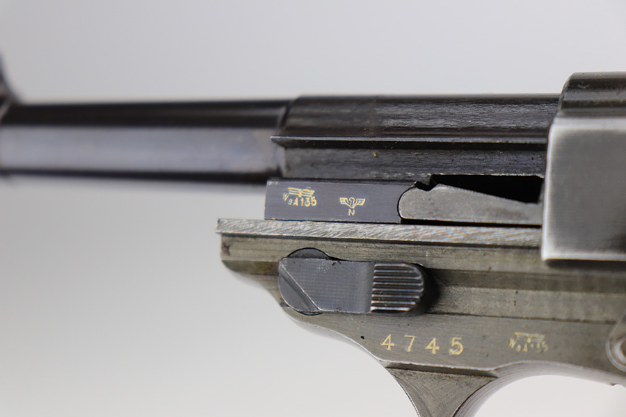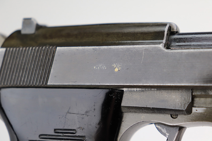 3/31/22 – This is an excellent example of a rare Mauser P.38 with Police Eagle/F acceptance mark on slide, one of only 1,500 produced. It’s all matching with 97-98% of the original finish remaining. Minor high edge wear on slide and muzzle but little to no finish loss otherwise. Phosphate finish on slide and frame, with blued barrel and takedown lever. Excellent, shiny bore. Original grips but each panel has a previous owner’s initials scratched in lightly. Magazine has faint E/135 marking.