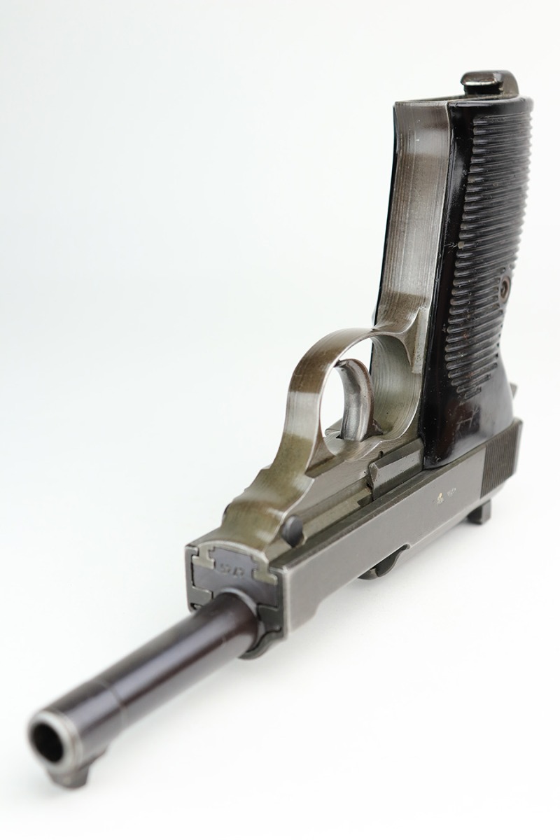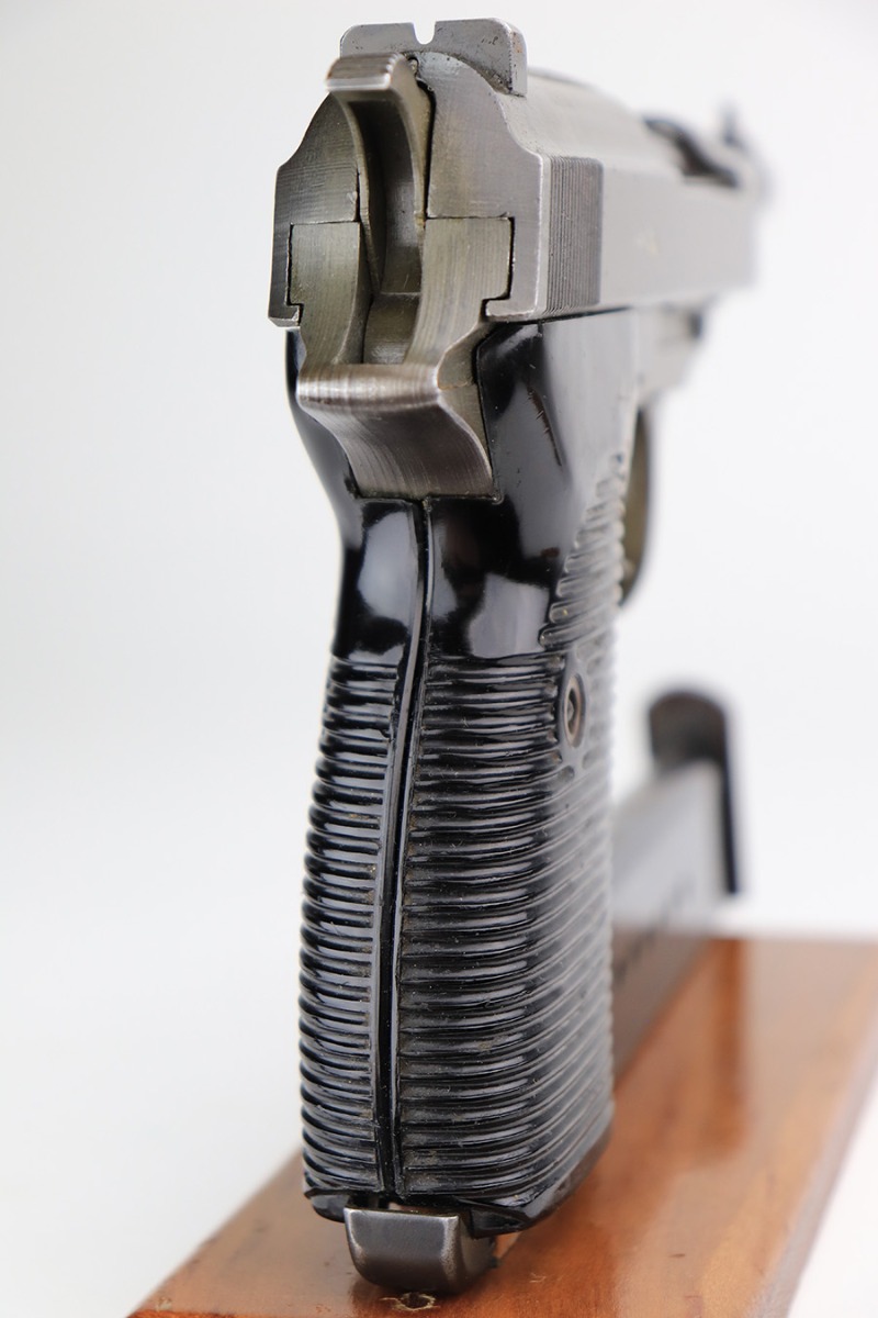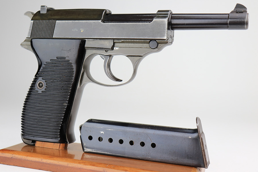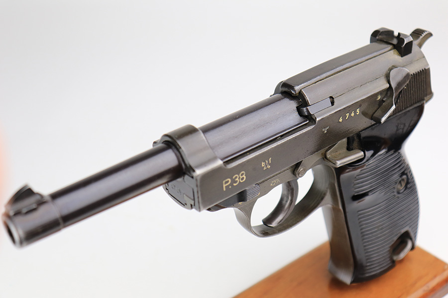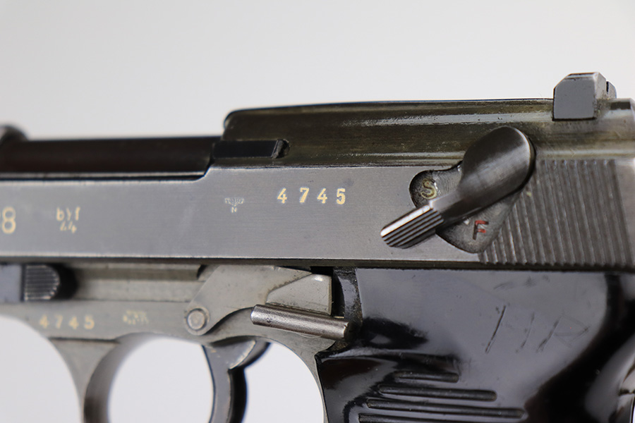 3/31/22 – This is an excellent example of a rare Mauser P.38 with Police Eagle/F acceptance mark on slide, one of only 1,500 produced. It’s all matching with 97-98% of the original finish remaining. Minor high edge wear on slide and muzzle but little to no finish loss otherwise. Phosphate finish on slide and frame, with blued barrel and takedown lever. Excellent, shiny bore. Original grips but each panel has a previous owner’s initials scratched in lightly. Magazine has faint E/135 marking.