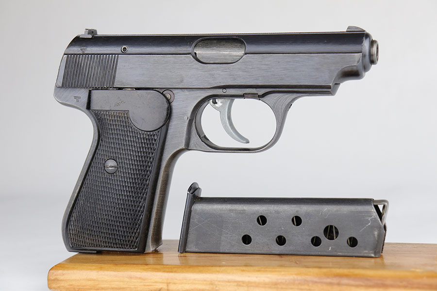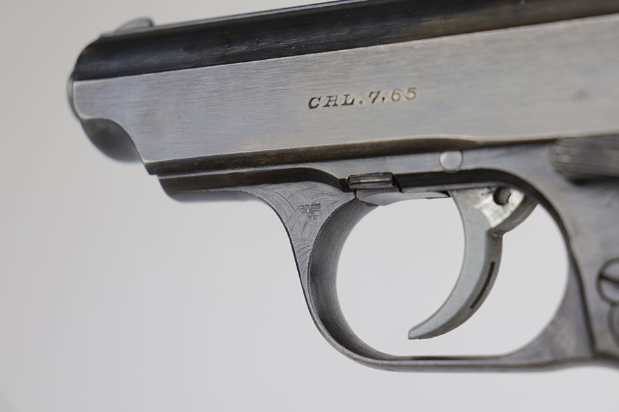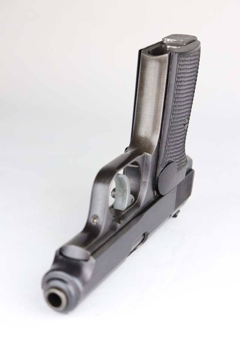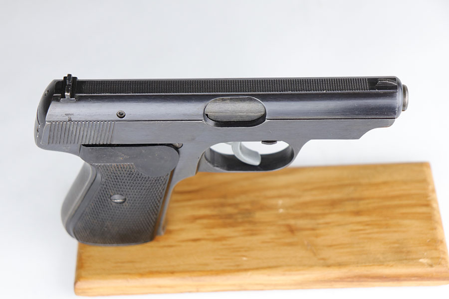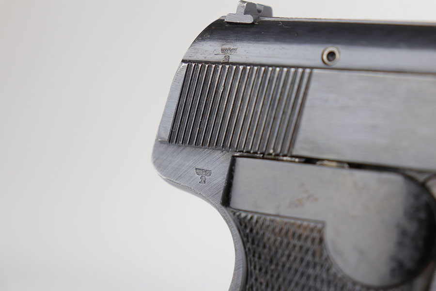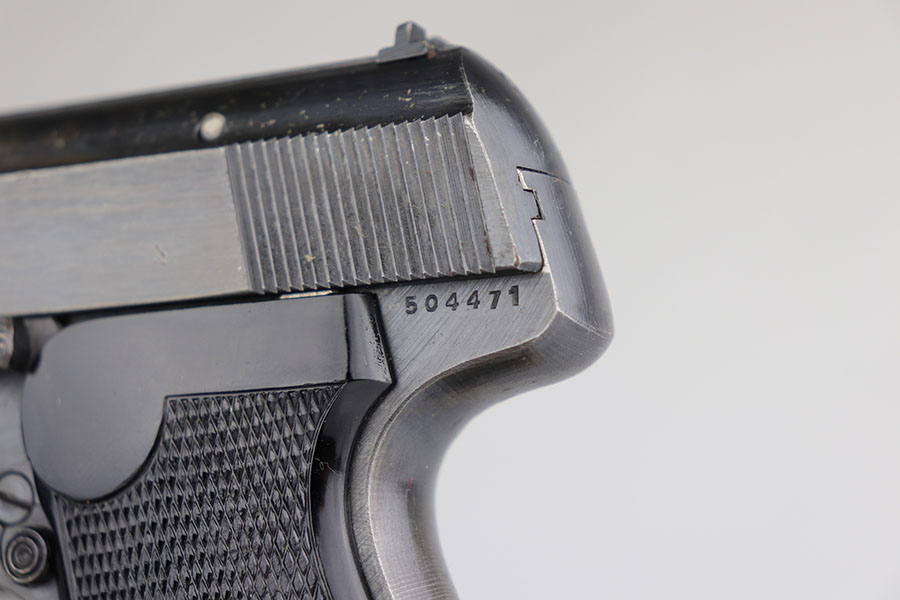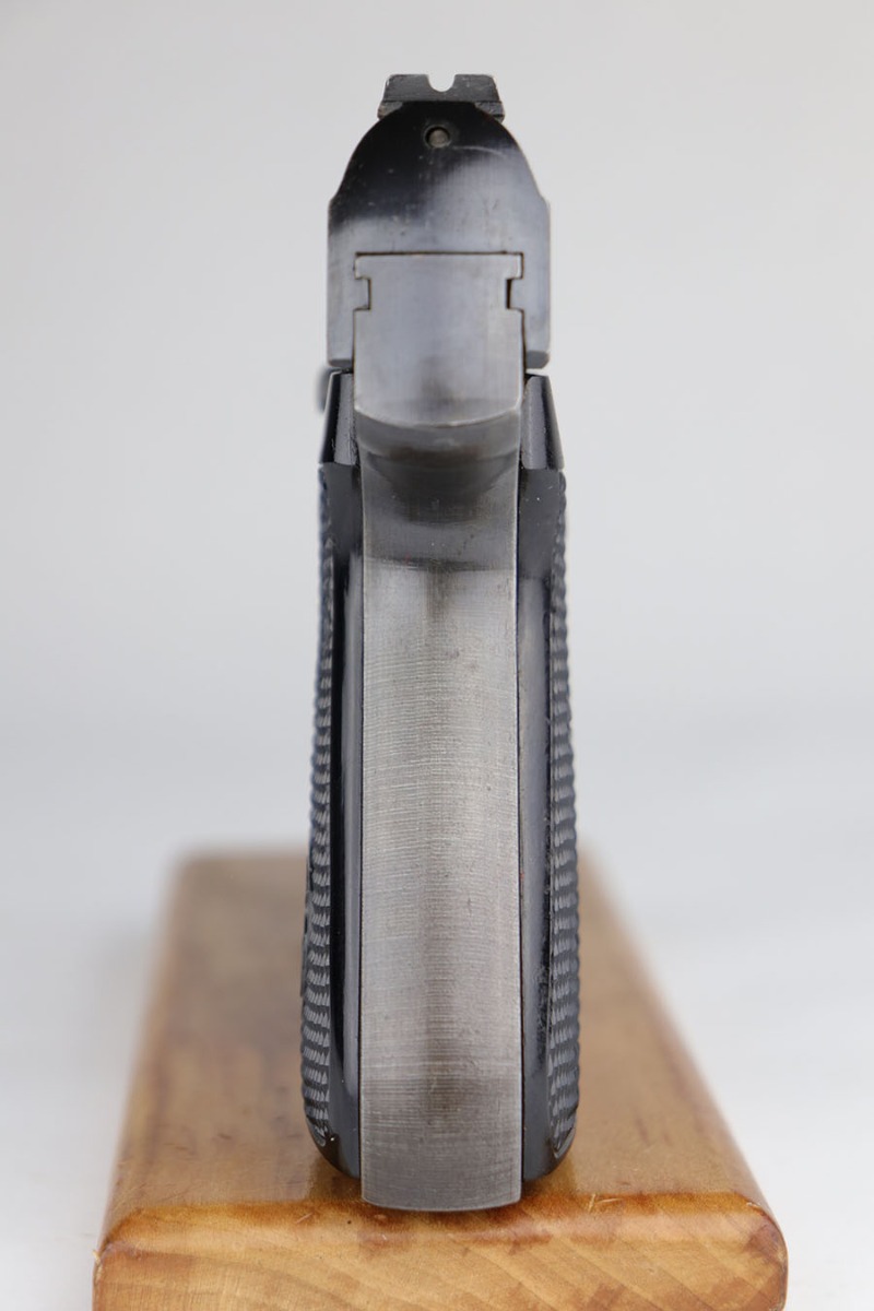 5/12/20 – This is an excellent example of a rare Police Sauer 38h. It’s one of only 7,500 produced with Eagle over F marking on frame, which makes it the most rare Police Sauer 38h variation. The finish is a little tough to rate as it has very little actual bluing loss, but some notable browning of the straps. Excellent grips and half moon magazine. Mint bore.