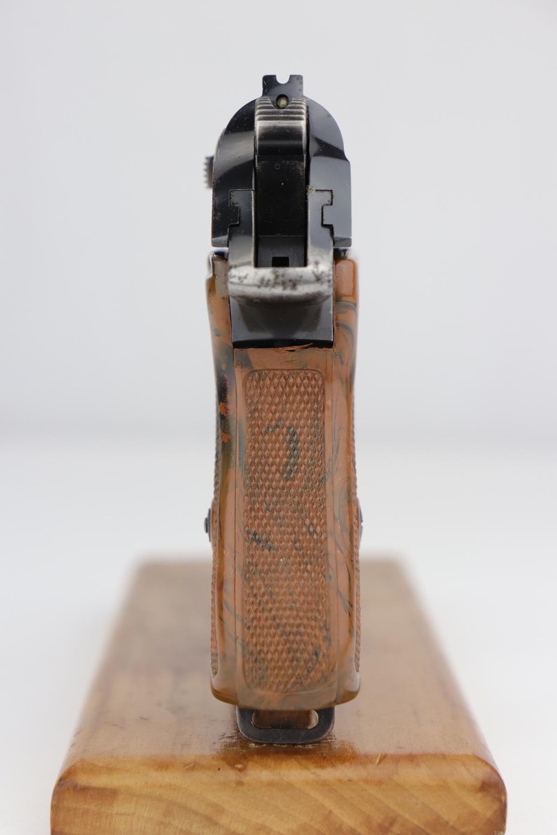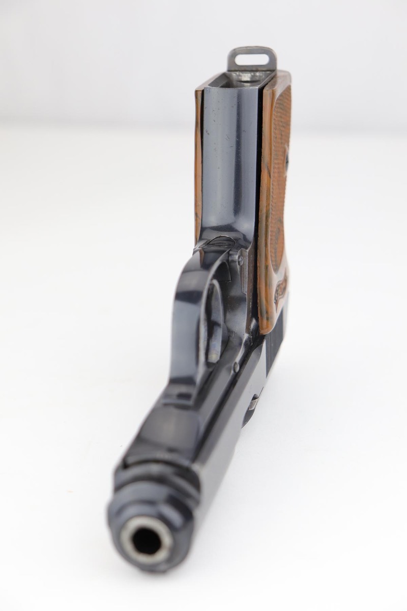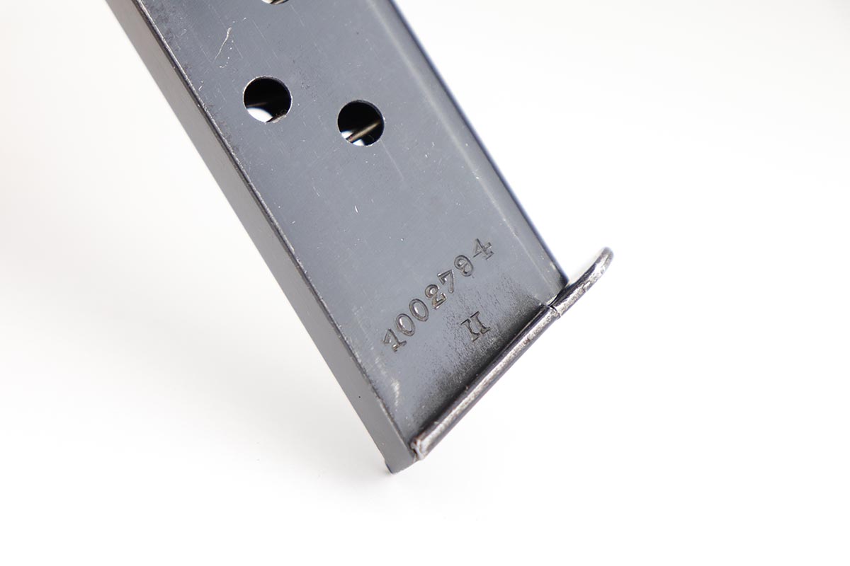 9/18/19 – This is a very rare Police Walther PPK with million series serial number. In 1939, serial numbers began rolling over into seven digits until the Germans changed their mind and went back to six digits with a K-suffix. There were only about 7,000 such serials used, and only about 1,000 of them were Police marked and issued like this one. This pistol has about 95% of the original blue with muzzle wear on both sides, and an area of finish loss near the ejection port. The pistol has a correct, rare magazine with Police-style numbering on the body and a million serial number, though it is mismatched to this pistol. Bore is mint, and grip is in good shape aside from crack on the left side.