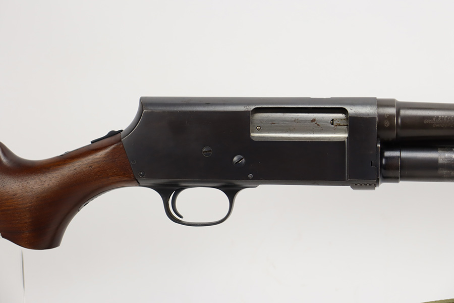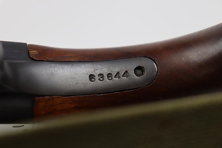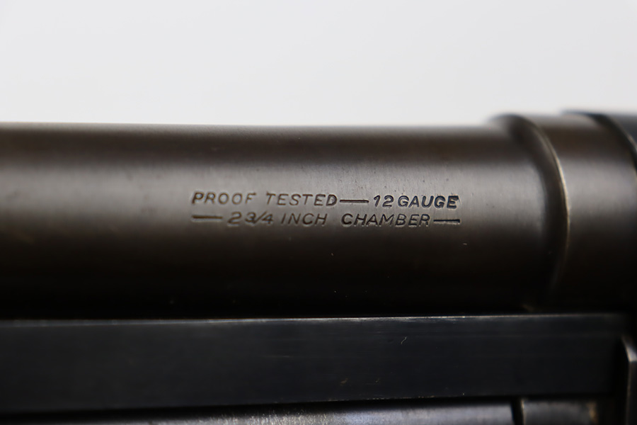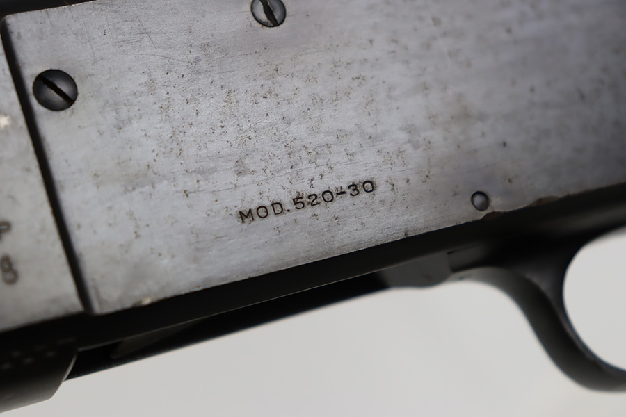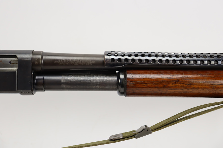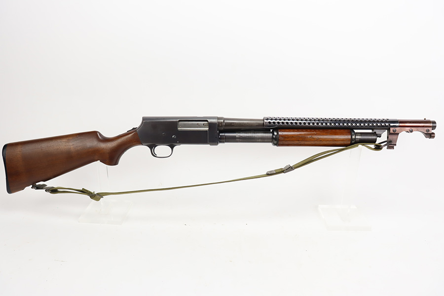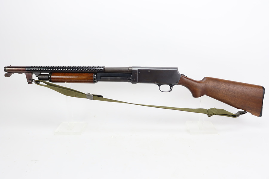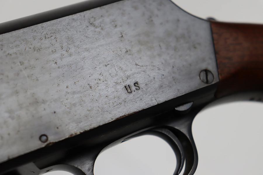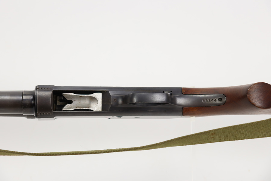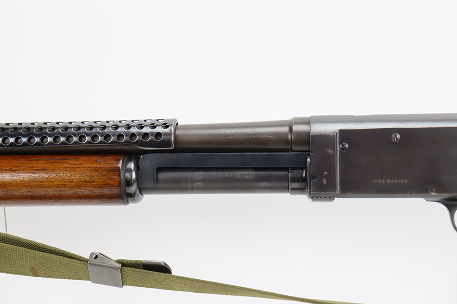 8/31/23 – A martial variant of a John Browning designed sport gun, the 520 Trench Gun was originally developed in response to a World War I request for new fighting shotguns for the American Expeditionary Force. It made a strong impression on the evaluators but did not make it into the field before the armistice was signed. Seeing potential for the gun on the police market, Stevens kept production going to 1932, and at the outbreak of World War II, the U.S. government bought every 520 that was still in the warehouse. There were ~33,000 Stevens 520-30s produced for the war, with a mix of trench guns, riot guns and long-barreled training guns among those 33,000. This one is marked with the ‘U.S.’ military proof and flaming bomb. It’s an excellent example with only minor thinning/dulling on the receiver, and a little bit finish loss on the bayo band and heat shield. Excellent wood with no major defects. High-polished 6-row heat shield and a correct, unmarked plum color bayonet lug. Strong bore with minor signs of use. Comes with period canvas sling. Smooth action.