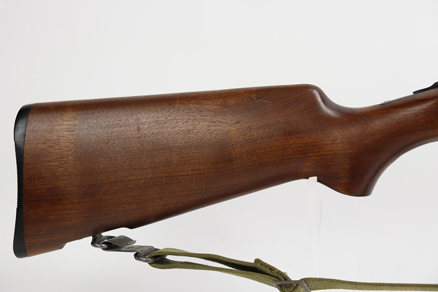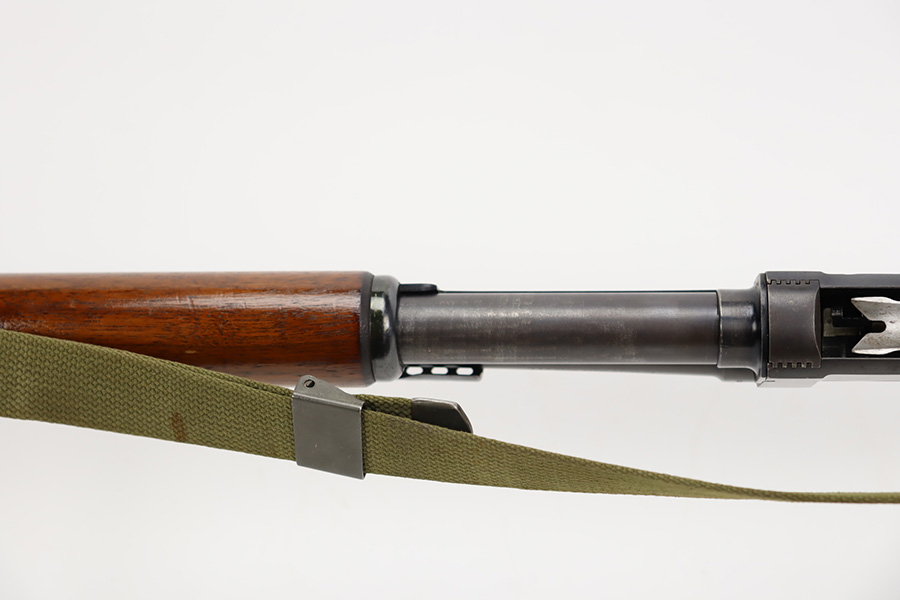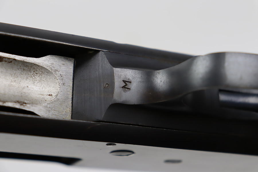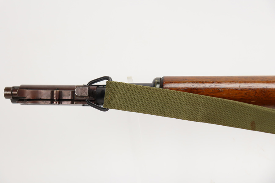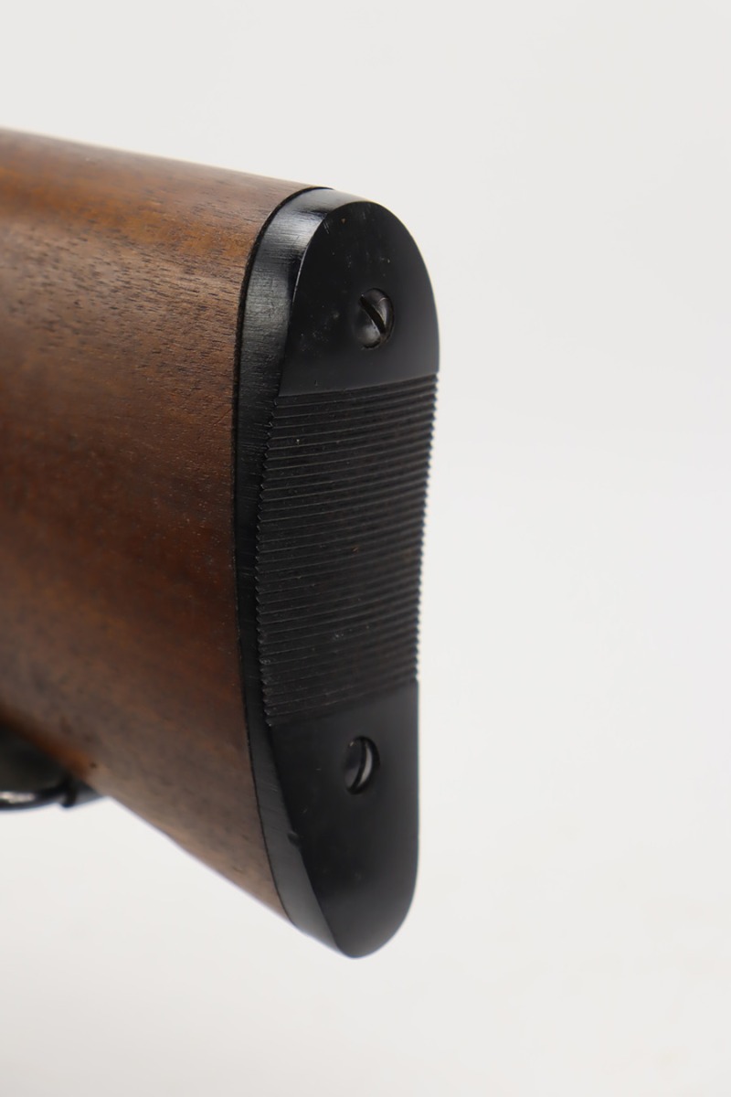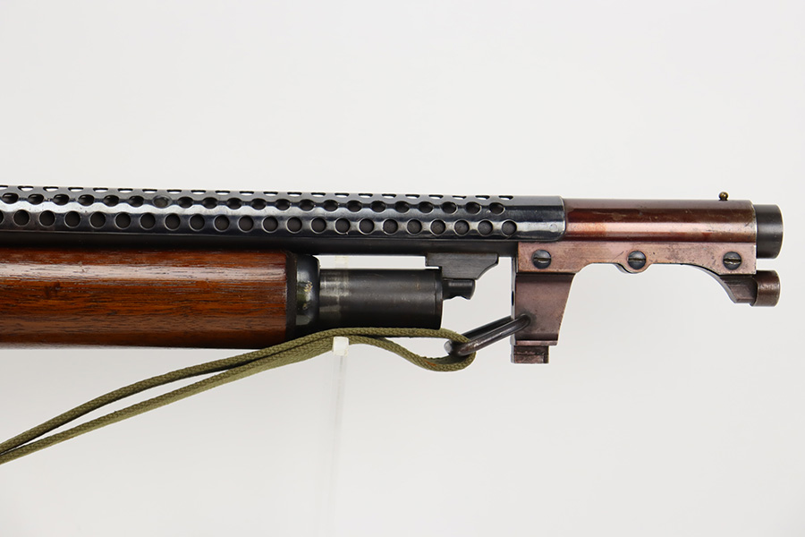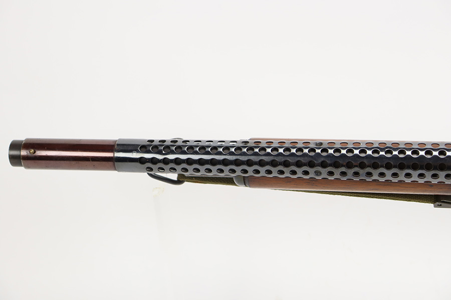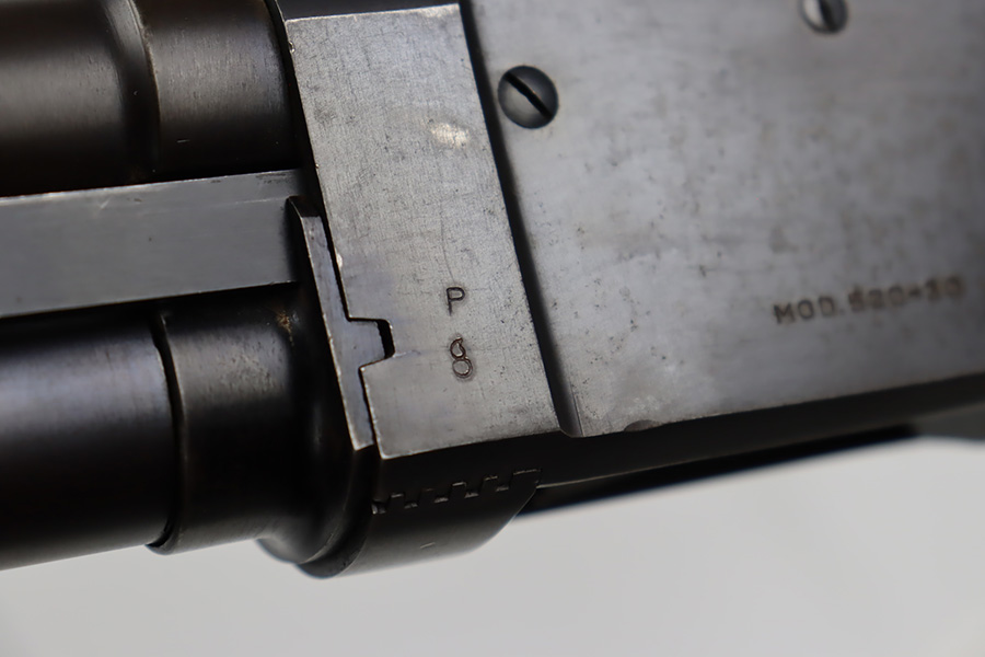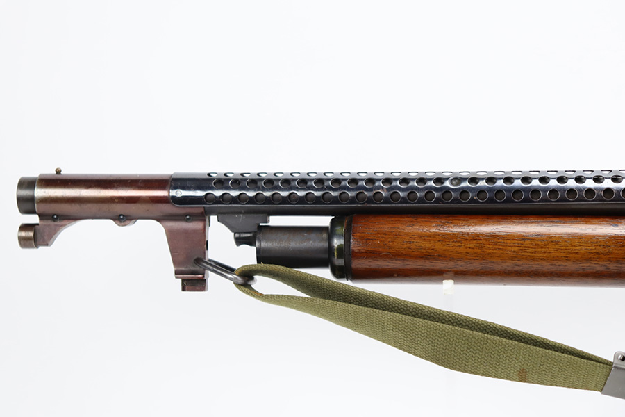 8/31/23 – A martial variant of a John Browning designed sport gun, the 520 Trench Gun was originally developed in response to a World War I request for new fighting shotguns for the American Expeditionary Force. It made a strong impression on the evaluators but did not make it into the field before the armistice was signed. Seeing potential for the gun on the police market, Stevens kept production going to 1932, and at the outbreak of World War II, the U.S. government bought every 520 that was still in the warehouse. There were ~33,000 Stevens 520-30s produced for the war, with a mix of trench guns, riot guns and long-barreled training guns among those 33,000. This one is marked with the ‘U.S.’ military proof and flaming bomb. It’s an excellent example with only minor thinning/dulling on the receiver, and a little bit finish loss on the bayo band and heat shield. Excellent wood with no major defects. High-polished 6-row heat shield and a correct, unmarked plum color bayonet lug. Strong bore with minor signs of use. Comes with period canvas sling. Smooth action.