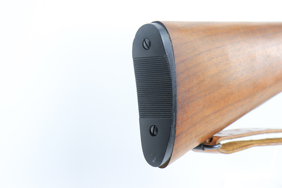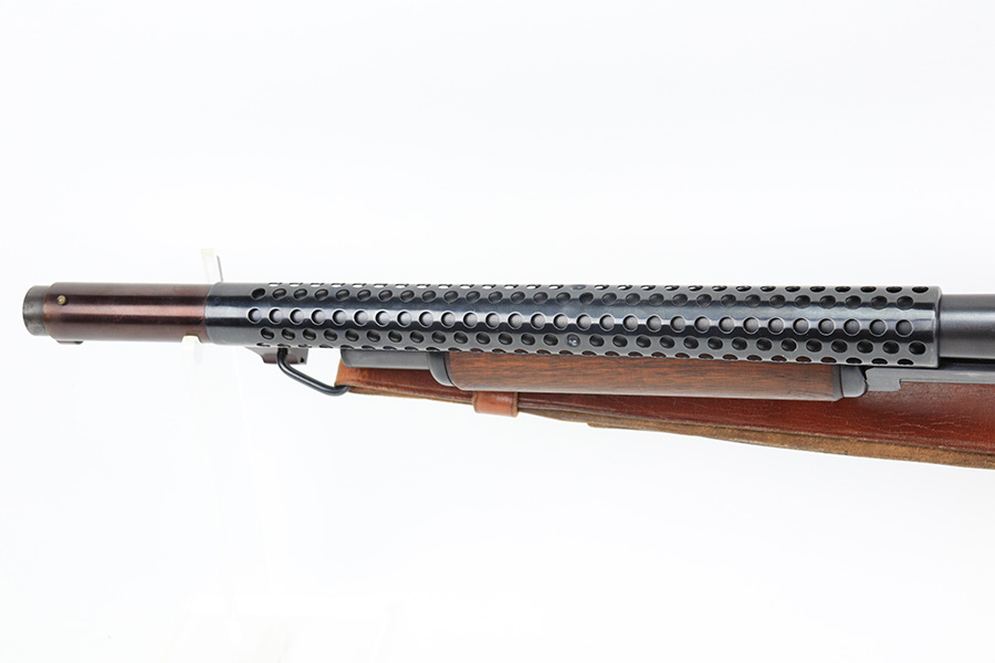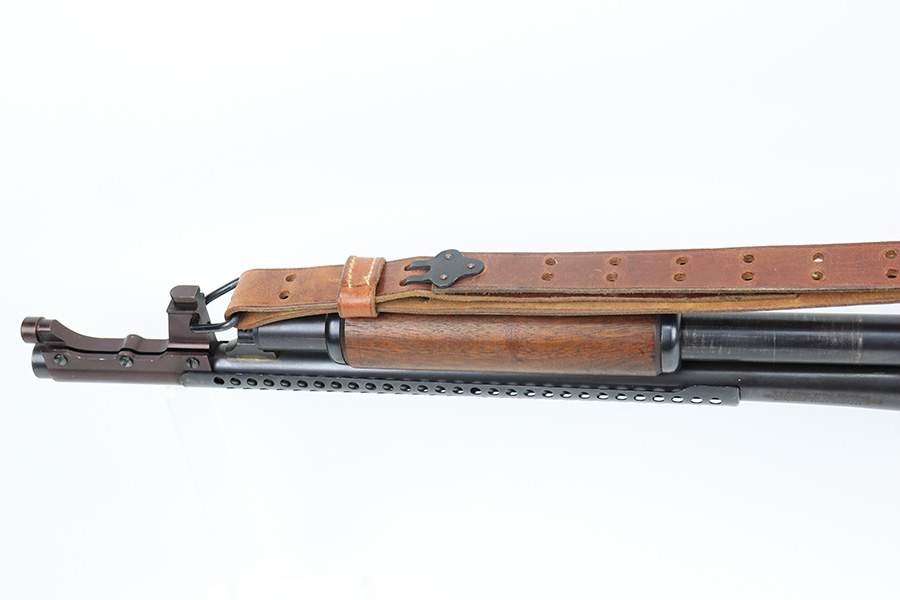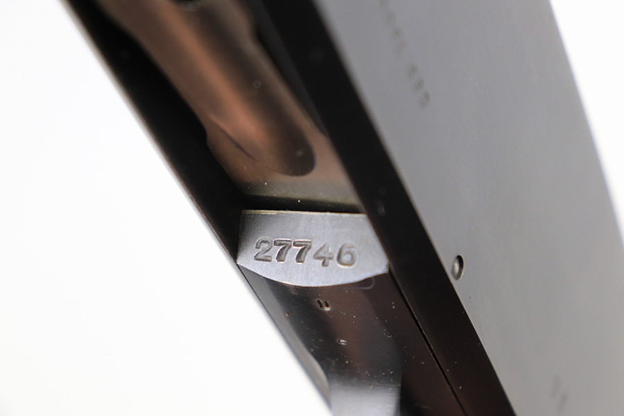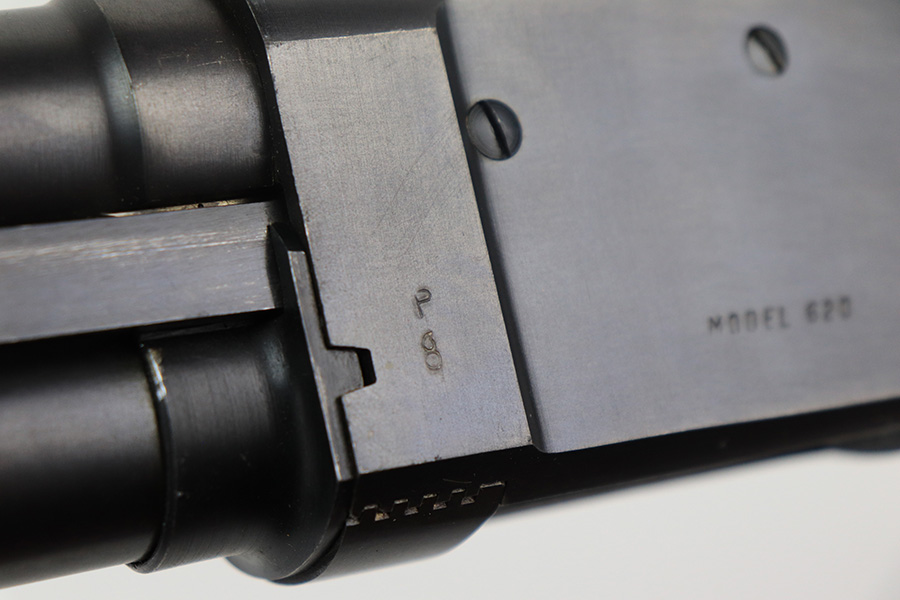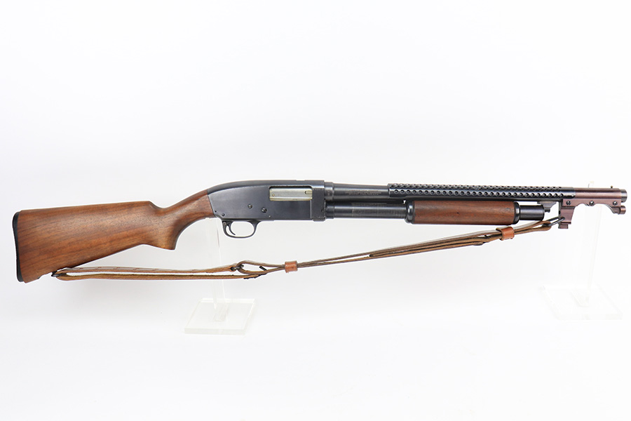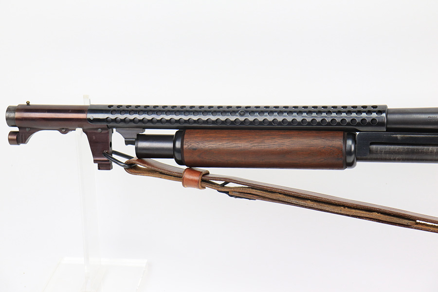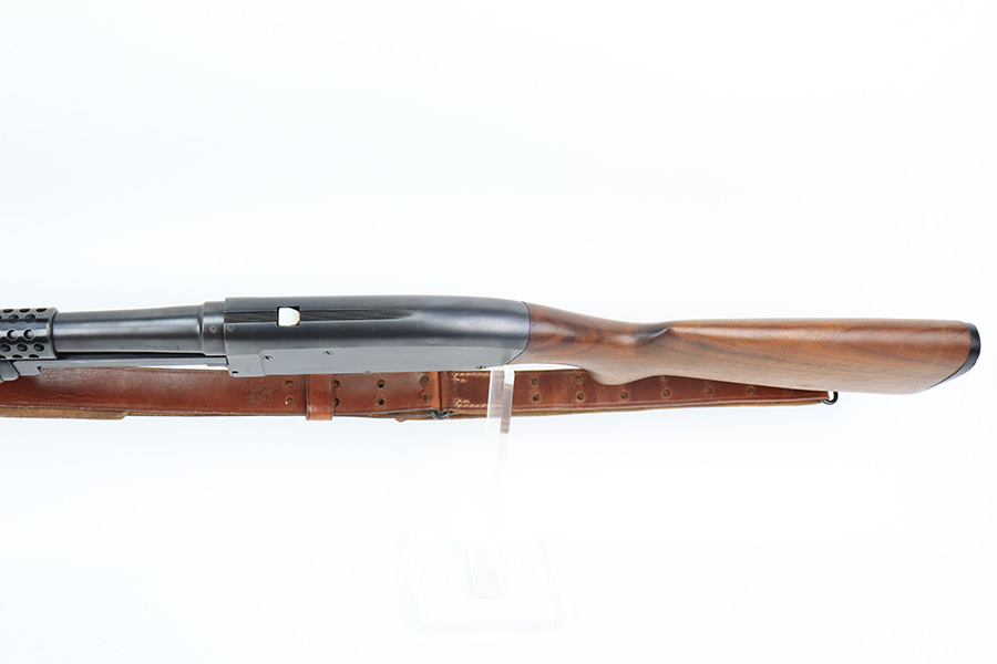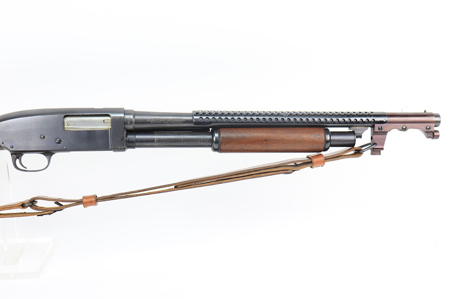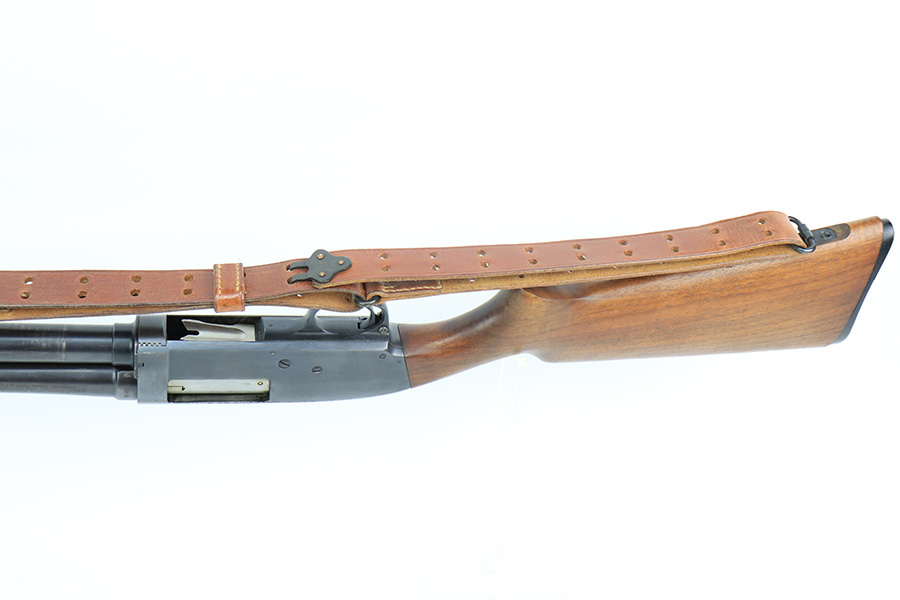 11/6/23 – This is a very rarely encountered Stevens Savage Model 620 trench shotgun, made as a part of US military procurement during WWII. Unlike its M520 counterpart, this was a hammerless model, very much like Winchester M12. It was produced in trench configuration in limited numbers and is very difficult for a collector to acquire. This particular gun is a textbook example, with all the correct military markings, original finish and all original parts including the bayonet lug and heat shield. Canfield reports that fewer than 10,000 military trench examples were ordered during WW2. This particular example is in fantastic condition with very little wear overall. Terrific bore and smooth action. Receiver and barrel both have the flaming bomb proofs, and the receiver is ‘U.S.’ marked. Buttplate was possibly replaced as the fit is not exact to the shape of the buttstock. The wood parts are in great shape with minor handling wear. Comes with a terrific leather sling that is CC marked and 1942 dated.