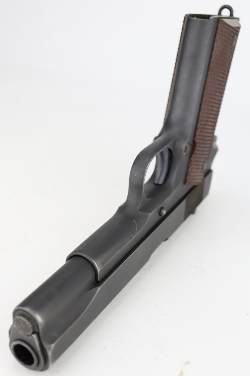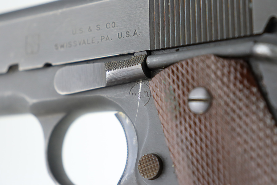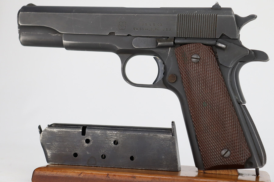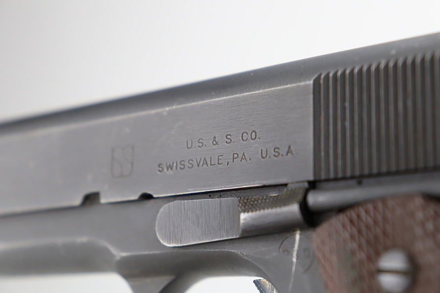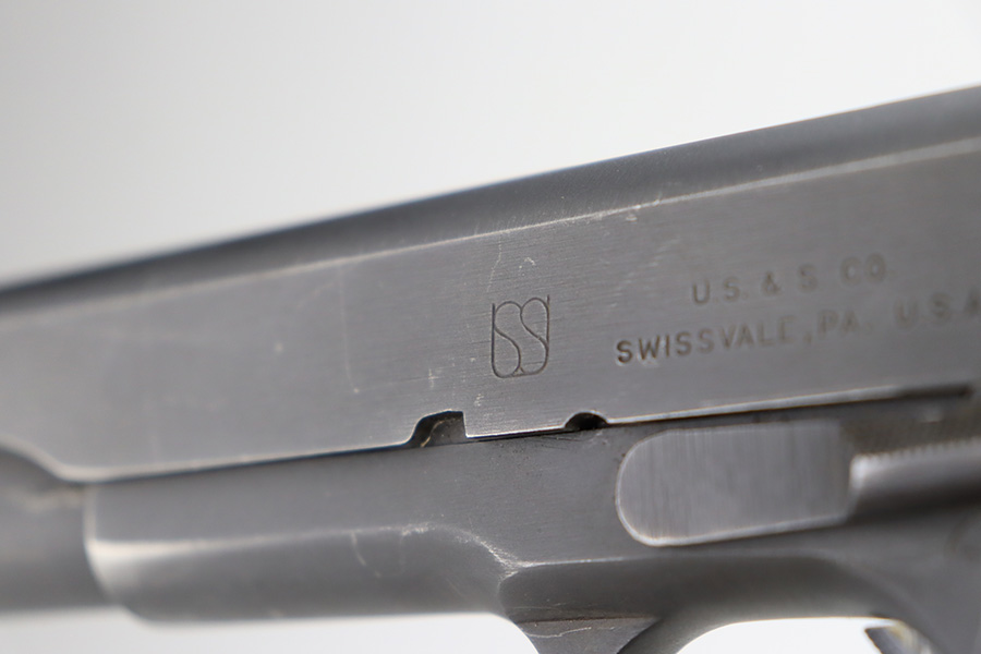 12/27/23 – This is an excellent, all-correct example of a rare Union Switch & Signal 1911A1 issued to the US military in 1943. The US&S 1911a1 pistols are one of the most sought after collectibles from WW2. This one has retained about 96% of its original finish with just very minor high edge wear and some very light surface scuffs here and there. Proper High Standard barrel. Correct bushing with concentric circles. Excellent plastic grips. Comes with one proper magazine. Minty bore. The Union Switch & Signal company of Swissvale Pennsylvania, primarily made railroad signaling equipment but received a contract on May 5, 1942 for the manufacture of M1911A1 pistols. The first pistols were accepted by Ordnance inspectors in January 1943, but the company received word that their contract would be canceled. Within a month U.S.&S. had signed a contract to supply carbine parts. On March 8, 1943 the company was officially notified that their contract had been cut back from 200,000 pistols to 30,000 pistols. However on June 26th, when the contract was nearly complete, and many of the workers had been transferred to Carbine operations, the company received a letter of intent to purchase an additional 25,000 pistols. The last of the pistols was shipped on November 27, 1943. 55,000 Union Switch and Signal pistols were delivered serial numbered from 1041405 to 1096404. U.S.&S. pistols are the second rarest of the M1911A1s (55,000 produced), only the Singer is rarer (500 produced). None of the Union Switch & Signal 1911A1s have the crossed cannons ordnance stamp.