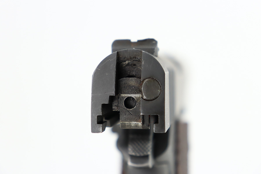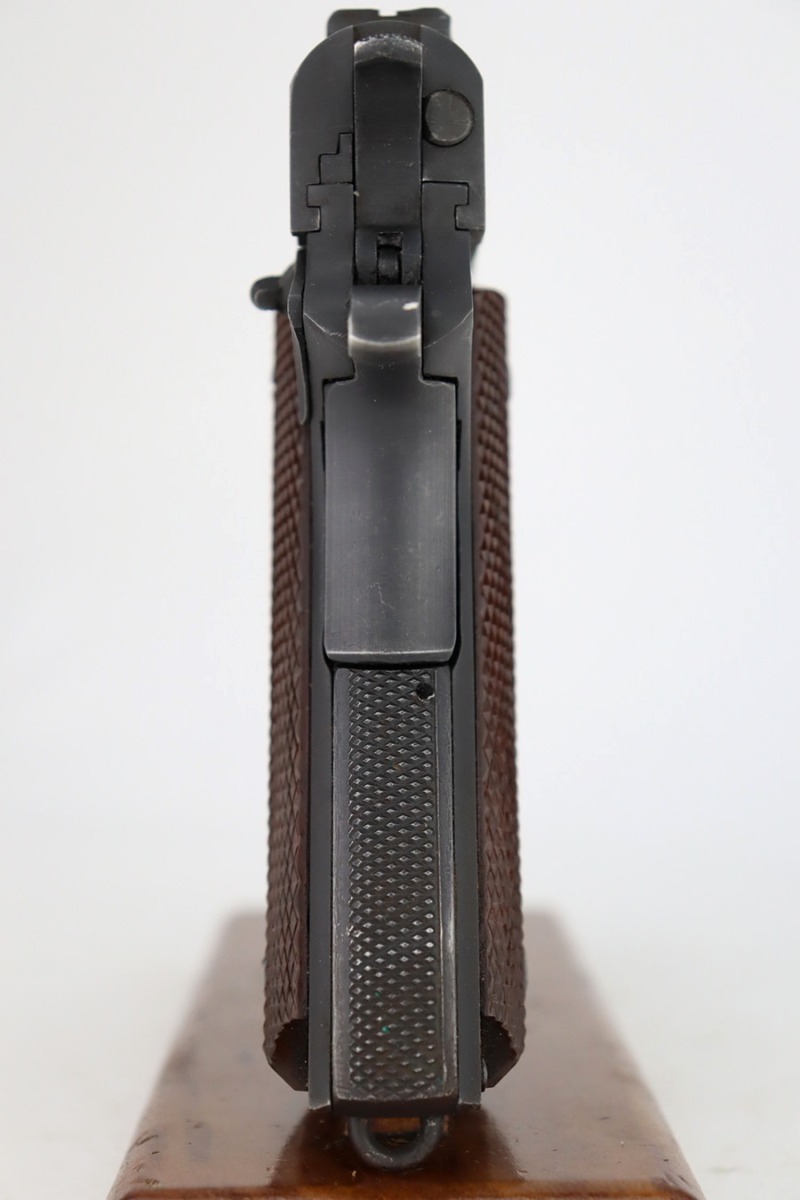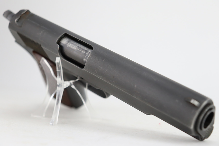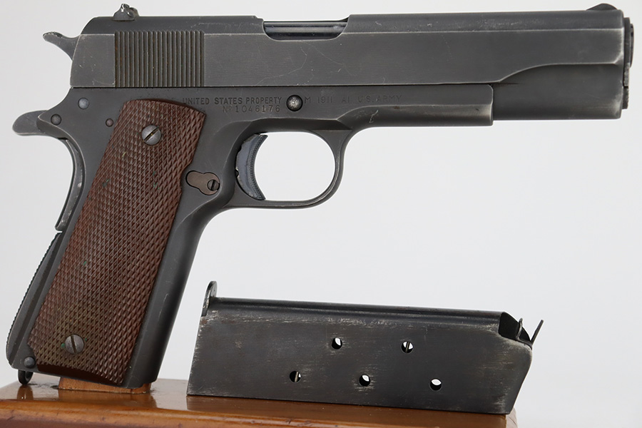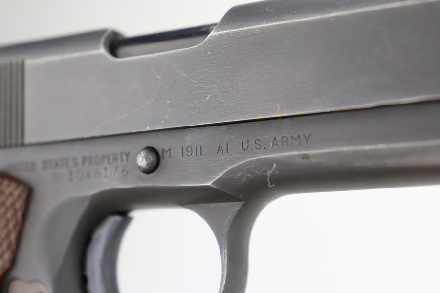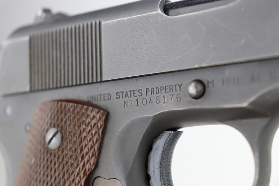 12/27/23 – This is an excellent, all-correct example of a rare Union Switch & Signal 1911A1 issued to the US military in 1943. The US&S 1911a1 pistols are one of the most sought after collectibles from WW2. This one has retained about 96% of its original finish with just very minor high edge wear and some very light surface scuffs here and there. Proper High Standard barrel. Correct bushing with concentric circles. Excellent plastic grips. Comes with one proper magazine. Minty bore. The Union Switch & Signal company of Swissvale Pennsylvania, primarily made railroad signaling equipment but received a contract on May 5, 1942 for the manufacture of M1911A1 pistols. The first pistols were accepted by Ordnance inspectors in January 1943, but the company received word that their contract would be canceled. Within a month U.S.&S. had signed a contract to supply carbine parts. On March 8, 1943 the company was officially notified that their contract had been cut back from 200,000 pistols to 30,000 pistols. However on June 26th, when the contract was nearly complete, and many of the workers had been transferred to Carbine operations, the company received a letter of intent to purchase an additional 25,000 pistols. The last of the pistols was shipped on November 27, 1943. 55,000 Union Switch and Signal pistols were delivered serial numbered from 1041405 to 1096404. U.S.&S. pistols are the second rarest of the M1911A1s (55,000 produced), only the Singer is rarer (500 produced). None of the Union Switch & Signal 1911A1s have the crossed cannons ordnance stamp.
