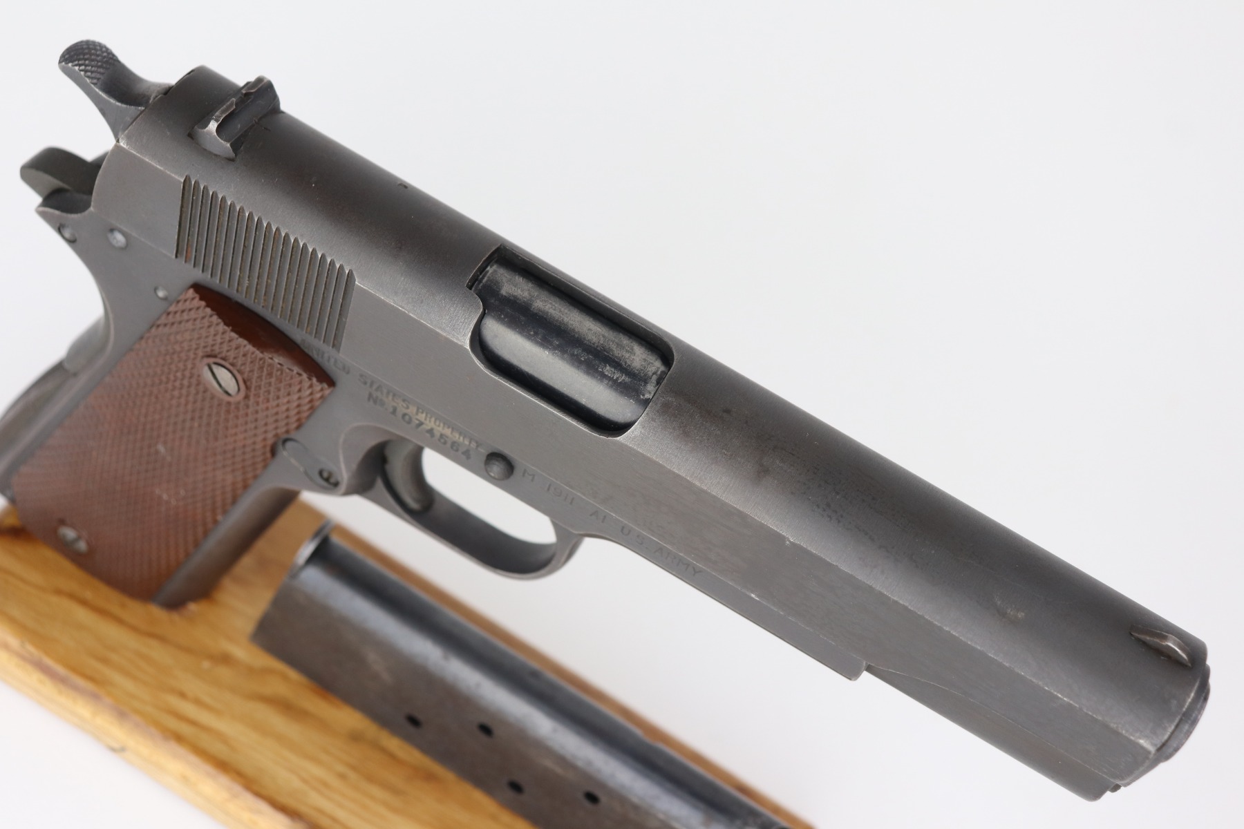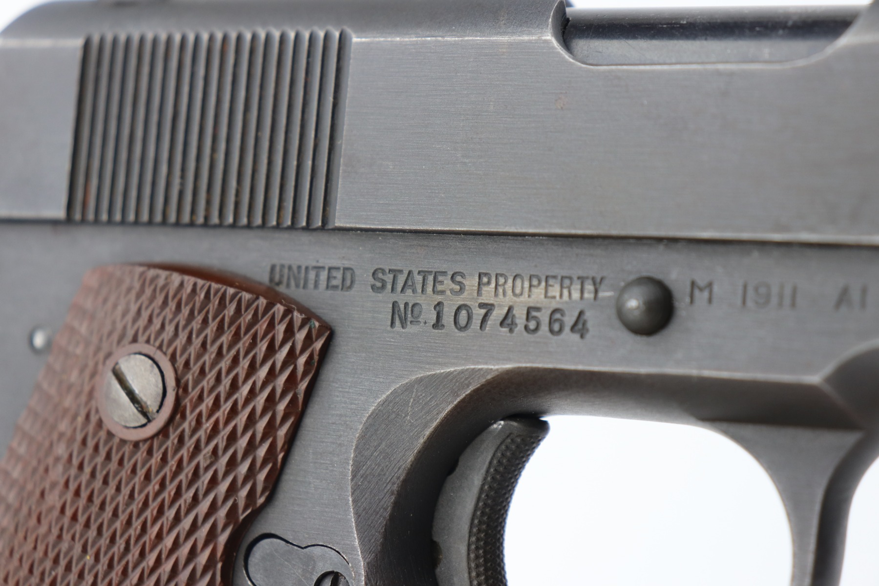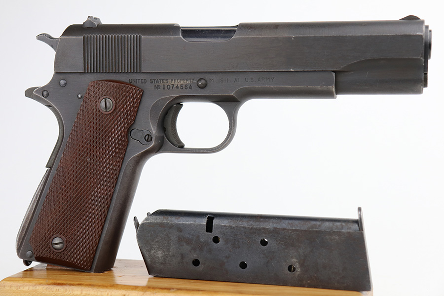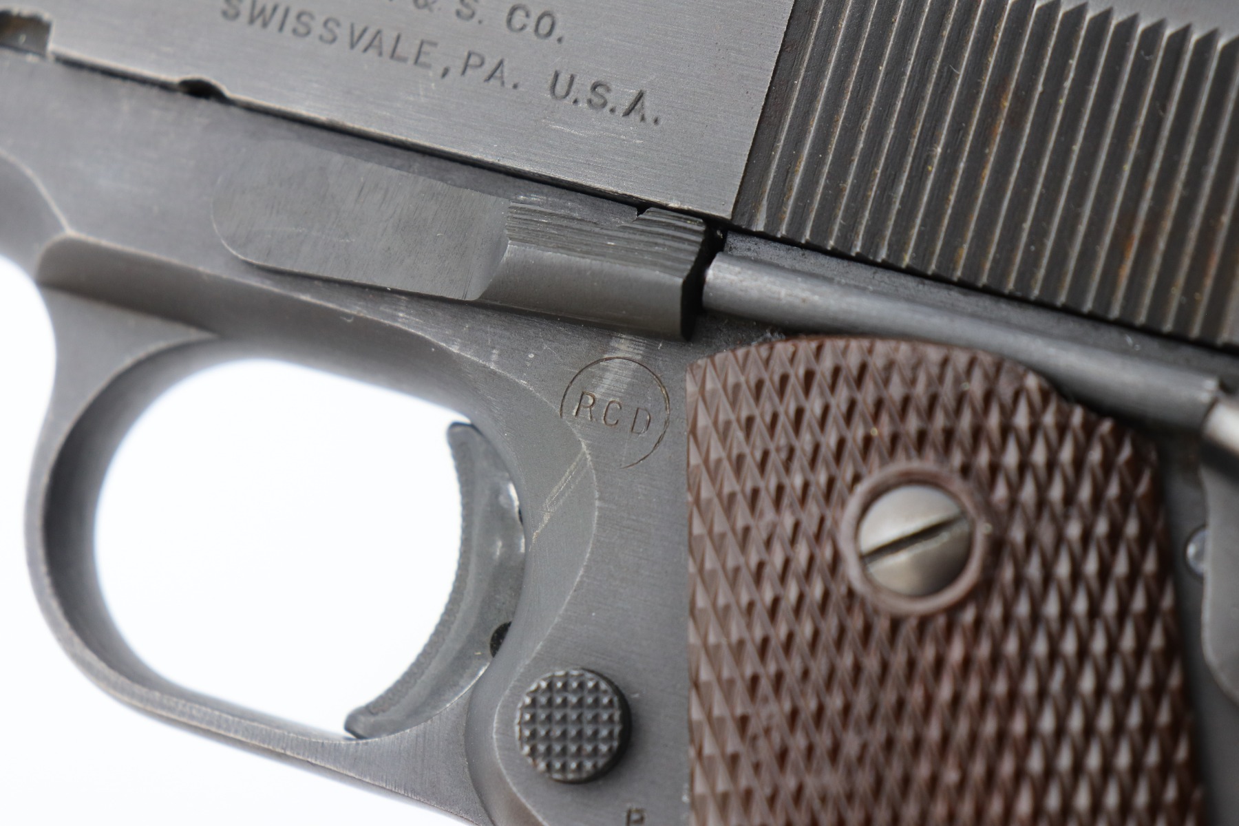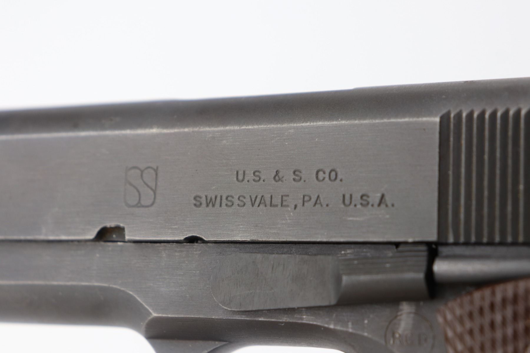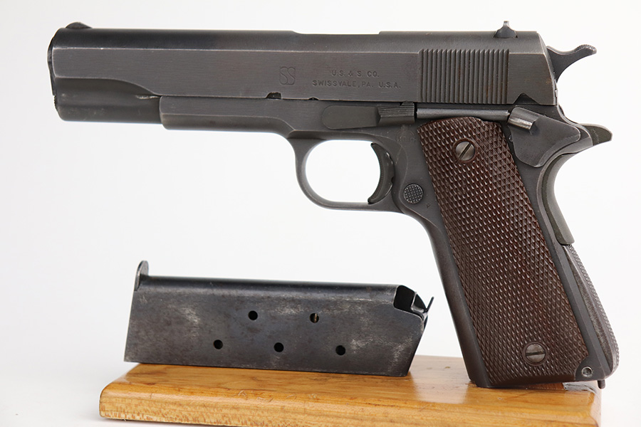 9/22/21 – This is an excellent example of a Union Switch & Signal Model 1911A1 issued to the US military in 1943. The Union Switch & Signal company of Swissvale Pennsylvania, primarily made railroad signaling equipment but received a contract on May 5, 1942 for the manufacture of M1911A1 pistols. The first pistols were accepted by Ordnance inspectors in January 1943, but the company received word that their contract would be canceled. Within a month U.S.&S. had signed a contract to supply carbine parts. On March 8, 1943 the company was officially notified that their contract had been cut back from 200,000 pistols to 30,000 pistols. However on June 26th, when the contract was nearly complete, and many of the workers had been transferred to Carbine operations, the company received a letter of intent to purchase an additional 25,000 pistols. The last of the pistols was shipped on November 27, 1943. 55,000 Union Switch and Signal pistols were delivered serial numbered from 1041405 to 1096404. U.S.&S. pistols are the second rarest of the M1911A1s (55,000 produced), only the Singer is rarer (500 produced). None of the Union Switch & Signal 1911A1s have the crossed cannons ordnance stamp. We are told these were issued to the Army Air Corps during the war. This one has retained about 95% of its original finish. There is a hint of wear around the muzzle, thinning and spotty oxidation on the front strap, and minor wear on the edges of the main spring housing. Comes with excellent grips and a proper magazine. The bore is mint. Correct ‘HS’ barrel. ‘L’ marked magazine.