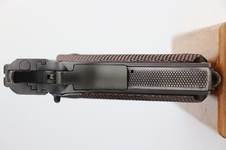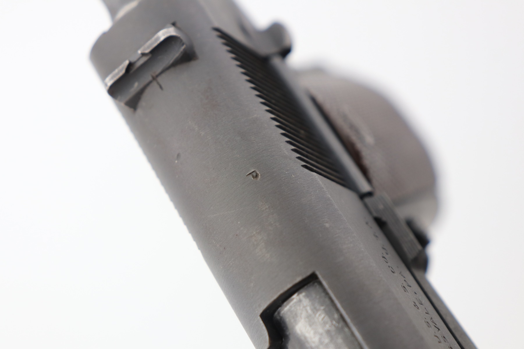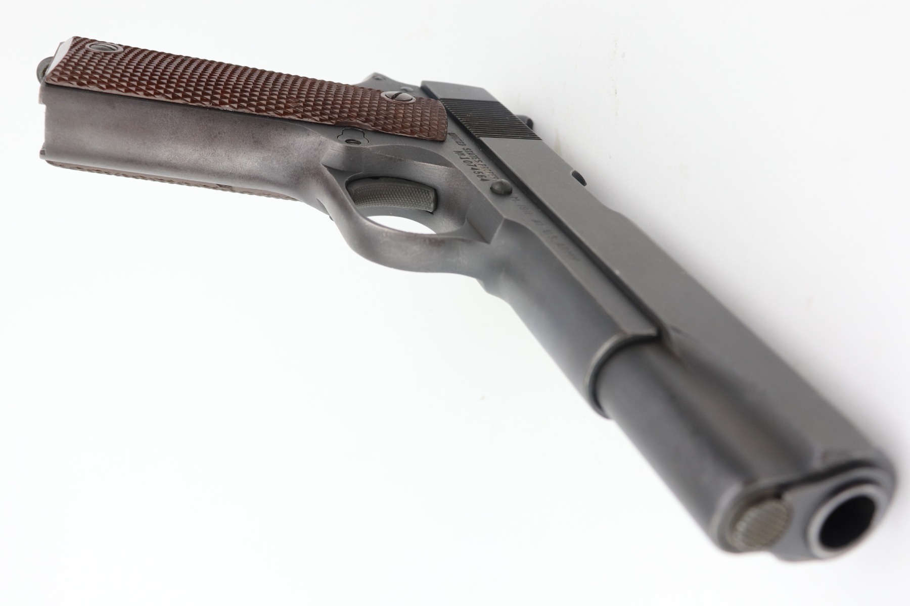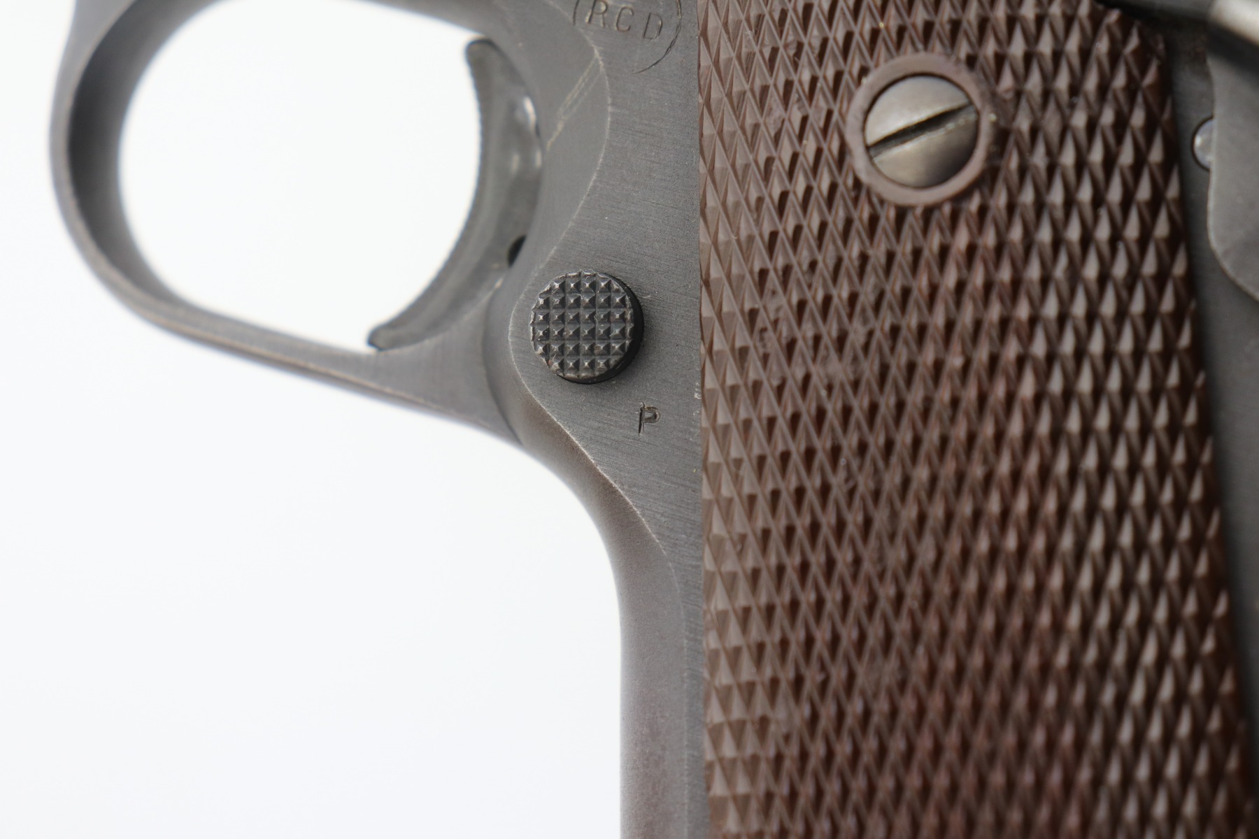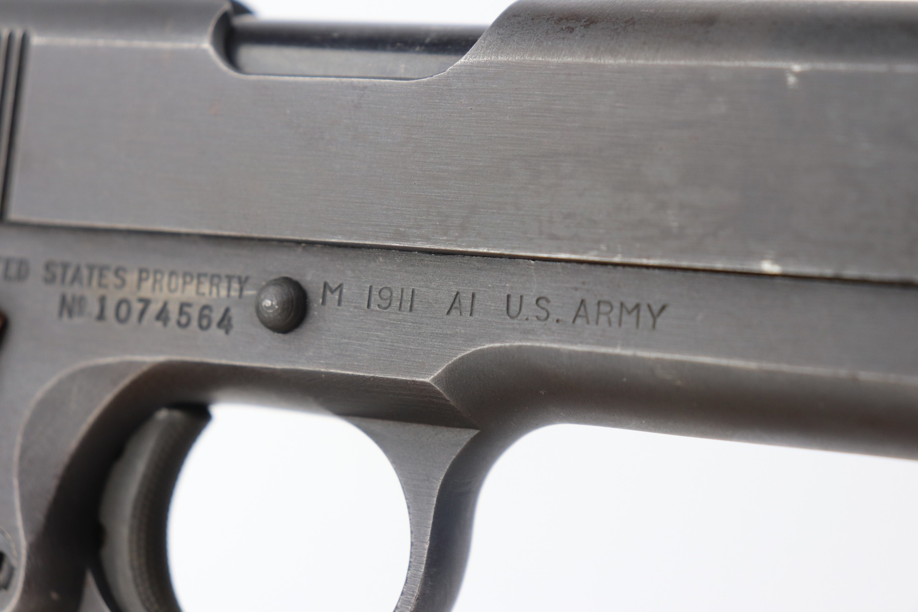 9/22/21 – This is an excellent example of a Union Switch & Signal Model 1911A1 issued to the US military in 1943. The Union Switch & Signal company of Swissvale Pennsylvania, primarily made railroad signaling equipment but received a contract on May 5, 1942 for the manufacture of M1911A1 pistols. The first pistols were accepted by Ordnance inspectors in January 1943, but the company received word that their contract would be canceled. Within a month U.S.&S. had signed a contract to supply carbine parts. On March 8, 1943 the company was officially notified that their contract had been cut back from 200,000 pistols to 30,000 pistols. However on June 26th, when the contract was nearly complete, and many of the workers had been transferred to Carbine operations, the company received a letter of intent to purchase an additional 25,000 pistols. The last of the pistols was shipped on November 27, 1943. 55,000 Union Switch and Signal pistols were delivered serial numbered from 1041405 to 1096404. U.S.&S. pistols are the second rarest of the M1911A1s (55,000 produced), only the Singer is rarer (500 produced). None of the Union Switch & Signal 1911A1s have the crossed cannons ordnance stamp. We are told these were issued to the Army Air Corps during the war. This one has retained about 95% of its original finish. There is a hint of wear around the muzzle, thinning and spotty oxidation on the front strap, and minor wear on the edges of the main spring housing. Comes with excellent grips and a proper magazine. The bore is mint. Correct ‘HS’ barrel. ‘L’ marked magazine.