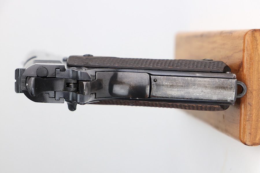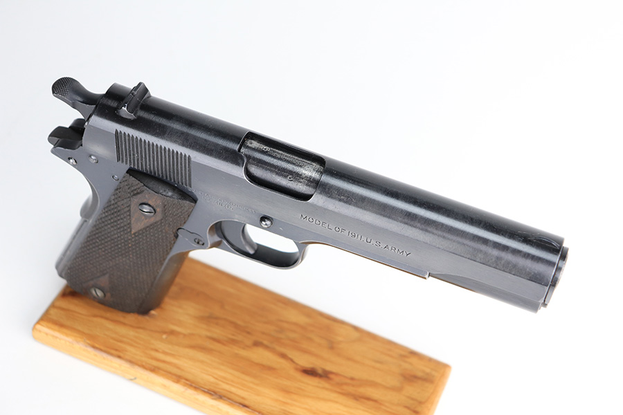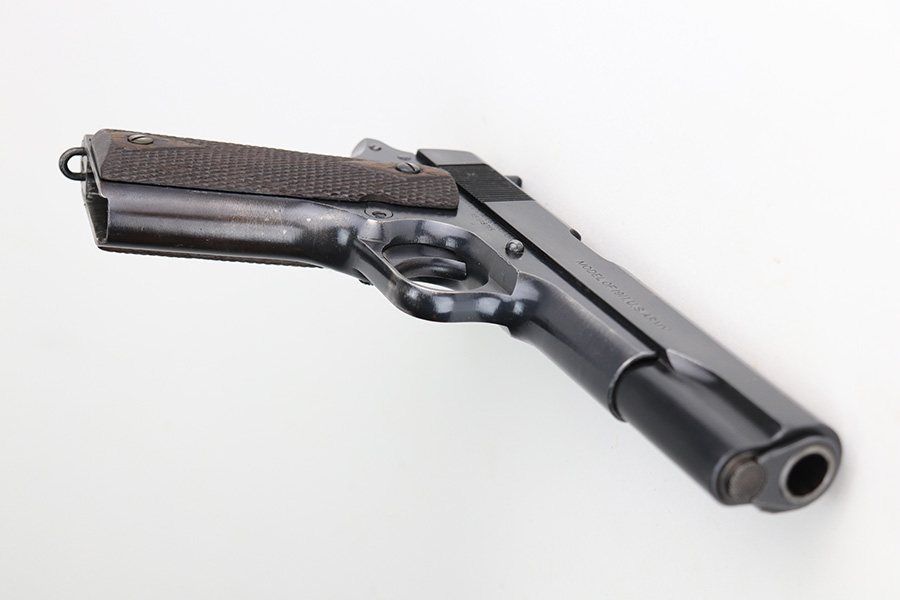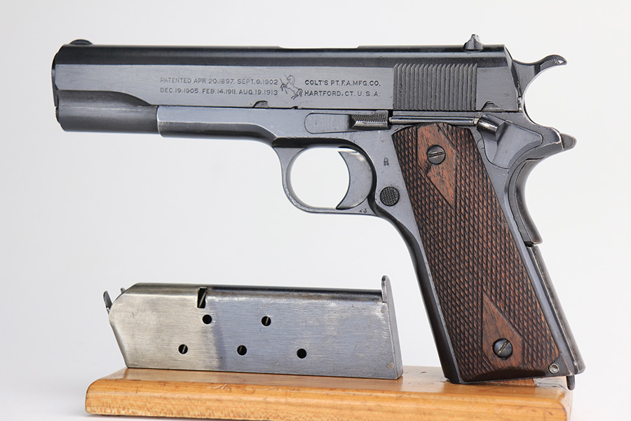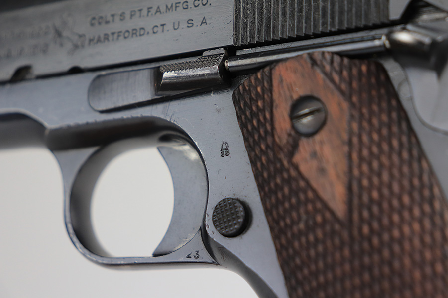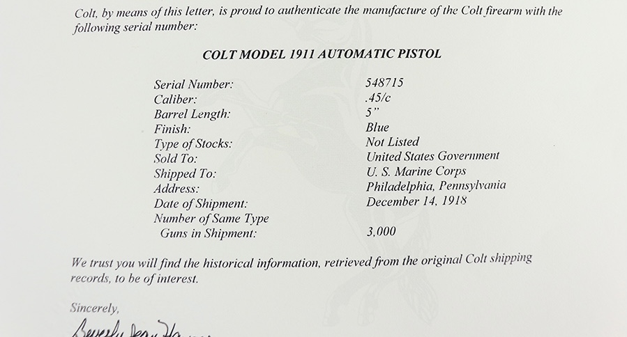 5/18/22 – This is a super rare Colt M1911 from 1918 that was shipped to the U.S. Marine Corps in December of 1918. The listing includes a Colt archive letter verifying this fact, stating it was one of 3,000 shipped to the USMC in Philadelphia of that year. It has about 85-90% of the Colt blue remaining, with most of the wear on the grip safety and mainspring housing. Excellent profile on both sides. Proper intertwined ‘HP’ marked barrel with excellent bore that matches the condition of the pistol. ‘H’ on rear of slide and inside of frame. Sharply checkered grips with only minor handling wear. Correct two-tone magazine with flat base.