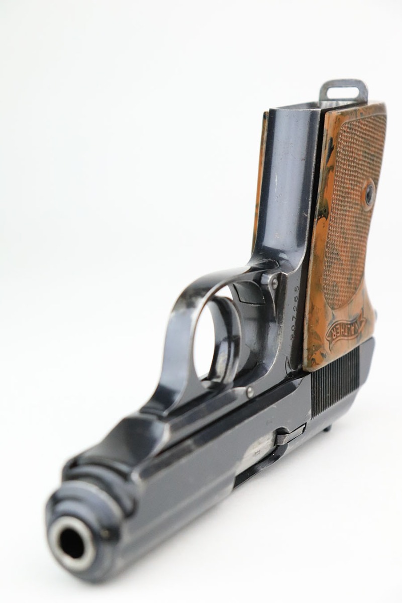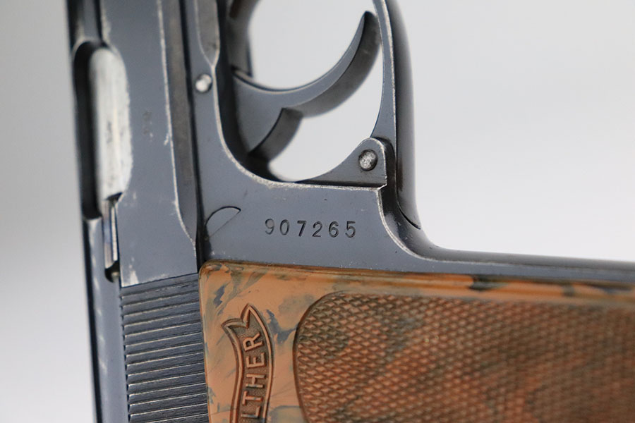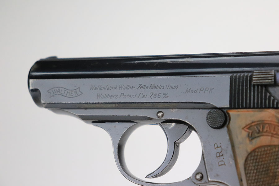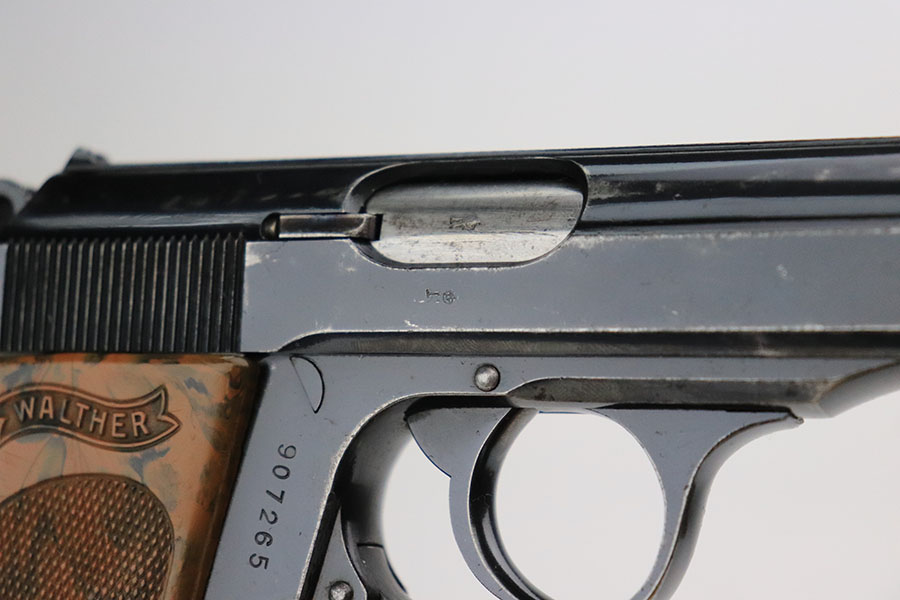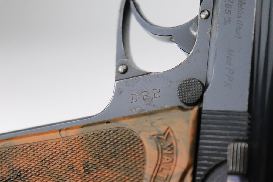 10/10/22 – This is a very rare Walther PPK with DRP-marked frame. Made in late 1935, this were issued to the Deutsche Reichspost, which was for the German postal inspectors. one of only ~1,000 ever made. This is a 1st variation example with periods in the DRP marking. It is all matching and has retained about 95% of its original bluing. There is minor muzzle wear and light spotty wear along both sides of the slide, mostly on the round edges. One small spot of wear on the underside of the trigger guard and a few tiny dings and scratches on the front strap. Comes with a very nice brown Walther grip (a hairline crack on both sides) and a period-correct Walther banner-only magazine. Mint bore. De-cocker is not functional.