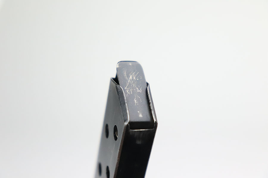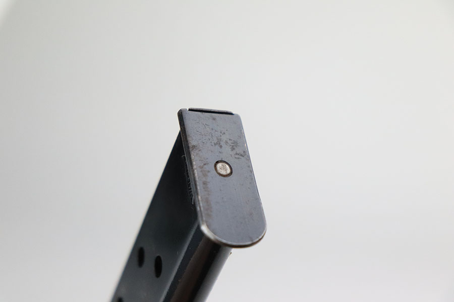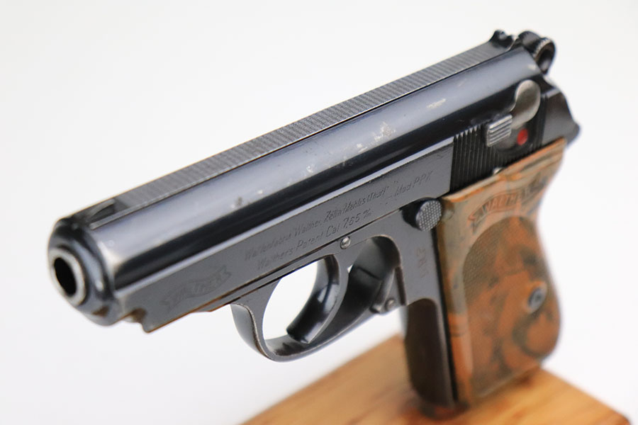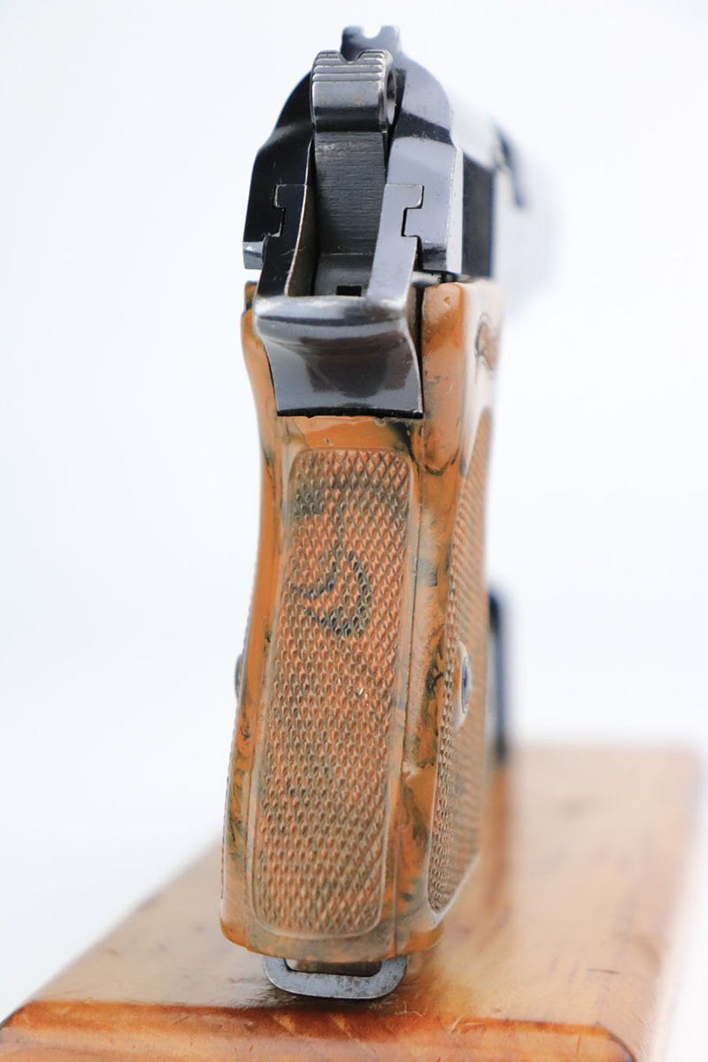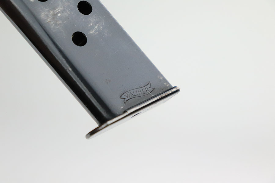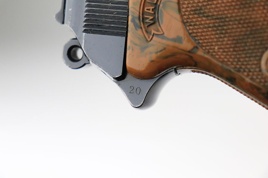 10/10/22 – This is a very rare Walther PPK with DRP-marked frame. Made in late 1935, this were issued to the Deutsche Reichspost, which was for the German postal inspectors. one of only ~1,000 ever made. This is a 1st variation example with periods in the DRP marking. It is all matching and has retained about 95% of its original bluing. There is minor muzzle wear and light spotty wear along both sides of the slide, mostly on the round edges. One small spot of wear on the underside of the trigger guard and a few tiny dings and scratches on the front strap. Comes with a very nice brown Walther grip (a hairline crack on both sides) and a period-correct Walther banner-only magazine. Mint bore. De-cocker is not functional.
