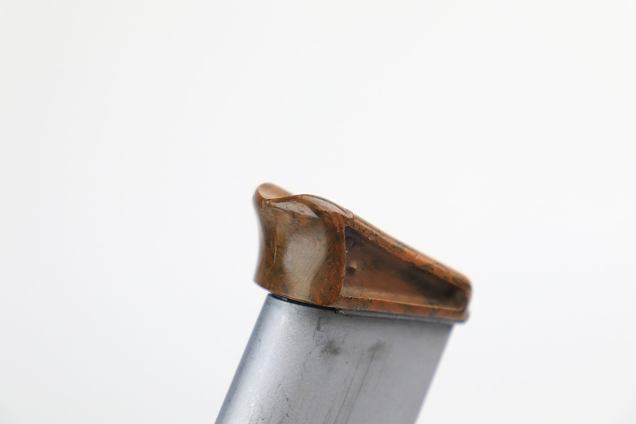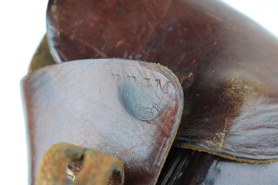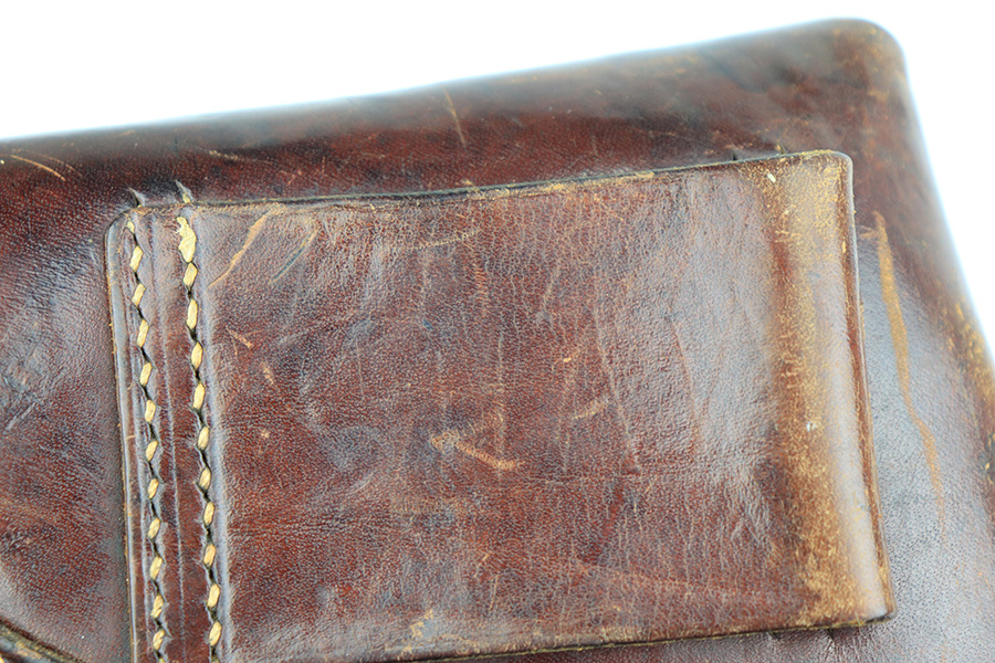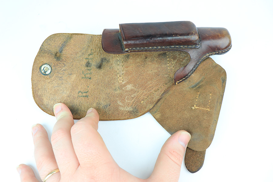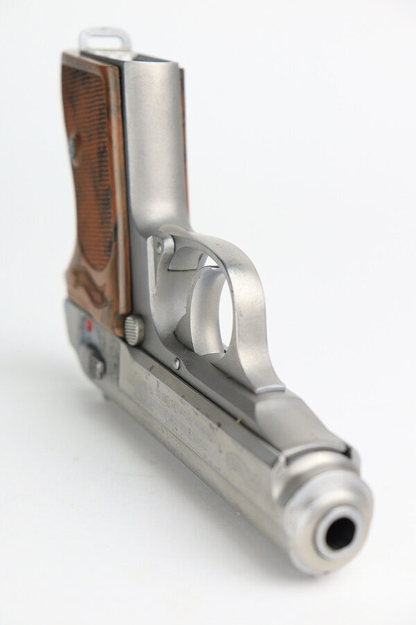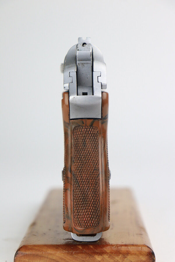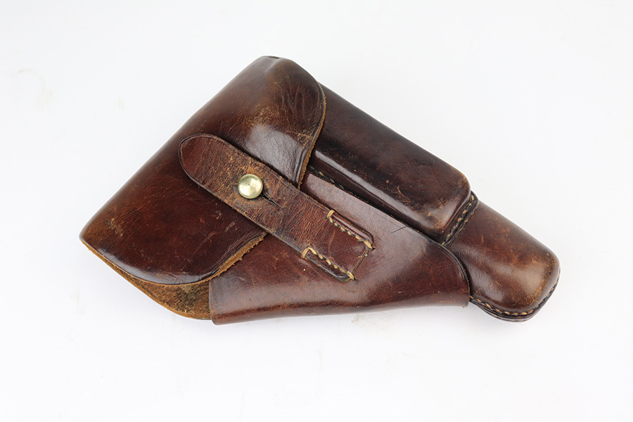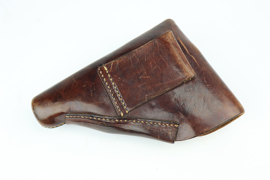 11/23/21 – This is an excellent example of a very rare Walther PPK sold in the commercial market in 1935. It has a “verchromt” finish, which was Walther’s experiment in producing a variation of the plated finish – essentially a type of electrolysis plating that gave the gun a dull gray appearance. Only about 1,500 PPK’s were made in this configuration. This one is all matching and has the proper “Crown N” proofs. It comes as a rig with an early brown leather Akah holster, one verchromt flat bottom magazine, and one brown finger extension magazine. The gun has retained about 97% of its verchromt finish. While there is very little actual finish loss, there are tiny dots of oxidation on both sides of the slide and on the trigger guard, most noticeable on the left side of the slide. Also on the left side of the slide, there are some areas with tiny pits. Comes with an excellent brown grip. The bore is mint.