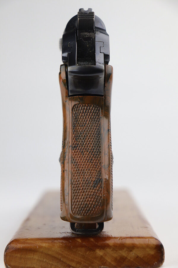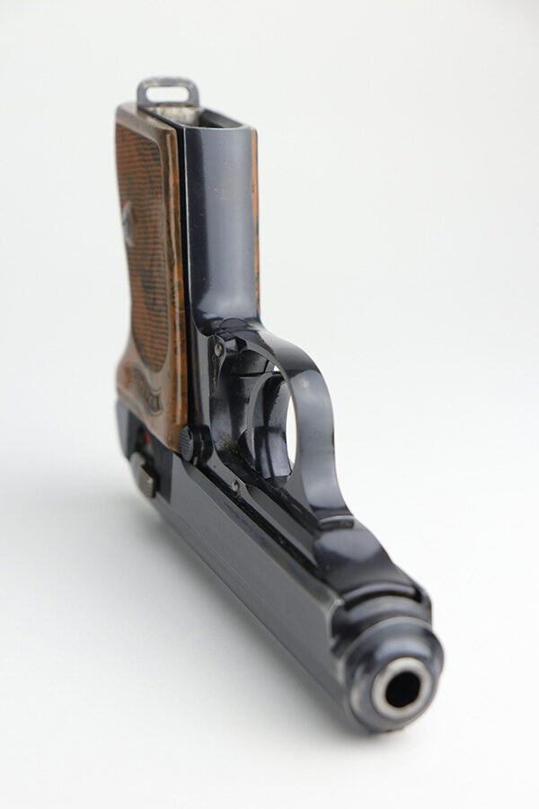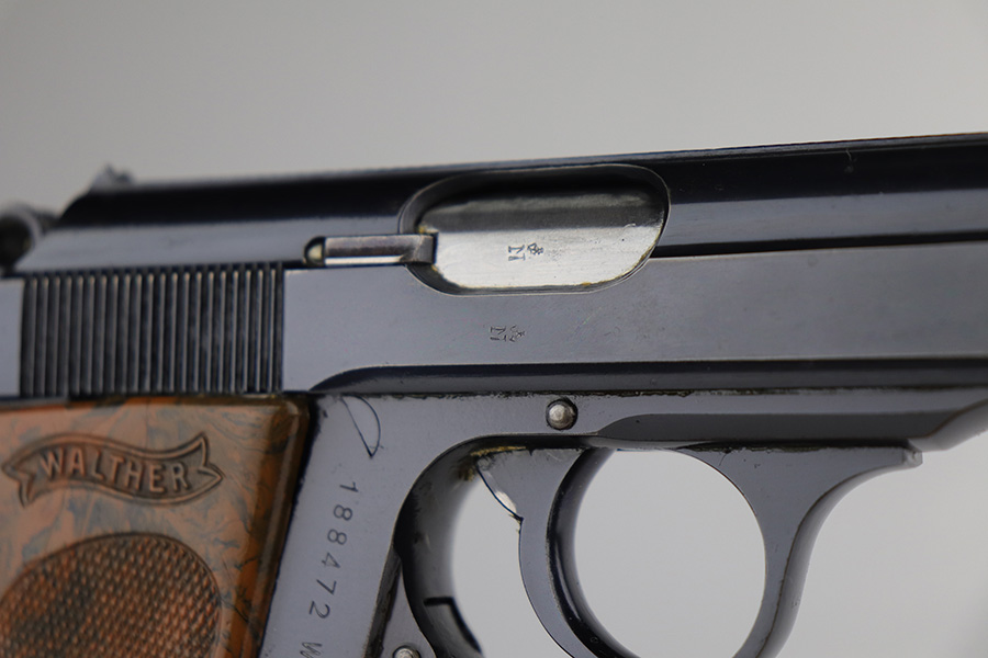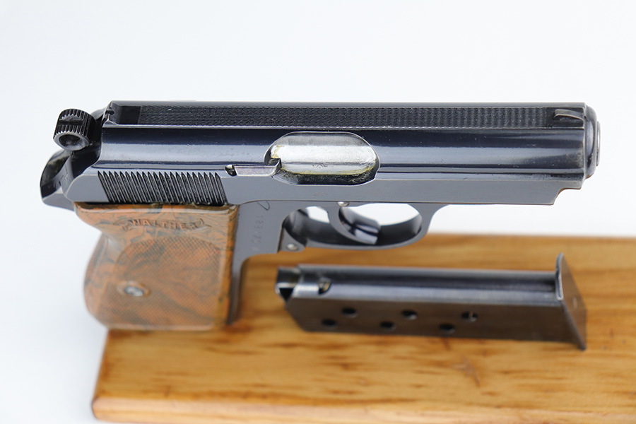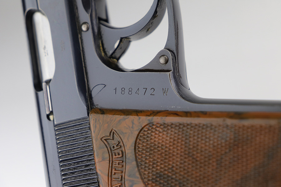 9/2/21 – This is an excellent example of a rare “W-suffix” Walther PPK manufactured in 1939. It is all matching and has the proper “Crown N” proofs. It comes with a nice brown grip – there are a few hairline cracks on both sides and one on the spine. Also comes with a wartime magazine. The gun has retained about 96-97% of its original high polish finish. There is minor wear around the muzzle, very minor spotty wear on the front strap, and a few very light scratches here and there along the slide. Mint bore.