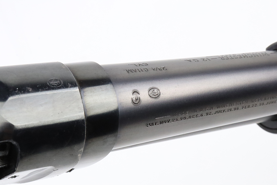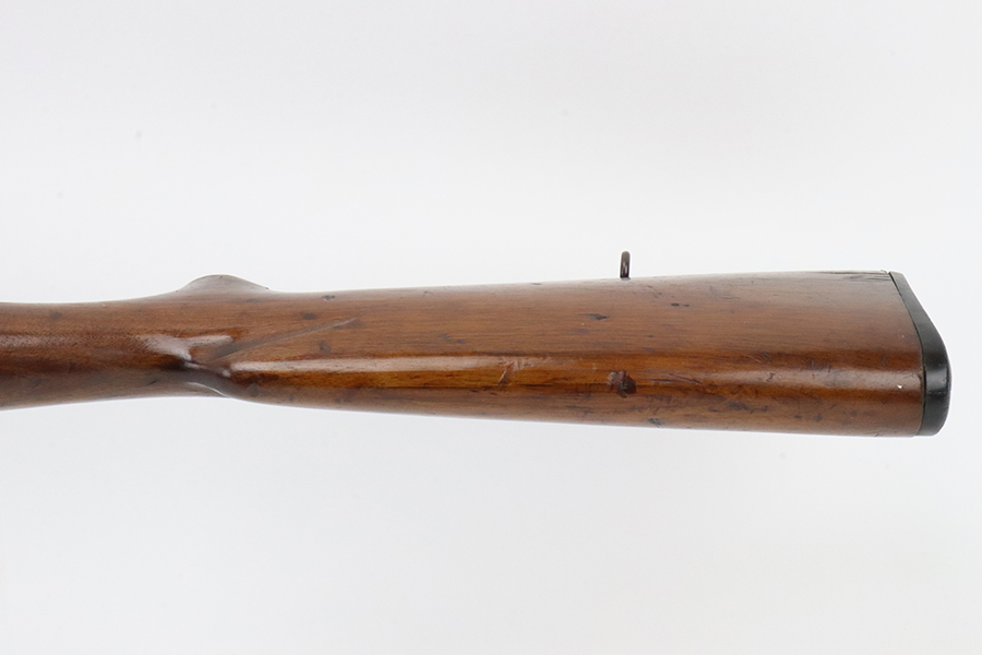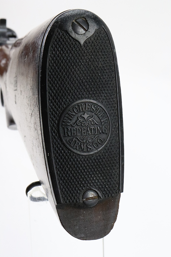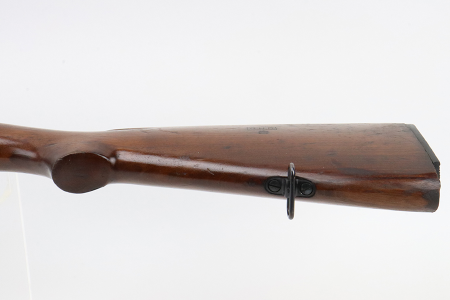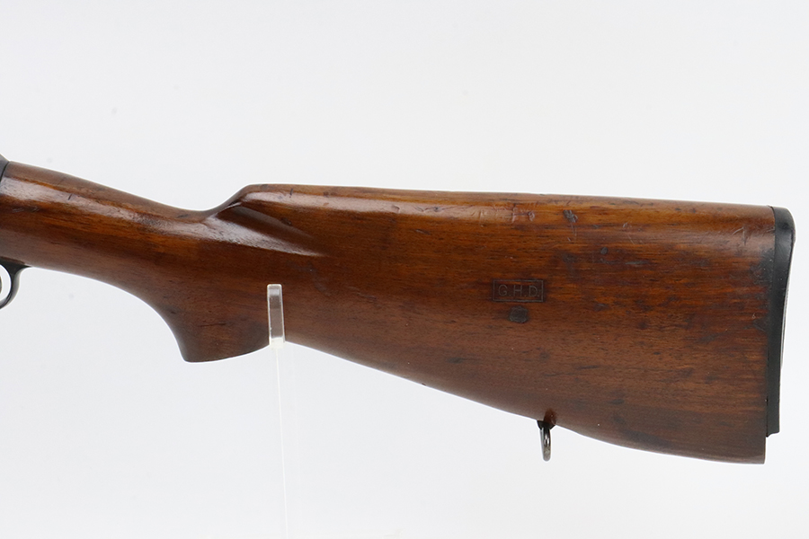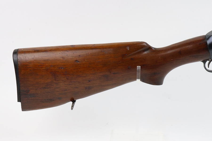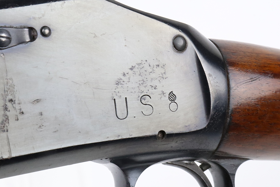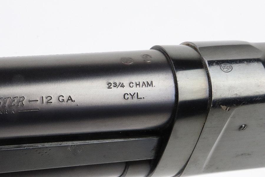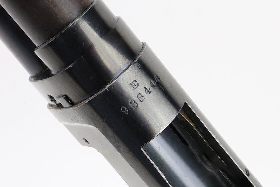 2/6/24 – This is a very rare, original Winchester Model 97 Trench shotgun from 1943. Barrel marked ’44’ on the underside. The wood is in good shape with no cracks, but does have several dings and small chips. Proper G.H.D. inspector marking with crossed cannons cartouche on stock. Receiver is marked U.S. and has flaming bomb. The action works perfectly. Nice, original bluing throughout. There are various scratches on the receiver, and a minor patch of freckling. Other correct characteristics for a model 97 include the bayo lug sitting back from the muzzle, 20in barrel with ‘cyl’ marking, two sets of holes on mag tube, receiver is martially marked, proper serial range, stock inletted for sling swivel. Correct 4-row heat shield that is riveted to bayo adaptor. Unmarked action bar has some dings on it. Original buttplate is badly chipped at the bottom.