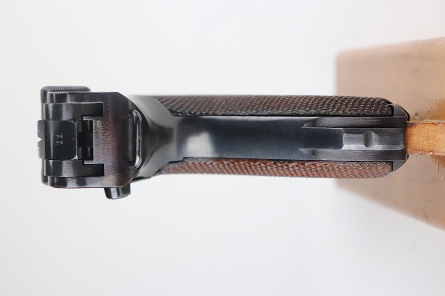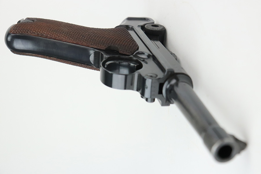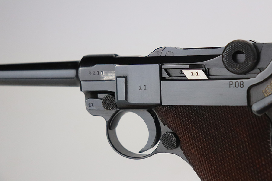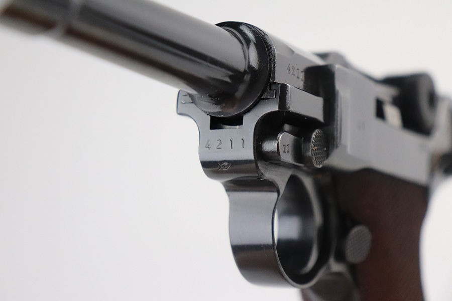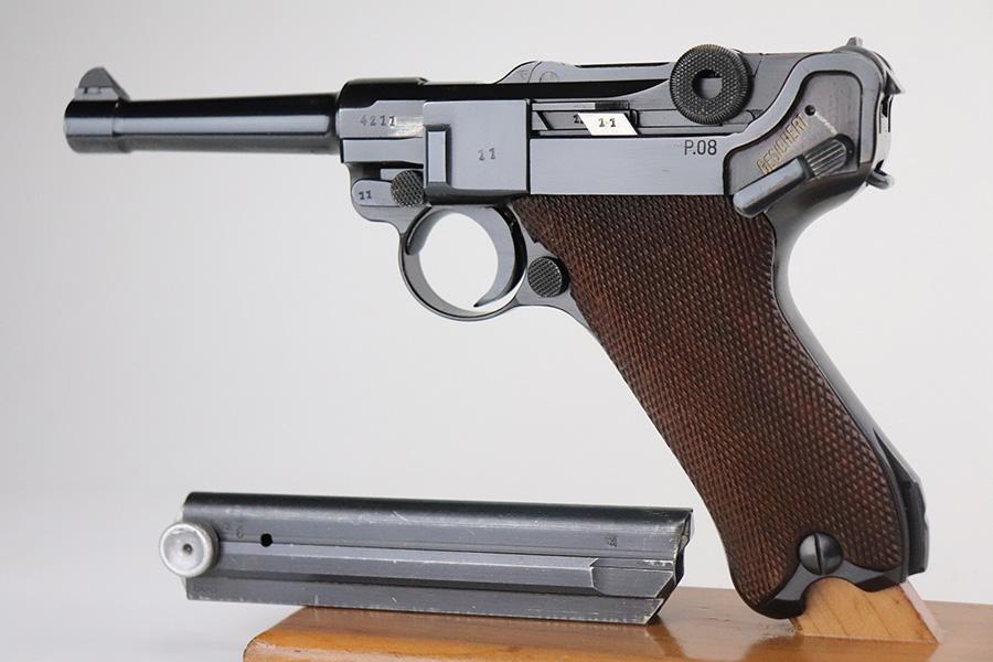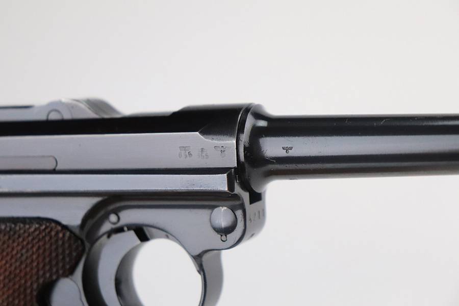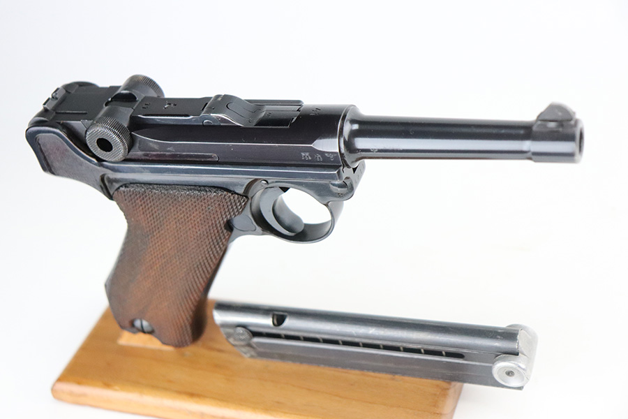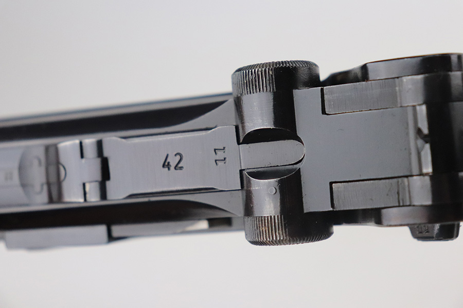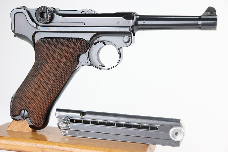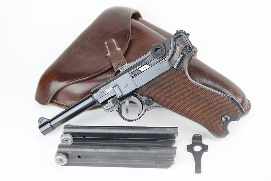 7/7/21 – This is a very rare find in fantastic, original condition – a 41/42 coded Nazi Mauser Luger rig with both of the original, matching magazines. There were only 7,000 of this variation produced, and this is the first we’ve offered with both matching magazines. The original blues rates at 98+% with just a bit of thinning on the left side of the receiver. Minty bore and excellent grips. Comes with terrific ’41 dated brown holster, and original E/655 marked tool. Won’t see another one like this for some time.