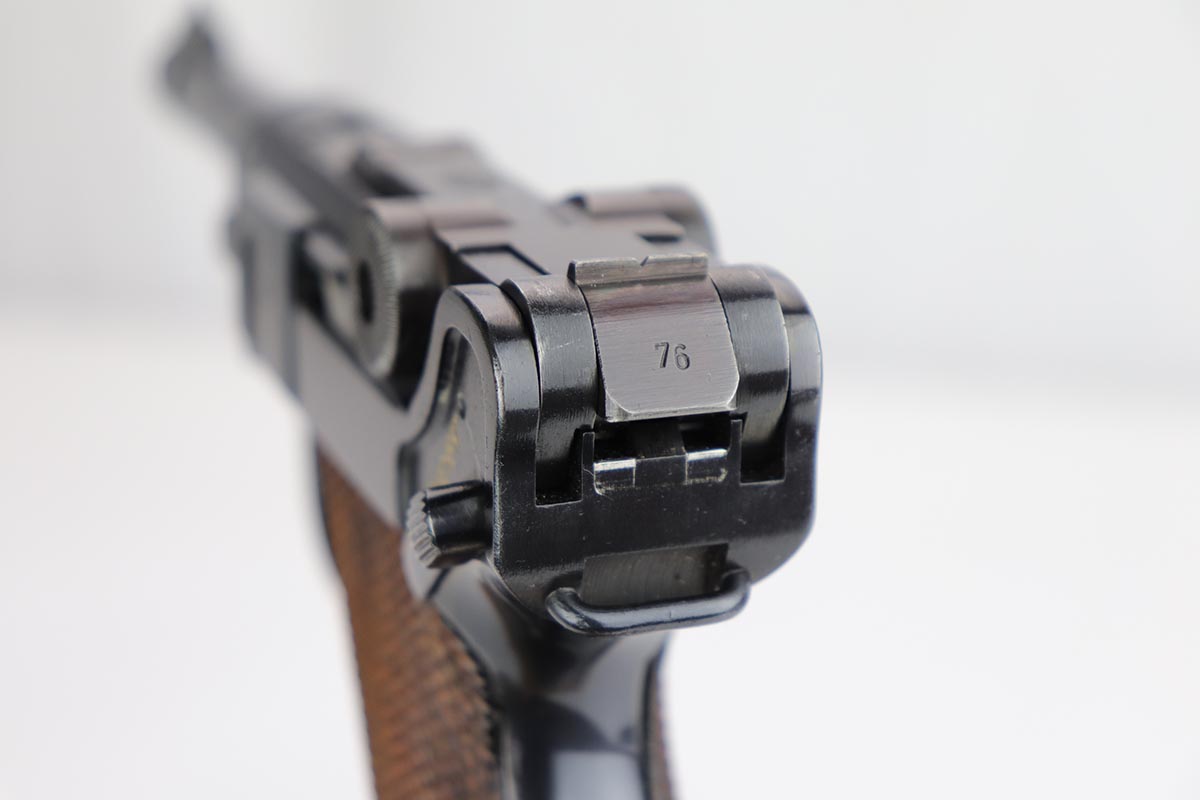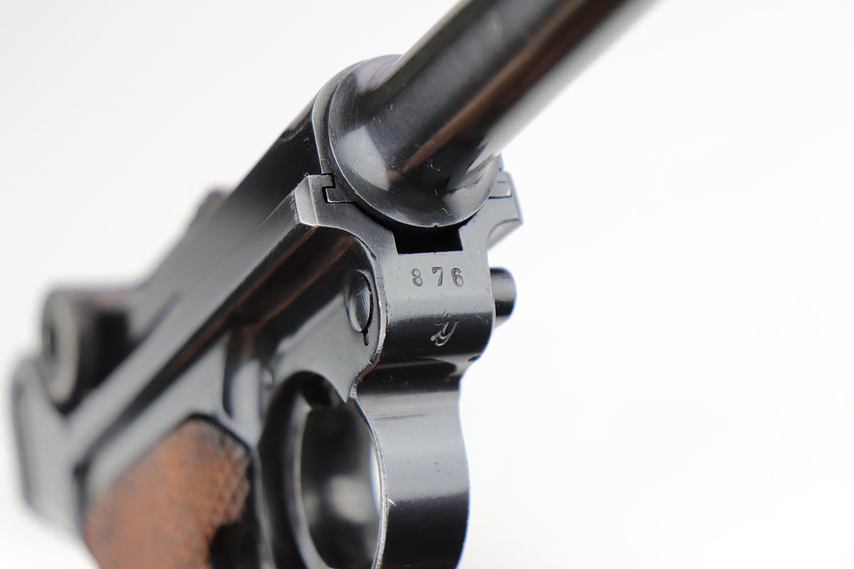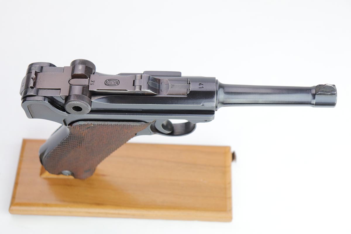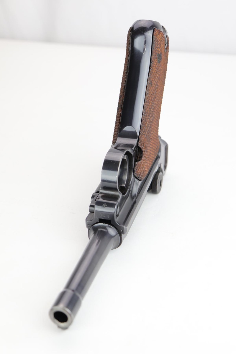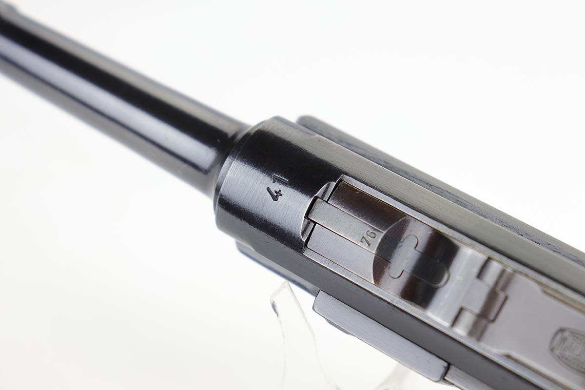 2/7/20 – This is a rare commercial Mauser Banner Luger from 1941 in exceptional condition. There were only a couple thousand of this variation produced, which is referred to as ‘variation 10’ in Still’s book on Third Reich Lugers, and was the last variant produced. The original bluing rates at 98-99% with just a hint of edge wear, and small scratch on the front strap. Fantastic, unmarked grips. The magazine is numbered to the gun but don’t believe it was done at the factory. The only detractor here is that the bore wasn’t as well cared for, and there is some frost and minor freckling throughout.