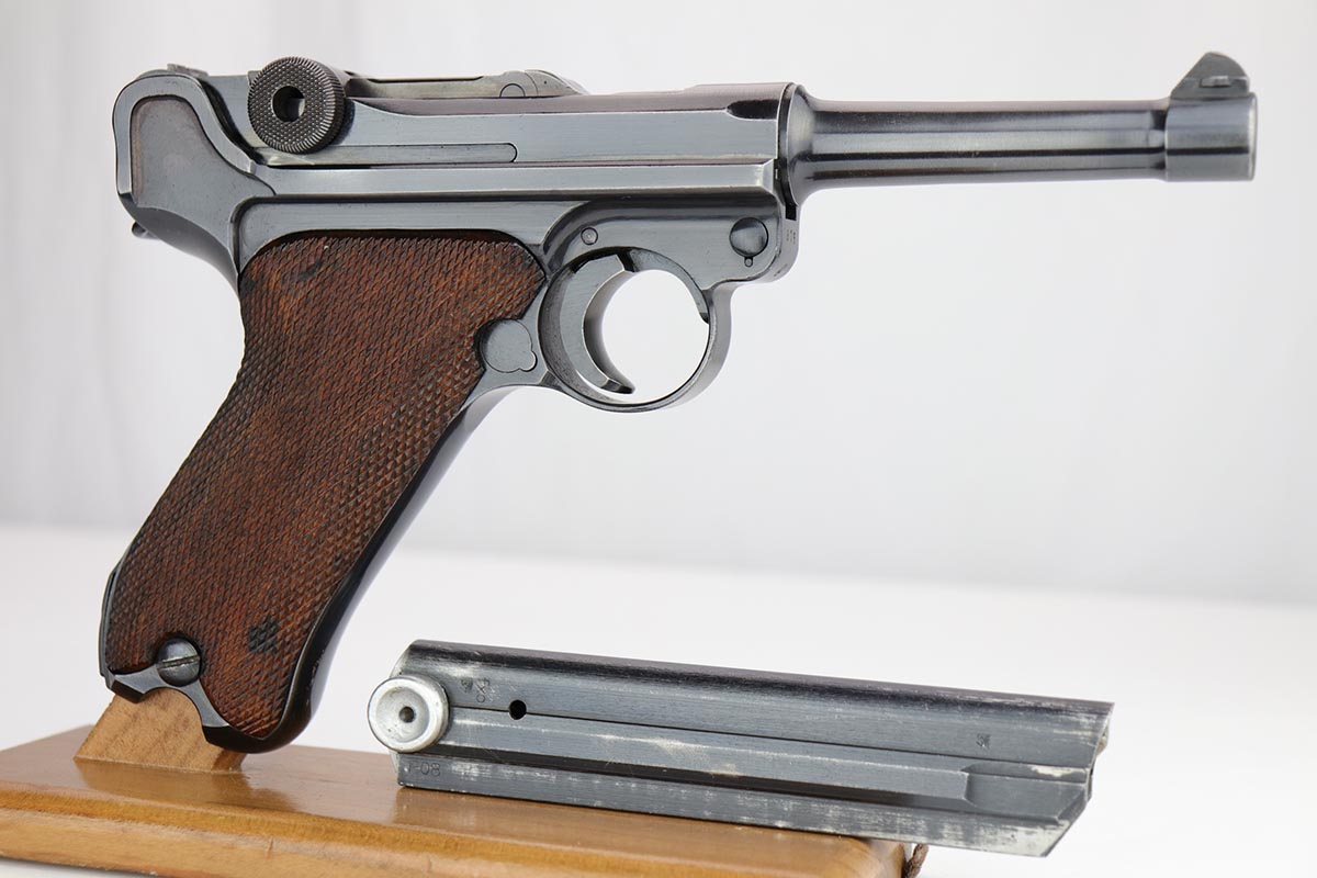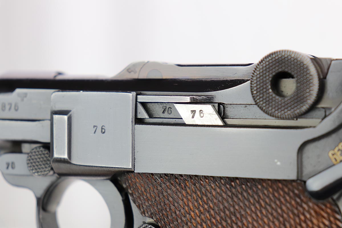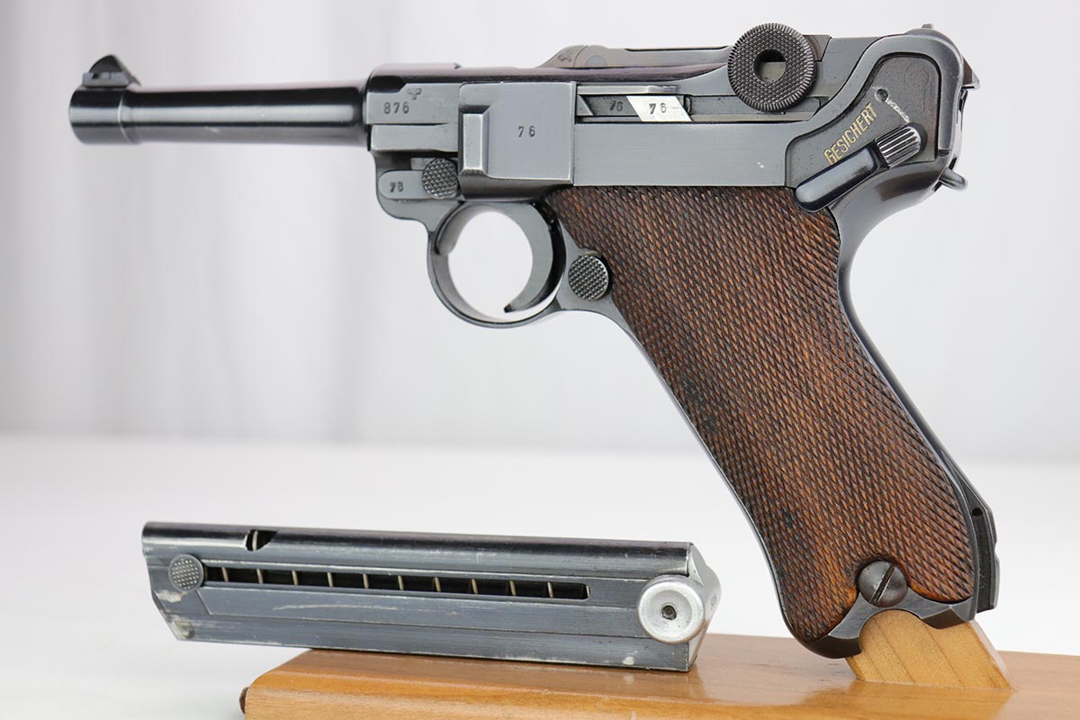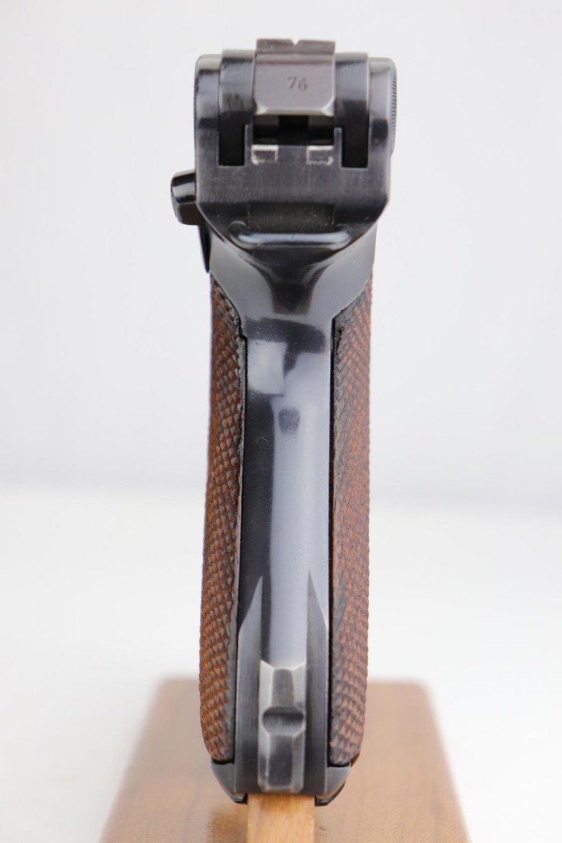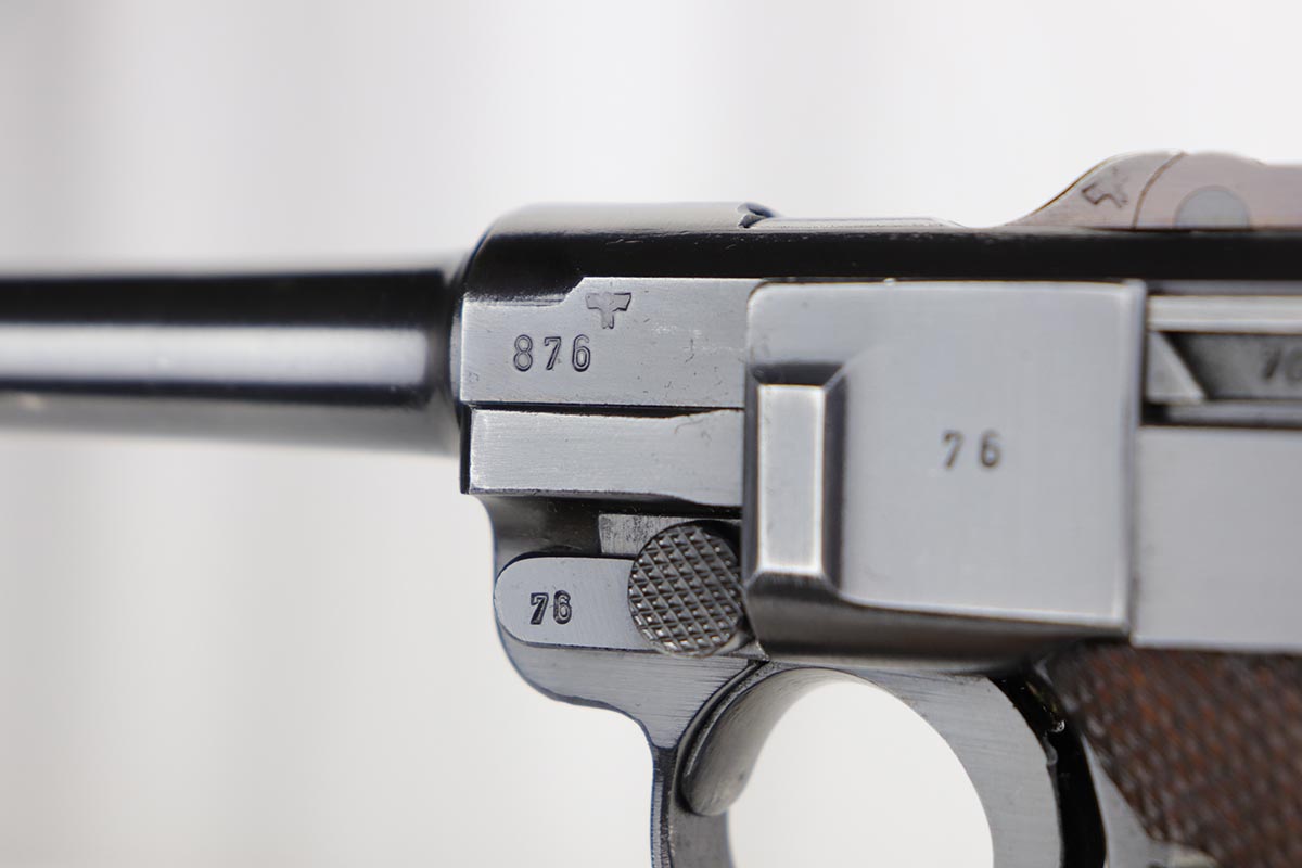 2/7/20 – This is a rare commercial Mauser Banner Luger from 1941 in exceptional condition. There were only a couple thousand of this variation produced, which is referred to as ‘variation 10’ in Still’s book on Third Reich Lugers, and was the last variant produced. The original bluing rates at 98-99% with just a hint of edge wear, and small scratch on the front strap. Fantastic, unmarked grips. The magazine is numbered to the gun but don’t believe it was done at the factory. The only detractor here is that the bore wasn’t as well cared for, and there is some frost and minor freckling throughout.