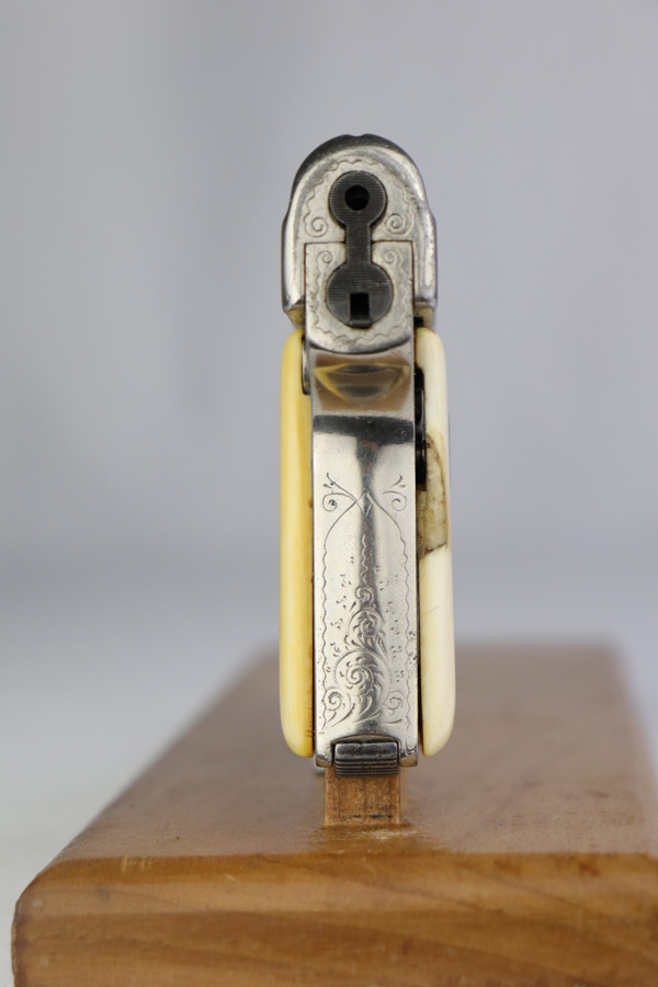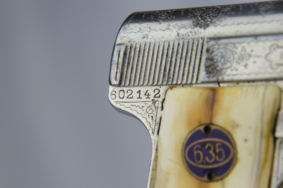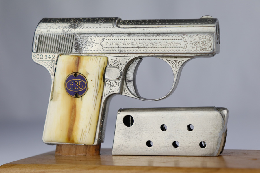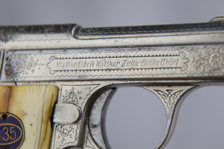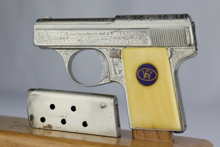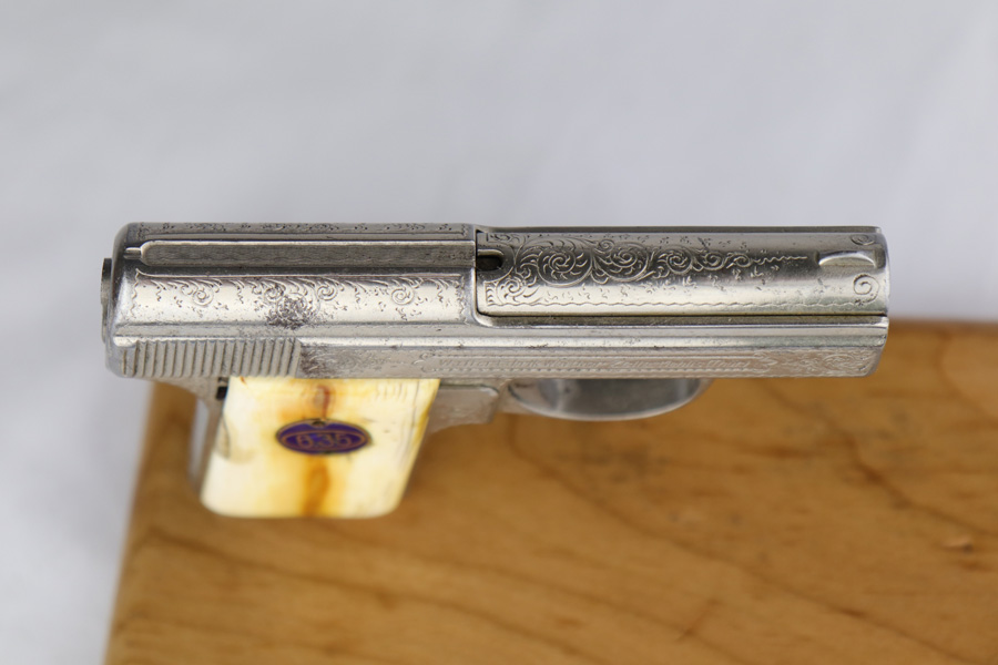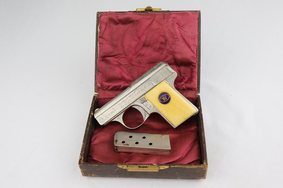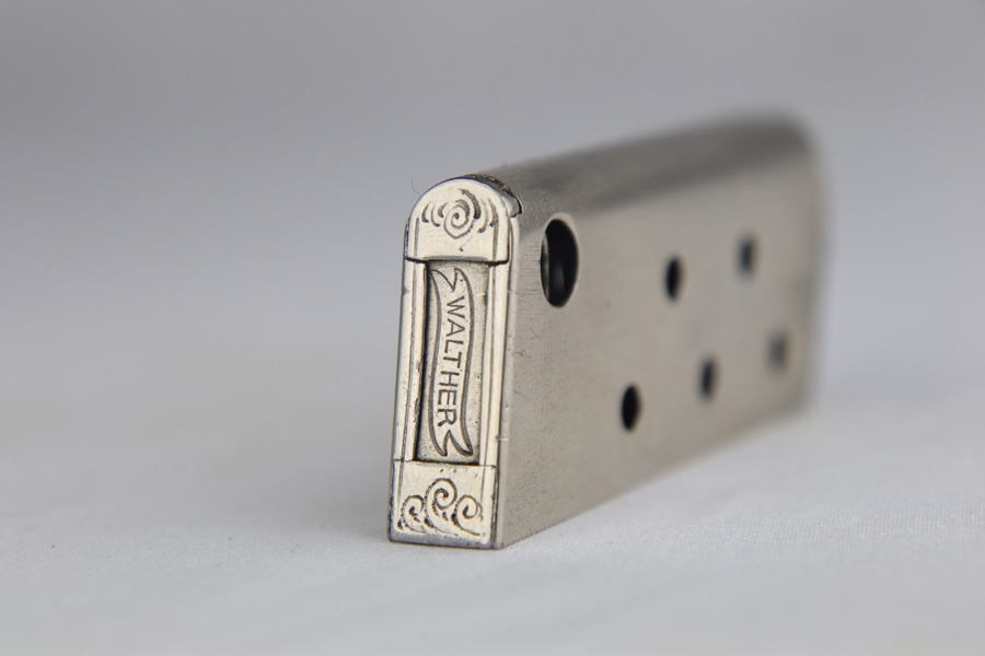 2/8/19 – This is a very hard to find Engraved Walther Model 9. I am confident that the engraving is “factory”, but there are no factory records to confirm that. The grips are slightly worn ivory and also factory original. The right grip panel is a bit loose, but could most likely be fixed with a “shim” in place under the grip, but if you know these guns, removing the grip is not something we want to mess with. It has an engraved bottom original Walther 9 magazine. The gun seems to function well, however, we are not necessarily recommending it be shot. The only part I am not sure about is the nickel finish. I believe it was originally nickel plated but may now have an old re-nickel finish. The finish does show age. Without question this is a rare factory Walther 9 in beautiful condition. It comes in a period display case, however, not a Walther factory case as there is no logo on the case. This gun comes to us as a consignment from a well known Walther collector.
