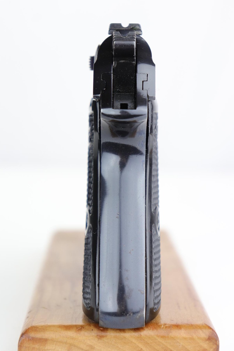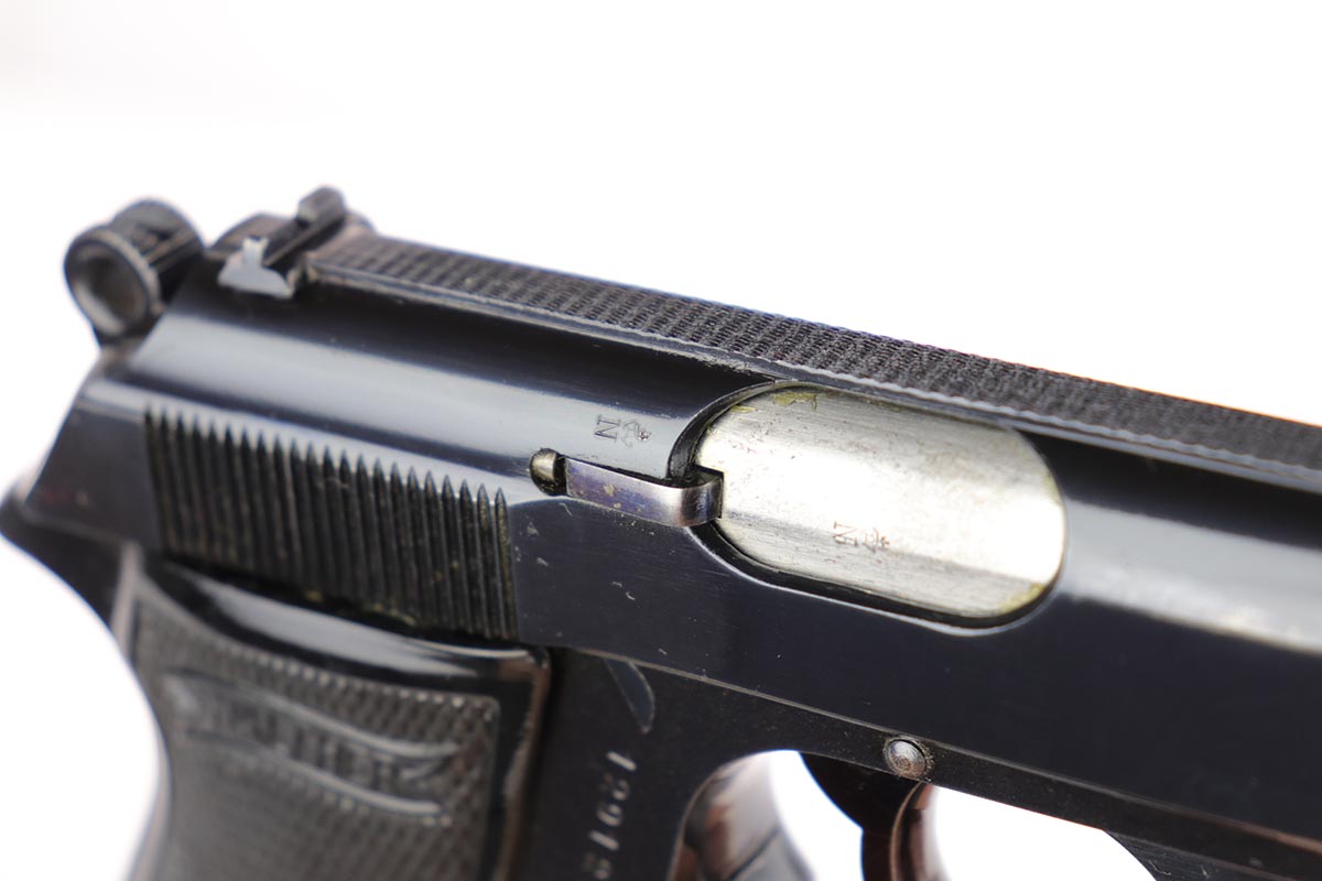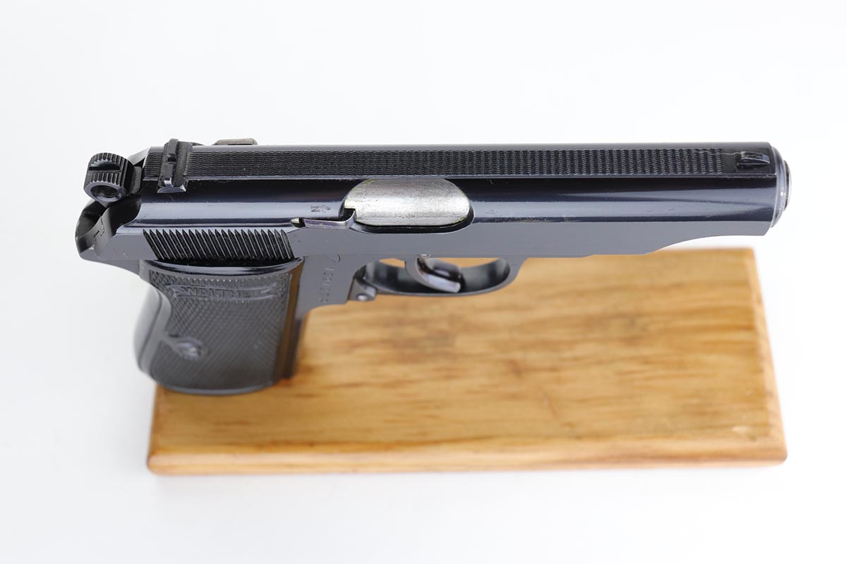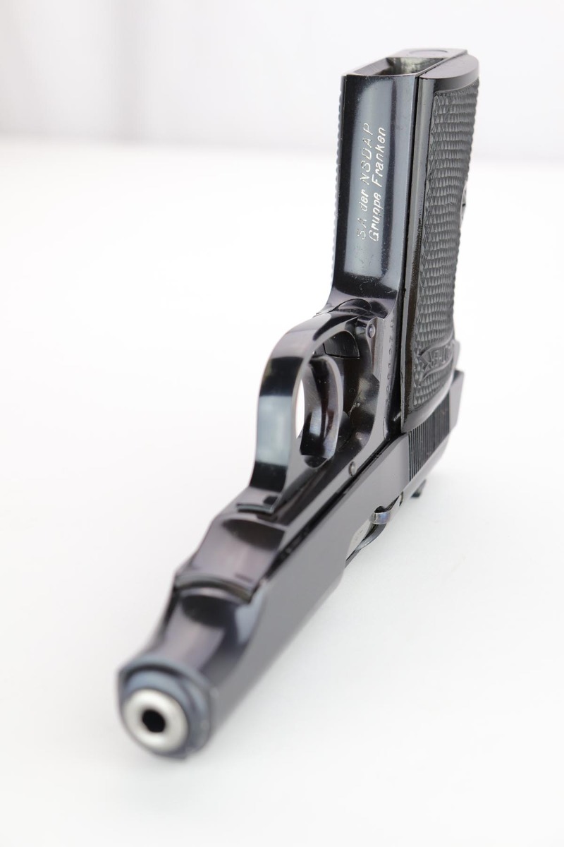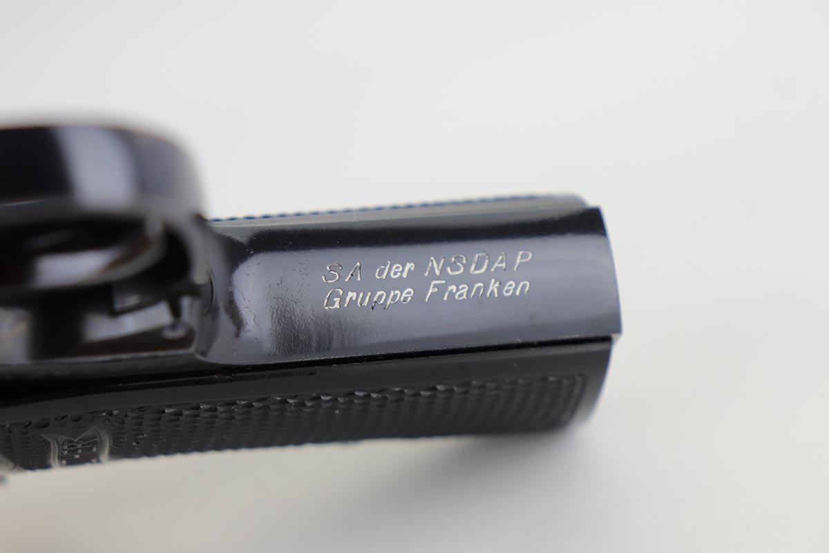 2/4/20 – This is a fantastic example of a very rare SA-issued Walther PP that was chambered in .22 caliber. There were only about 6,000 Walther PP’s issued to the SA, and only a tiny fraction of that number were chambered in .22, and even fewer were issued to Gruppe Franken as this one was. The high-polish blue rates at 97% with a minor spot of wear on the trigger guard, muzzle and on the right side of the slide, near the ejection port. Mint bore and excellent grips. Finger extension magazine has a few small dings but no major issues. Listing includes a Gruppe Franken marked pin.