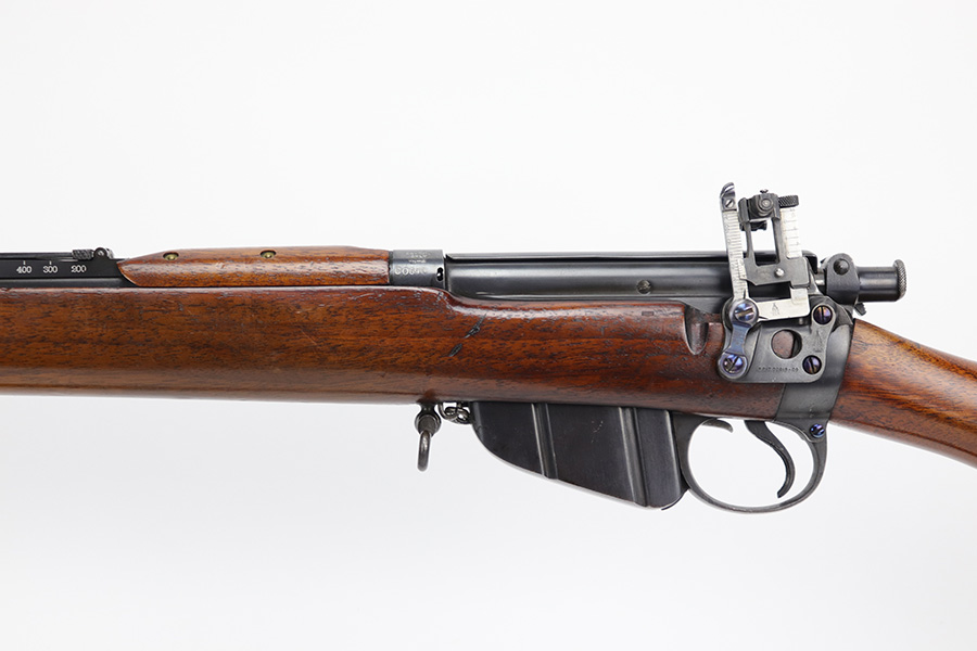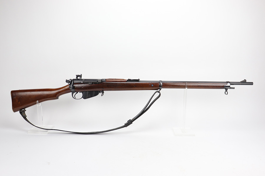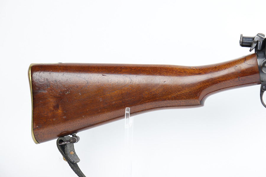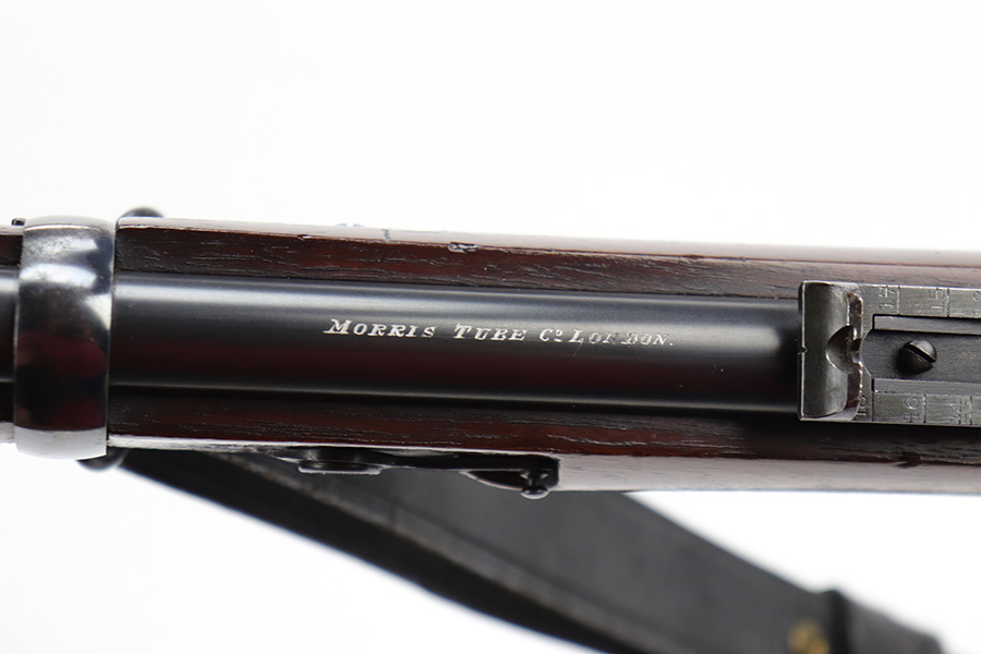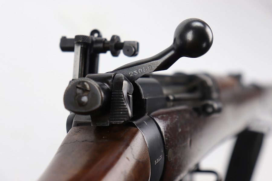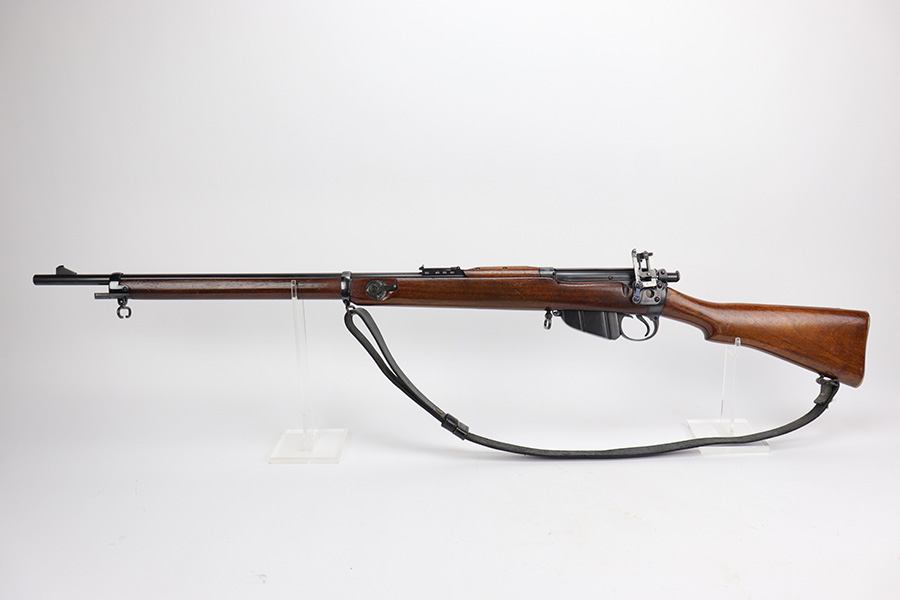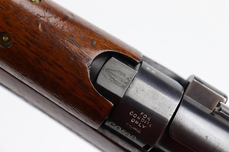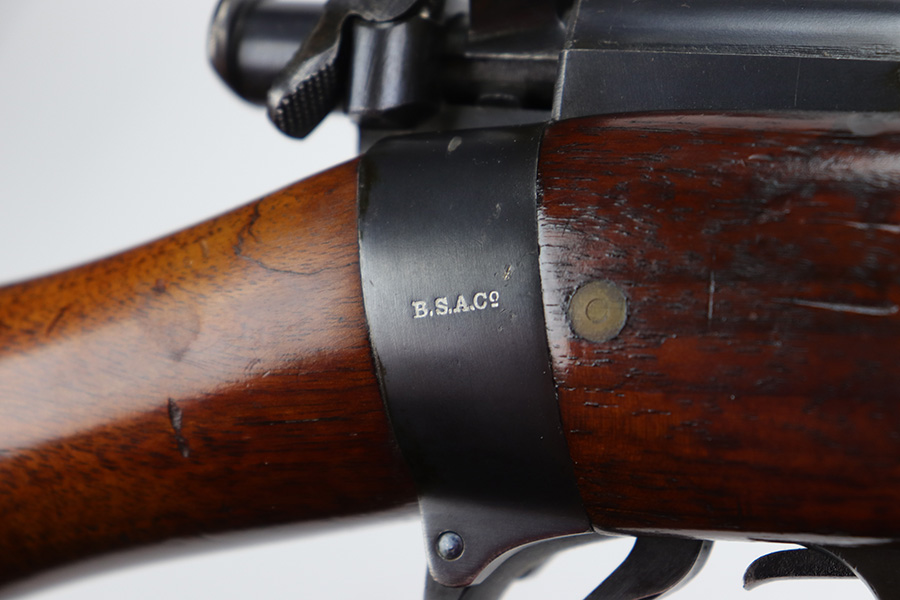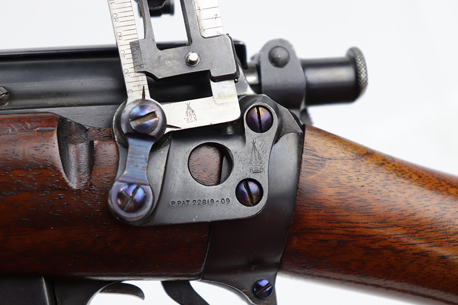 6/21/23 – This is an absolutely fantastic example of a rare BSA Long-Lee Enfield rifle from the early 1900s. The bluing is gorgeous with only minor wear and patina on the mag and trigger guard. Minty bore. Terrific wood furniture aside from a surface crack on the upper wrist. Still has the original sighting wheel, with BSA diopter sight intact. Brass buttplate is marked ‘TESTED BY BLANCH & SON LONDON’ along the top and has a trapdoor. Receiver is marked ‘FOR CORDITE ONLY’. Barrel marked ‘MORRIS TUBE CO. LONDON’. Bolt and receiver serial numbers do not match. Comes with after-market sling.