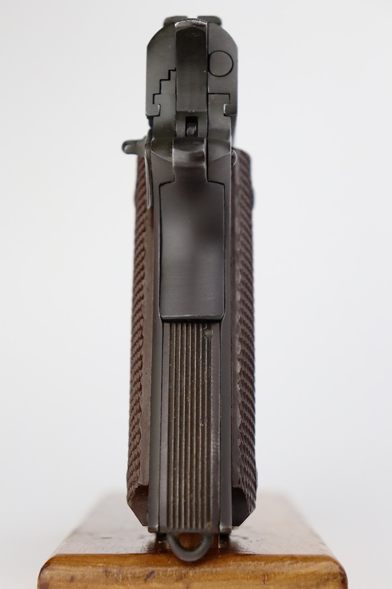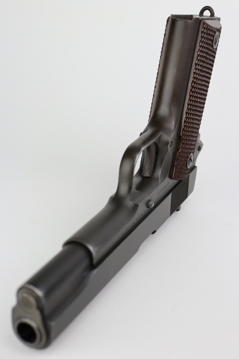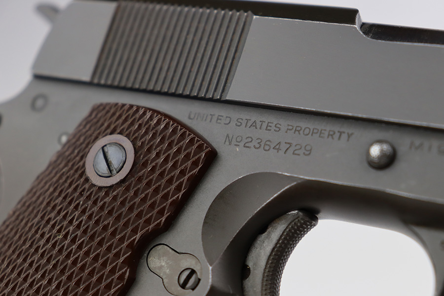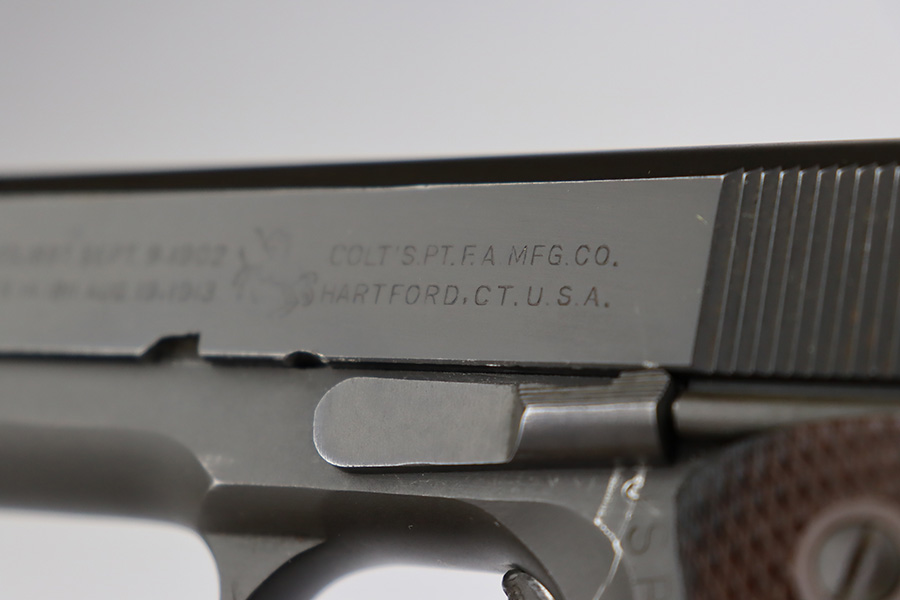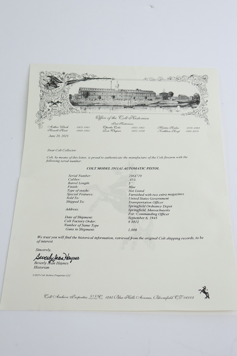 7/25/23 – This is one of the finest known examples of the ultra rare J.S.B. inspected Colt 1911A1. Those initials stand for John S. Begley, who inspected only the very last WW2 military examples produced. It’s estimated that only ~2,000 were produced with his inspector’s mark and these have a low survival rate. This particular example also happens to be in exception conditional, with very minor hints of high edge wear. The correct barrel is present, with P proof on one side of the lug and square C marking on the other side. Minty grips and unmarked magazine. Minty bore. Comes with Colt archives letter that state it was shipped on September 6th, 1945.