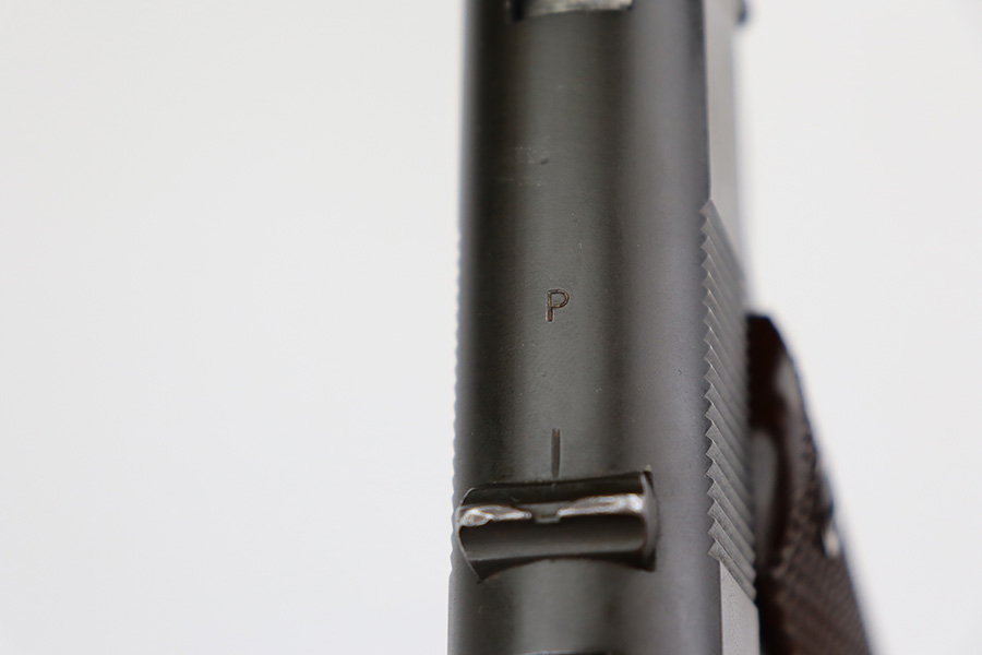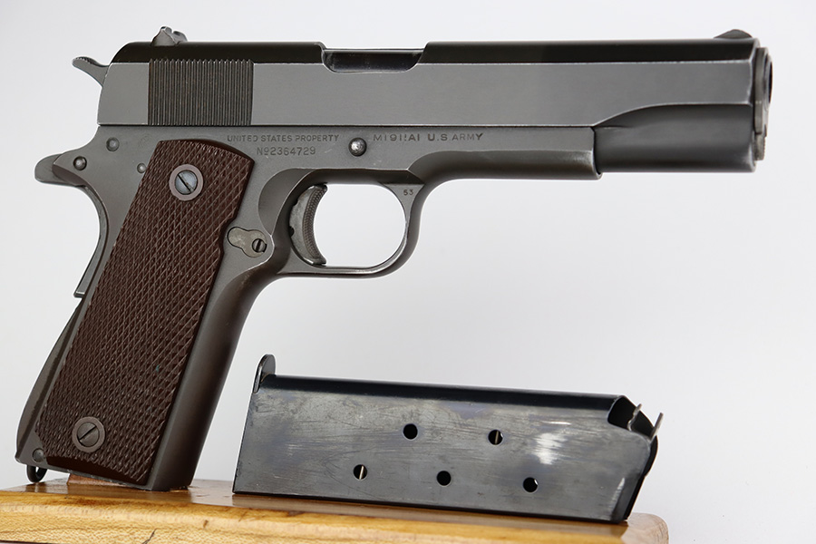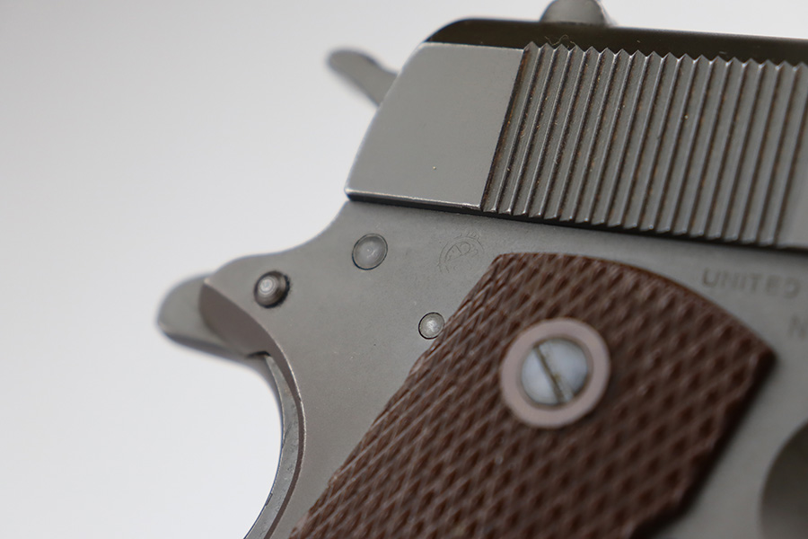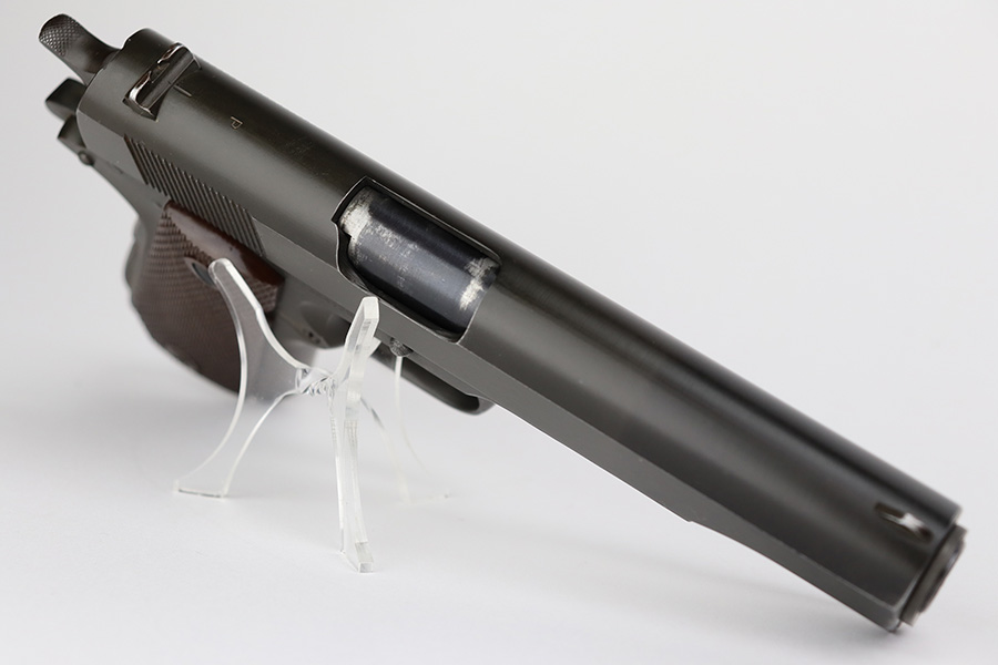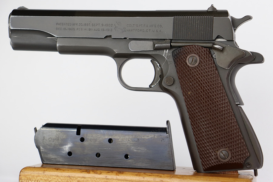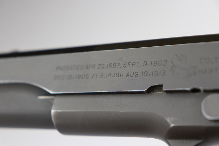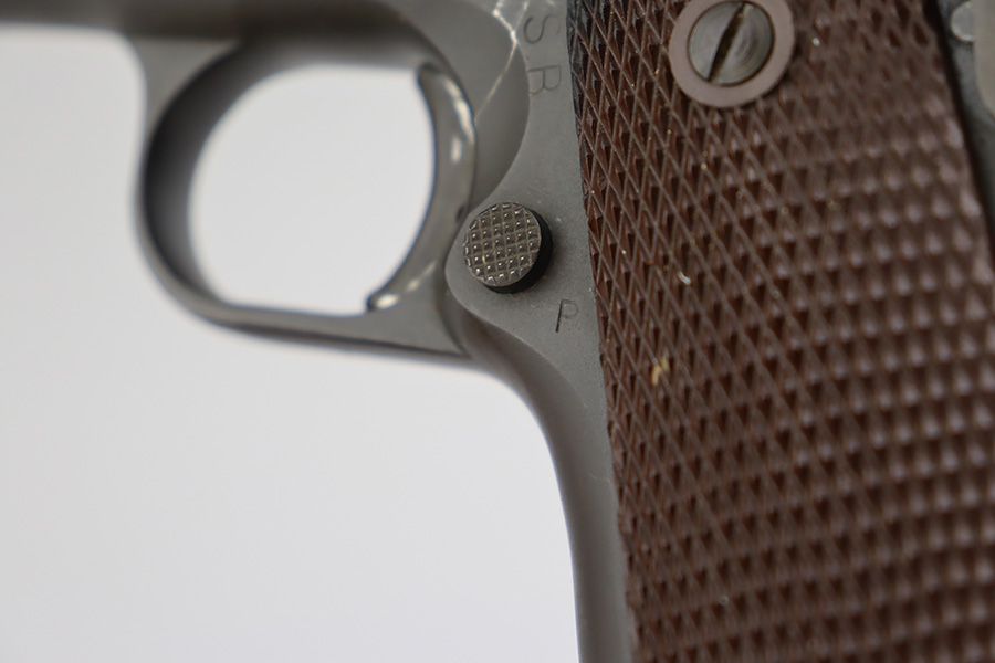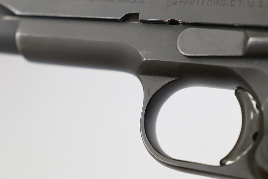 7/25/23 – This is one of the finest known examples of the ultra rare J.S.B. inspected Colt 1911A1. Those initials stand for John S. Begley, who inspected only the very last WW2 military examples produced. It’s estimated that only ~2,000 were produced with his inspector’s mark and these have a low survival rate. This particular example also happens to be in exception conditional, with very minor hints of high edge wear. The correct barrel is present, with P proof on one side of the lug and square C marking on the other side. Minty grips and unmarked magazine. Minty bore. Comes with Colt archives letter that state it was shipped on September 6th, 1945.
