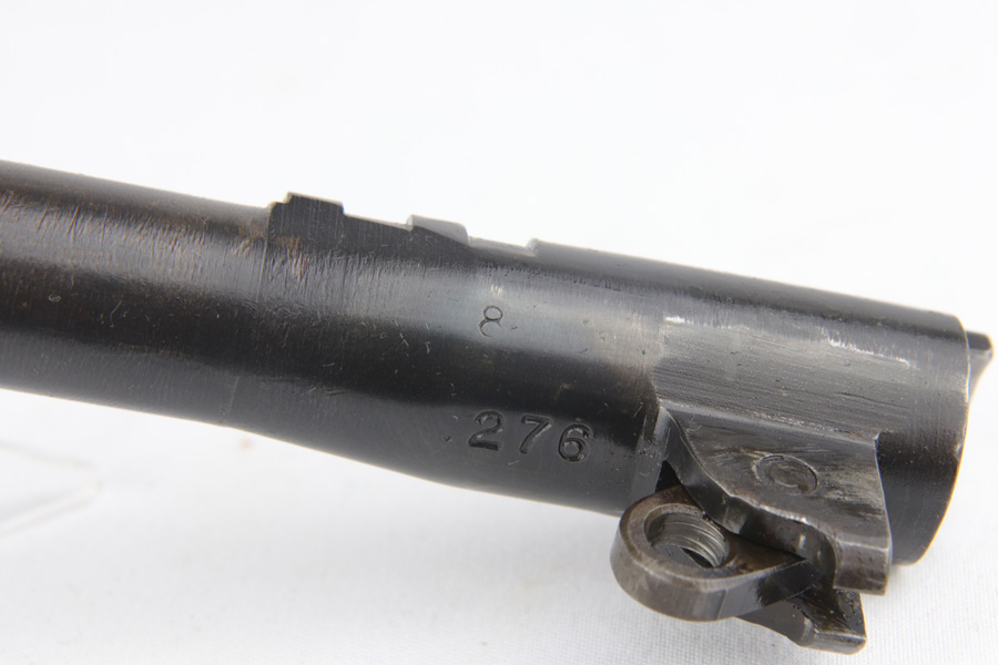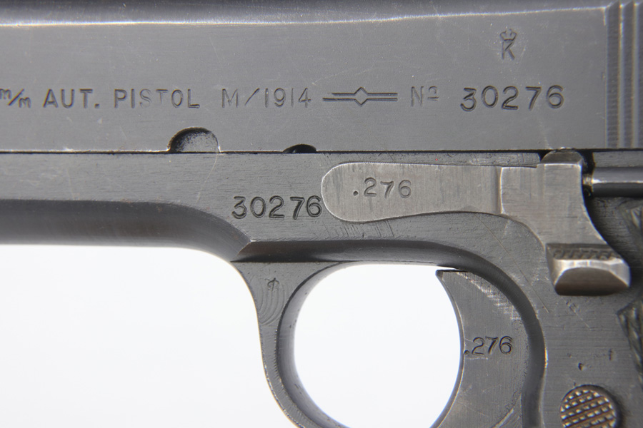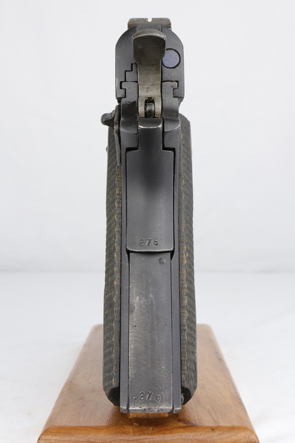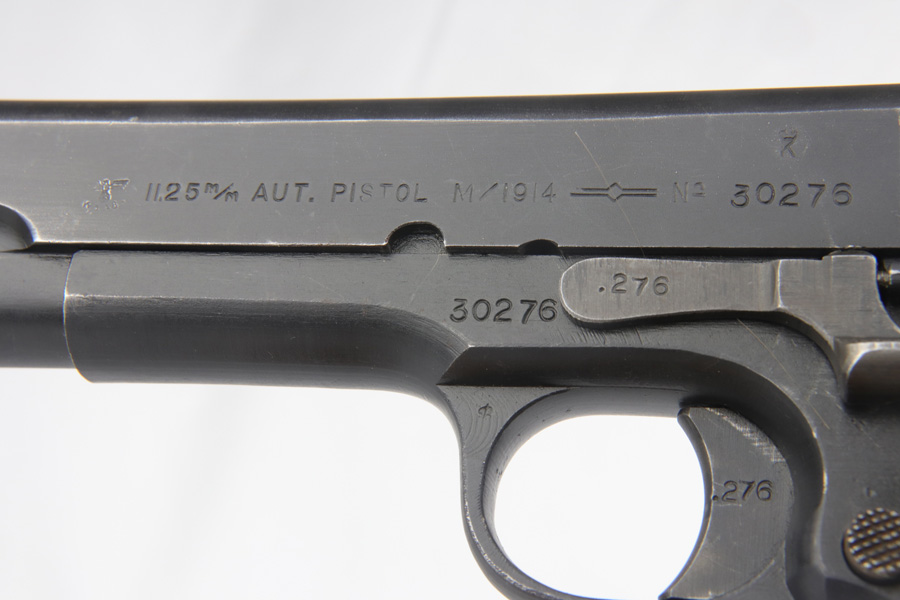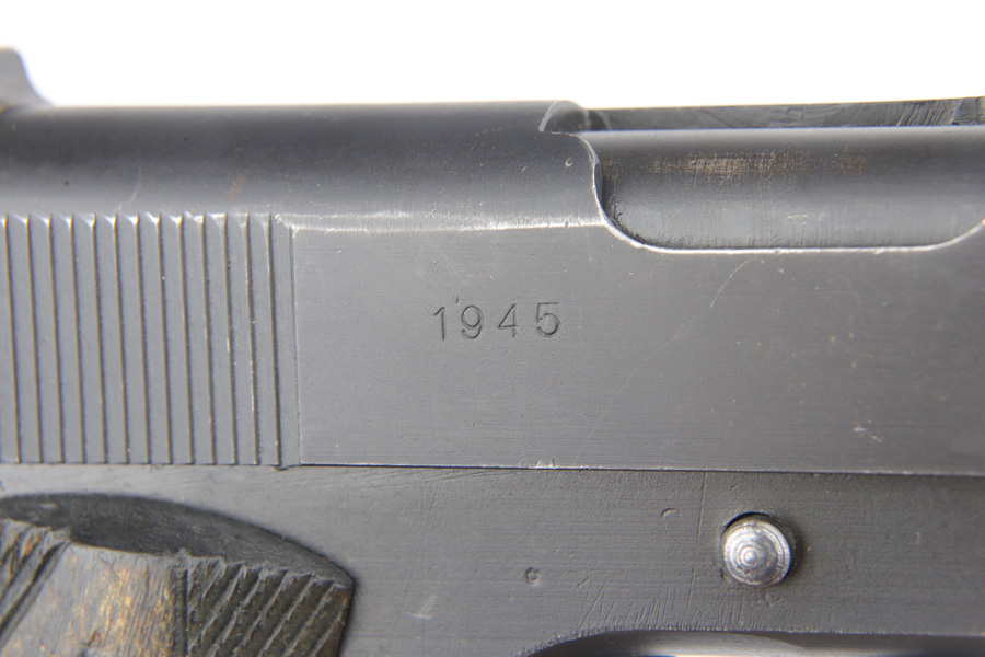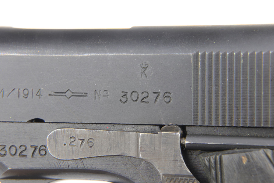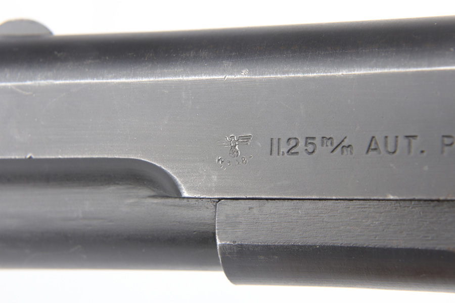 12/10/18 – This is an excellent Kongsberg Colt model 1914, manufactured in 1945 and issued to the Nazi Army. These are rare pistols, and this one is all original and correct. The finish rates at 97+% with minor scuff marks on the slide and frame, and minor high edge wear. Colt licensed out production of the 1911 to Kongsberg Vaapenfabrik in Norway, who in 1945 produced less than 1,000 of this waffen variation according to Jan Still’s book. This particular piece falls in the documented serial range of 29261-30523, where only ~75 have been reported. It has the original matte blue finish and stained birch grips, which have retained a good portion of the dark stain finish. The gun is 1945 dated, and it is stamped along the left side of the slide “11.25m/m AUT. PISTOL M/1914” followed by the serial number, above which is a crown/K inspector proof. To the left of this stamp is an E/WaA84 nazi proof, showing this gun was delivered to the German occupying forces in Norway. The barrel is numbered to the pistol. Bore is excellent, all parts are original and matching and gun comes with original loop magazine.