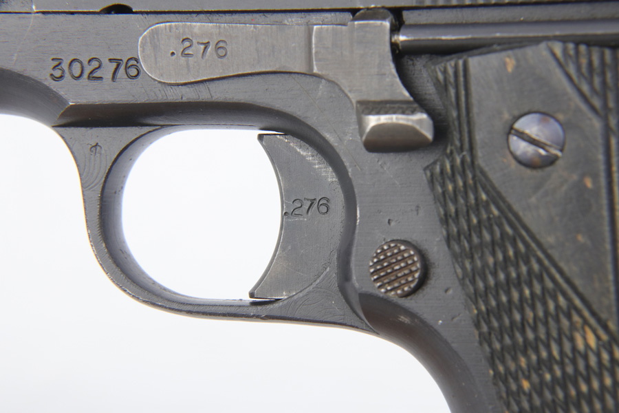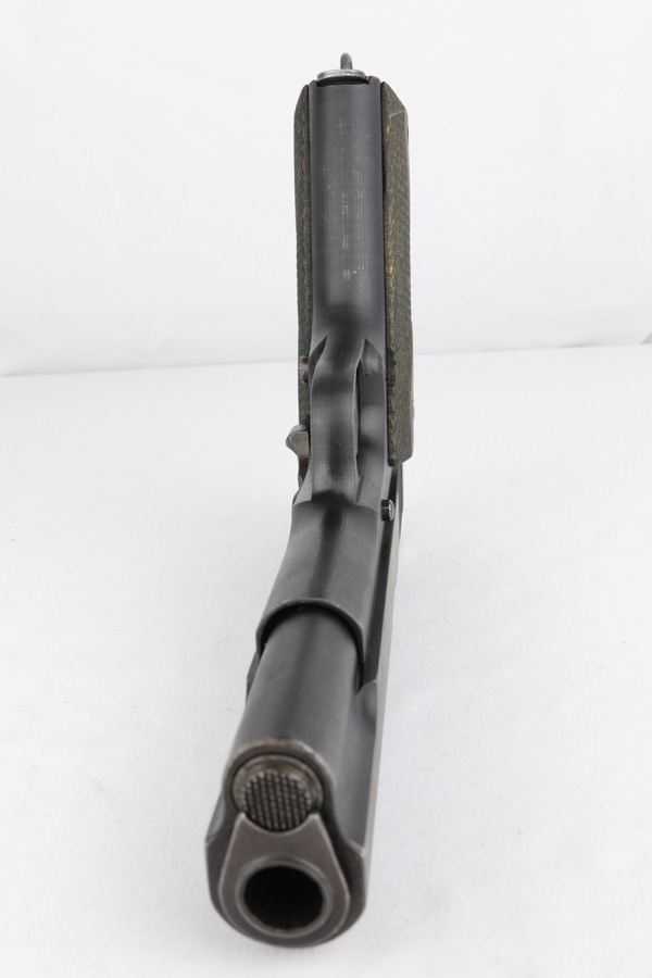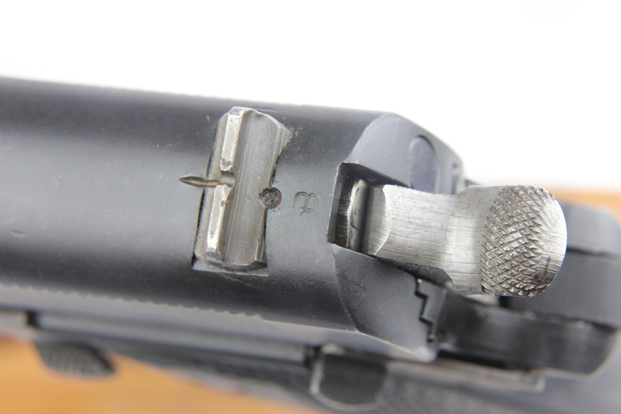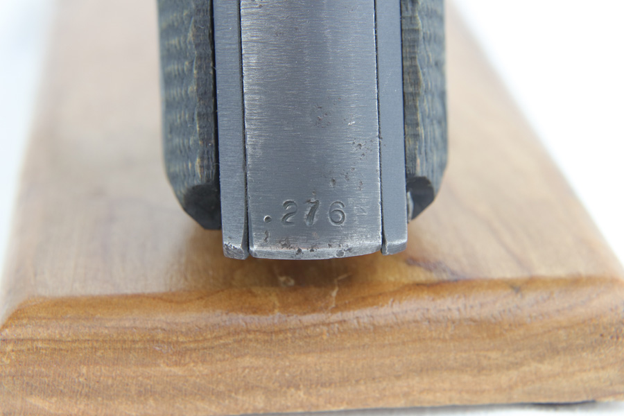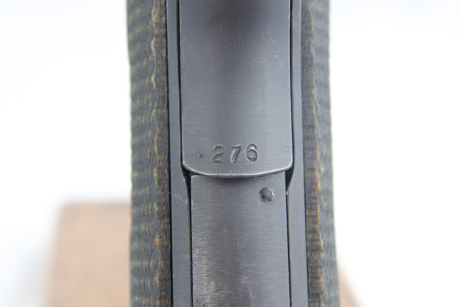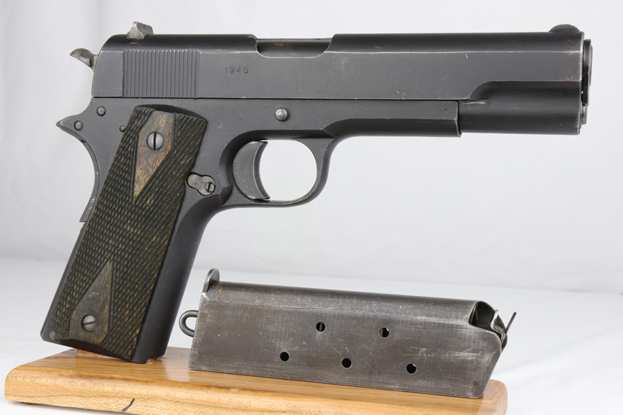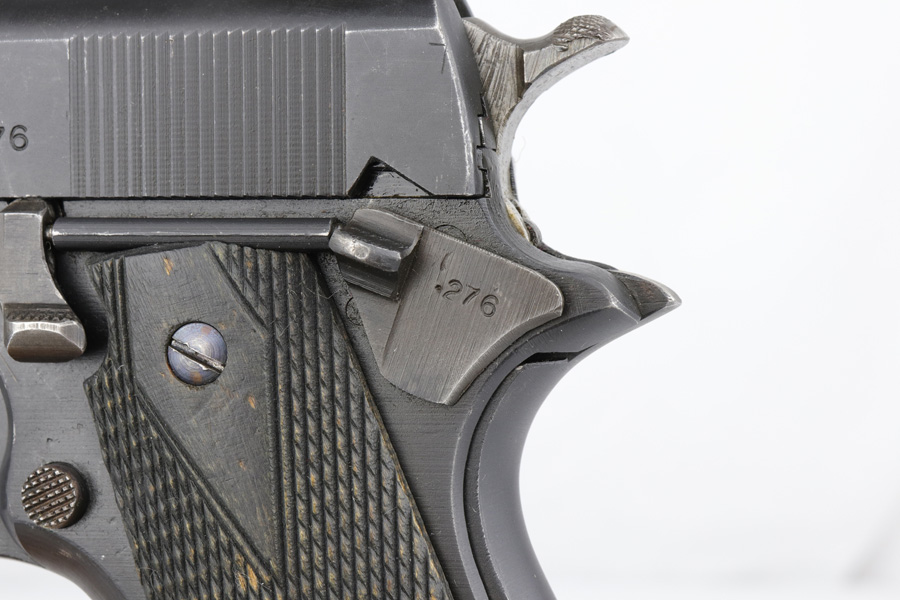 12/10/18 – This is an excellent Kongsberg Colt model 1914, manufactured in 1945 and issued to the Nazi Army. These are rare pistols, and this one is all original and correct. The finish rates at 97+% with minor scuff marks on the slide and frame, and minor high edge wear. Colt licensed out production of the 1911 to Kongsberg Vaapenfabrik in Norway, who in 1945 produced less than 1,000 of this waffen variation according to Jan Still’s book. This particular piece falls in the documented serial range of 29261-30523, where only ~75 have been reported. It has the original matte blue finish and stained birch grips, which have retained a good portion of the dark stain finish. The gun is 1945 dated, and it is stamped along the left side of the slide “11.25m/m AUT. PISTOL M/1914” followed by the serial number, above which is a crown/K inspector proof. To the left of this stamp is an E/WaA84 nazi proof, showing this gun was delivered to the German occupying forces in Norway. The barrel is numbered to the pistol. Bore is excellent, all parts are original and matching and gun comes with original loop magazine.