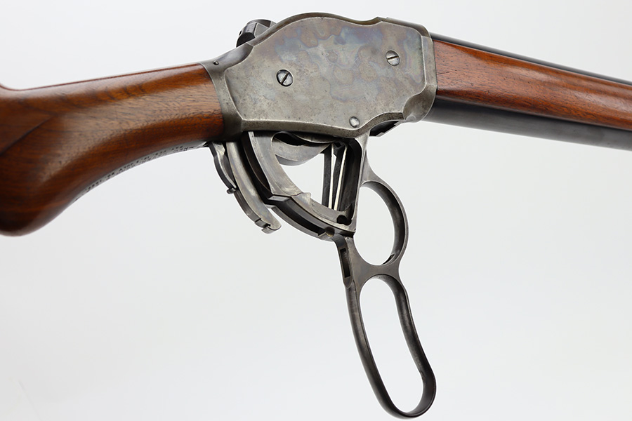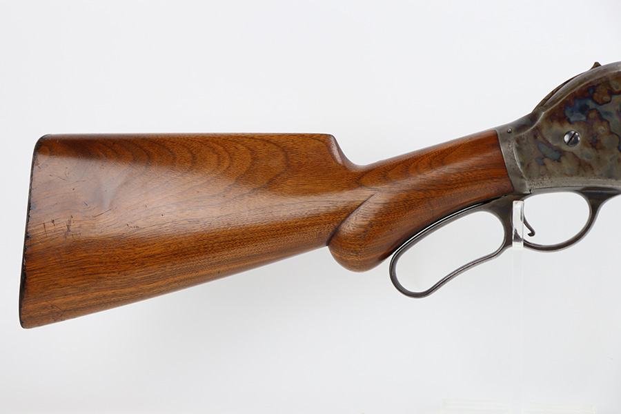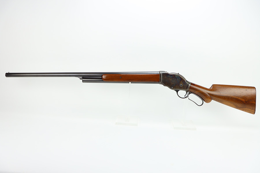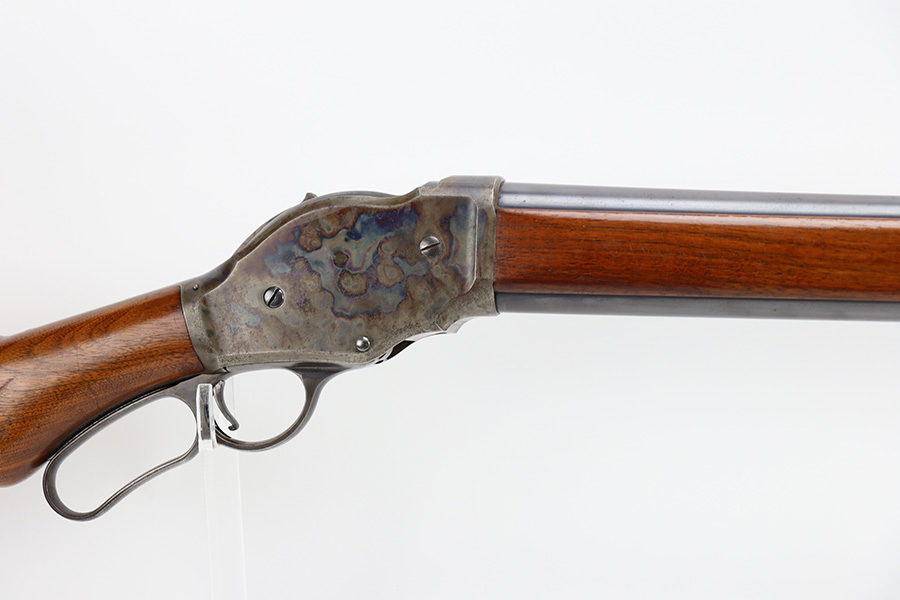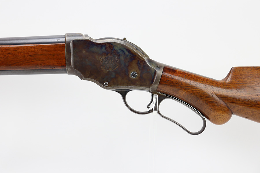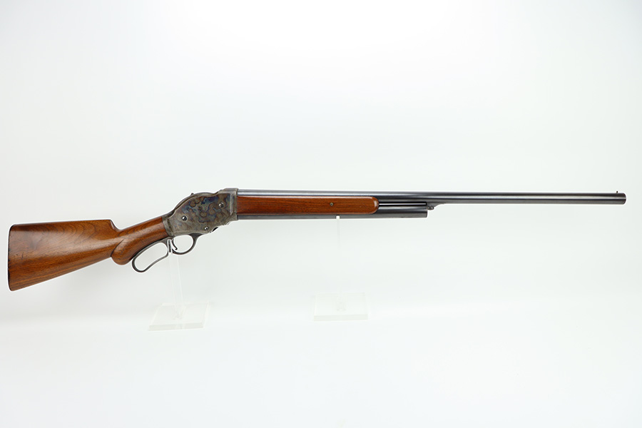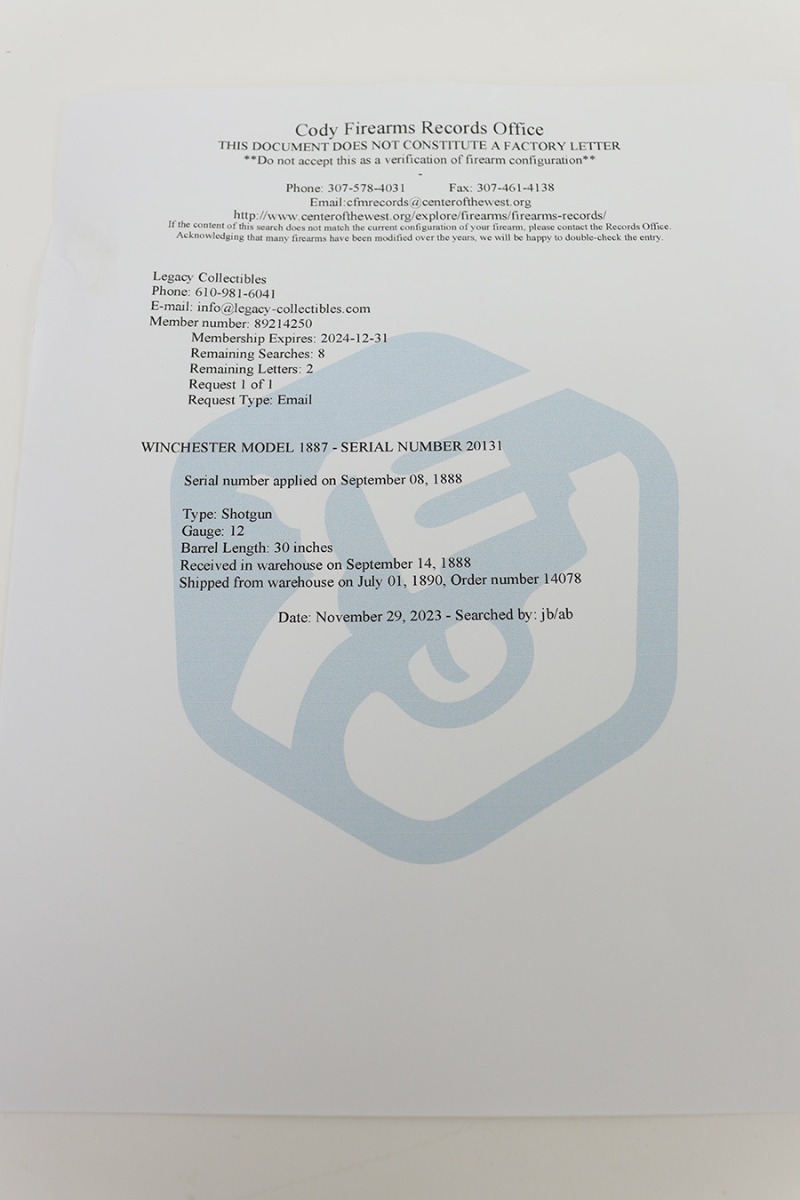 12/5/23 – This is a fantastic example of a rare and early Winchester Model 1887 lever-action shotgun from 1888, the 2nd year of production. The Model 1887 was the first lever-action repeating shotgun produced by Winchester. Only 64,855 of these were made from 1887-1901, and this is a particularly high condition example with deluxe case-hardened receiver. Most prior shotguns were single or double barrel break actions. The Model 1887 held six shots and could be fired rapidly. The Model 1887 built upon the solid reputation of Winchester’s lever action rifles and carbines that were already in widespread use throughout the country. Many Model 1887s replaced double barrel coach guns used by “shotgun messengers” employed by express companies and lawmen throughout the country. The left side of the receiver has the “WRACo” monogram. The lower tang is stamped with the four-line address/patent dates marking. The receiver has beautiful case-hardening that even extends to the internals of the action. Excellent bluing overall with some finish loss and freckling on the mag tube. The receiver also shows some minor pinpricking on the right side. The bore is somewhat shiny but there are a few patches of pitting. Excellent wood furniture with no notable defects. Cody letter states the serial was applied in 1888 but shipped in 1890.