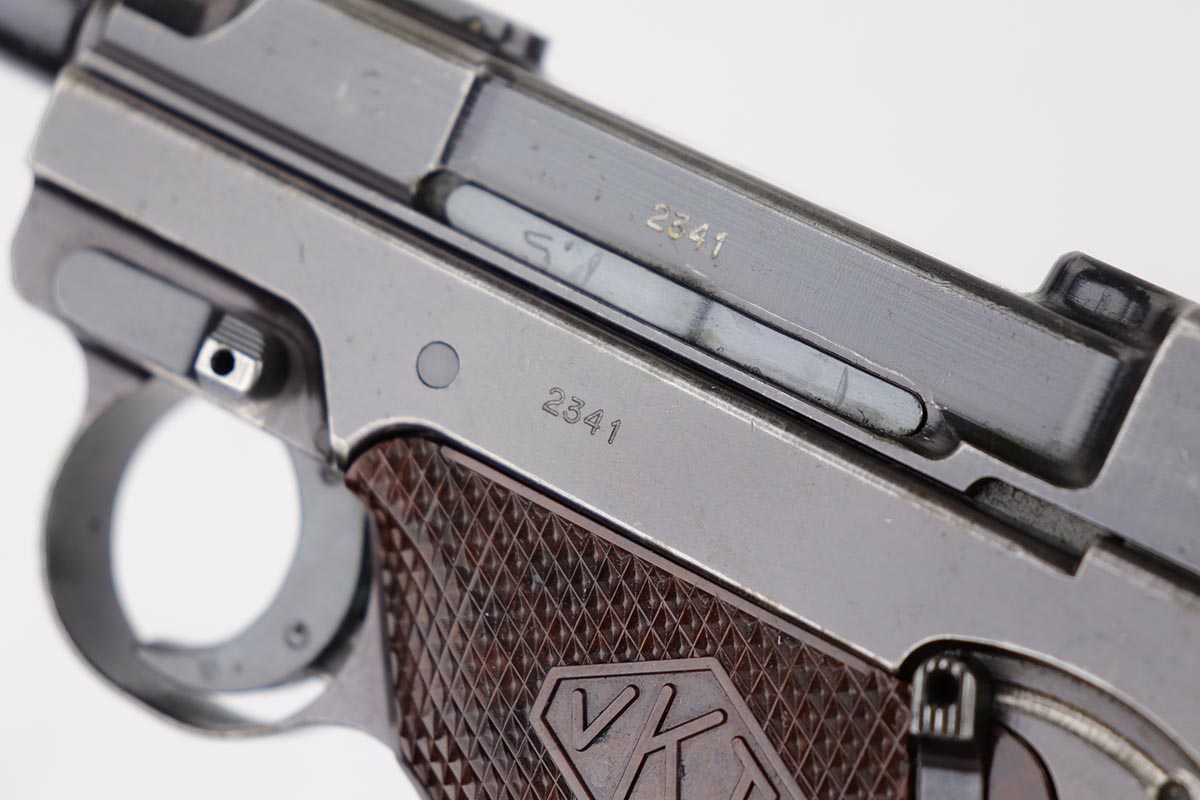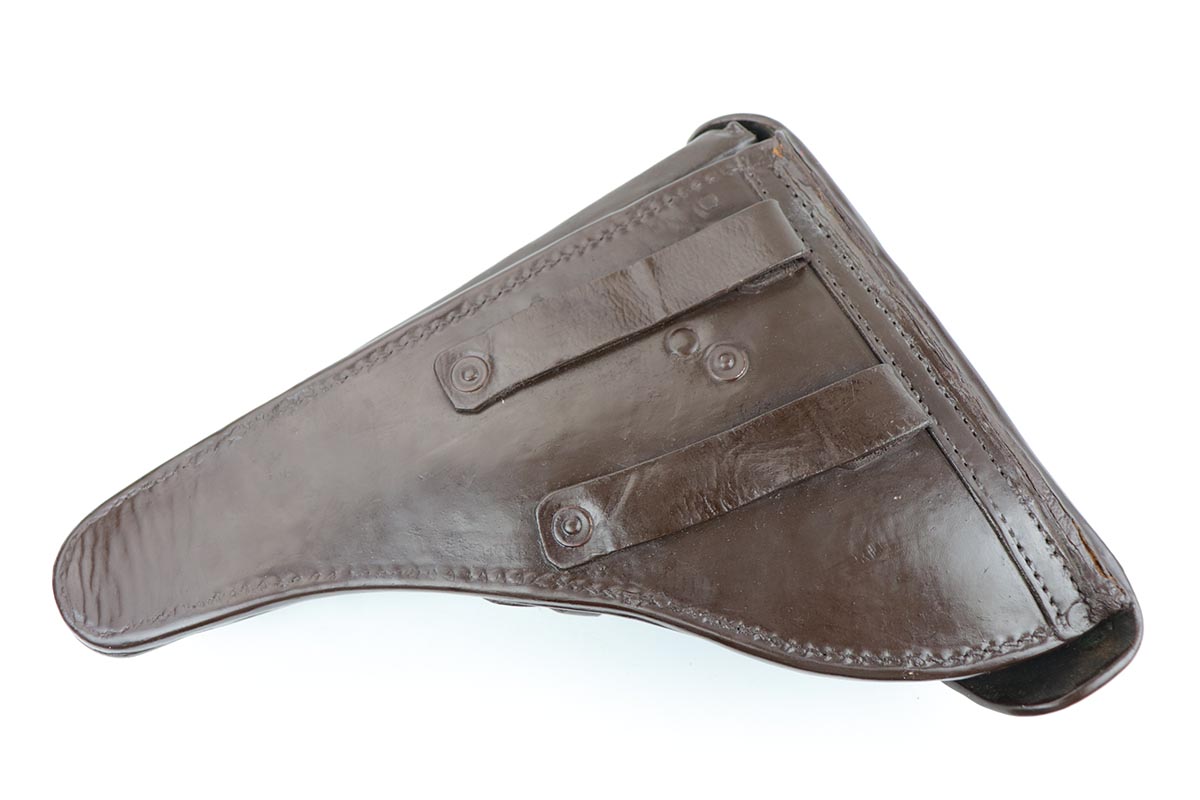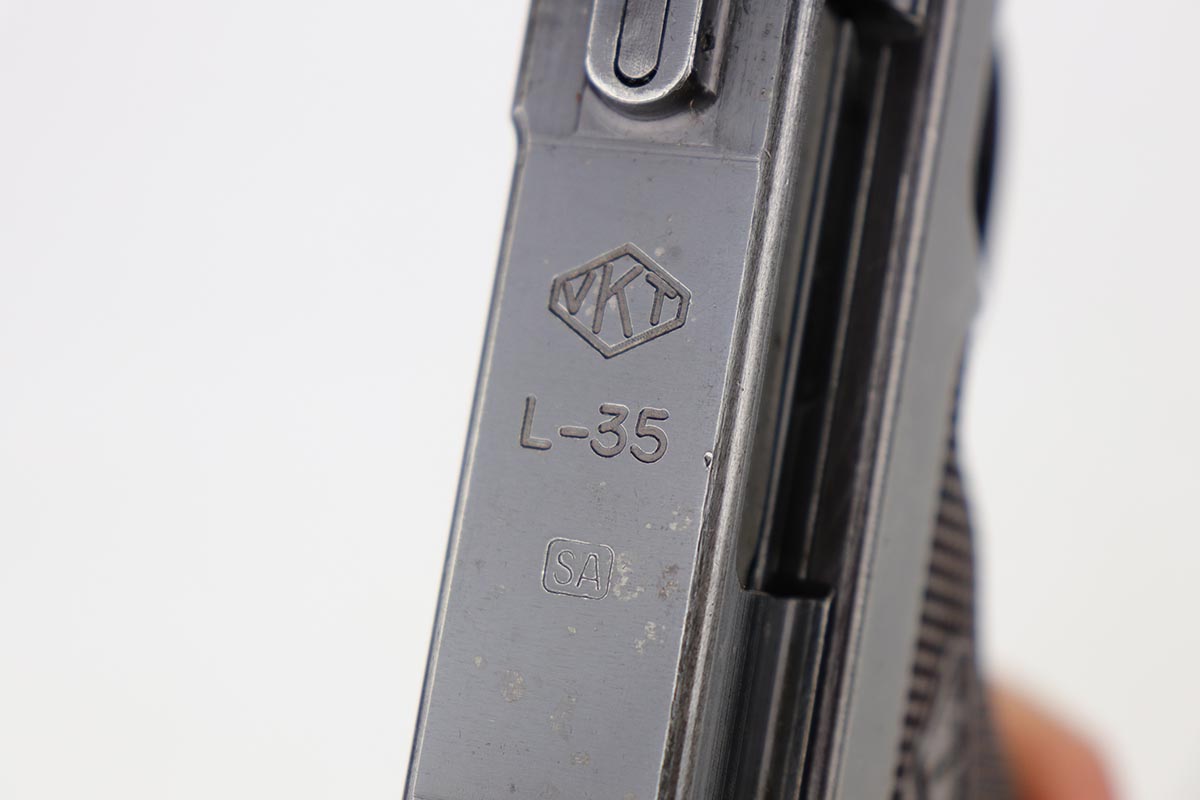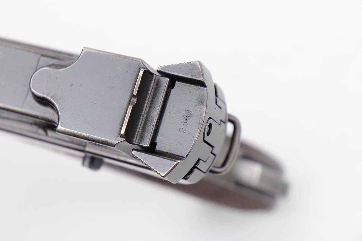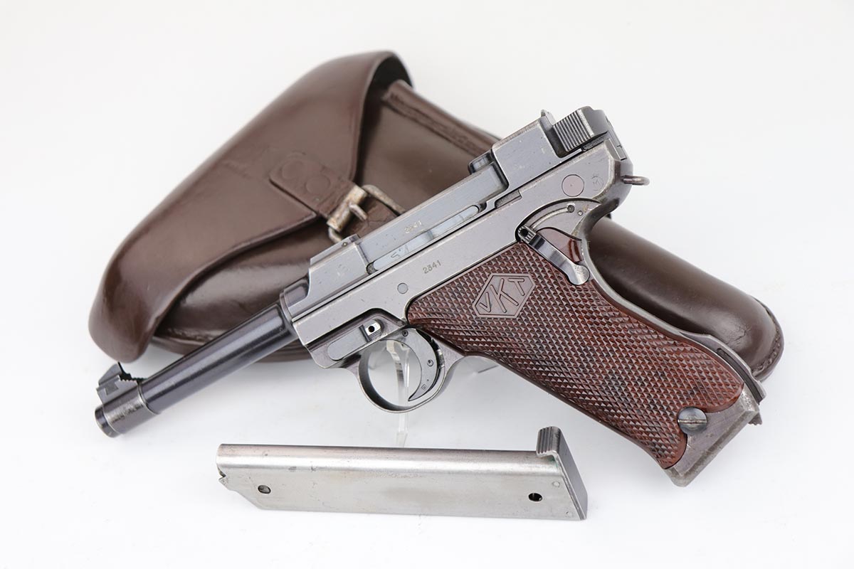 2/26/20 – This is, by far, the rarest of all Lahti pistols. The first variation Finnish military guns are practically non-existent in US, as only about 1,500 were made before the Winter War and many were lost in battle with the surviving guns either captured by Russians or still remaining in Finnish Arsenals. This particular pistol is all original and matching, retaining 85-90% of its original blue, with a very nice profile but some thinning to the straps. There is no pitting. These guns were different from the later variations in its contour on the top of the slide, in addition to having a shoulder stock lug. This gun is correctly proofed, with small parts properly serialized. It is also SA marked on top of the slide. Excellent VKT marked grips without defects. Excellent bore. The L-35 Lahti was built like a tank with an accelerator installed to assist in returning the slide to battery in frigid winter weather. This uncommon gun comes with an original, excellent condition, Finnish holster, which is SA marked on the flap as well. One of the rarest military guns to find in this country, it can be a centerpiece of any WWII collection.