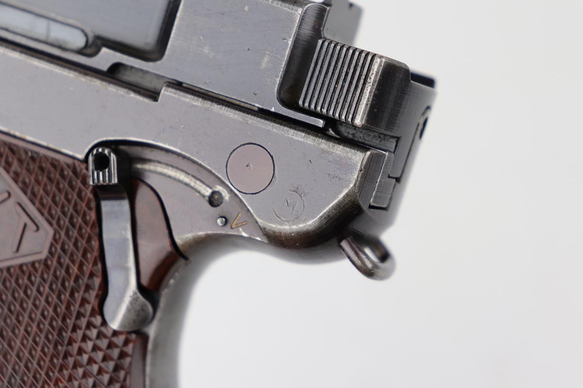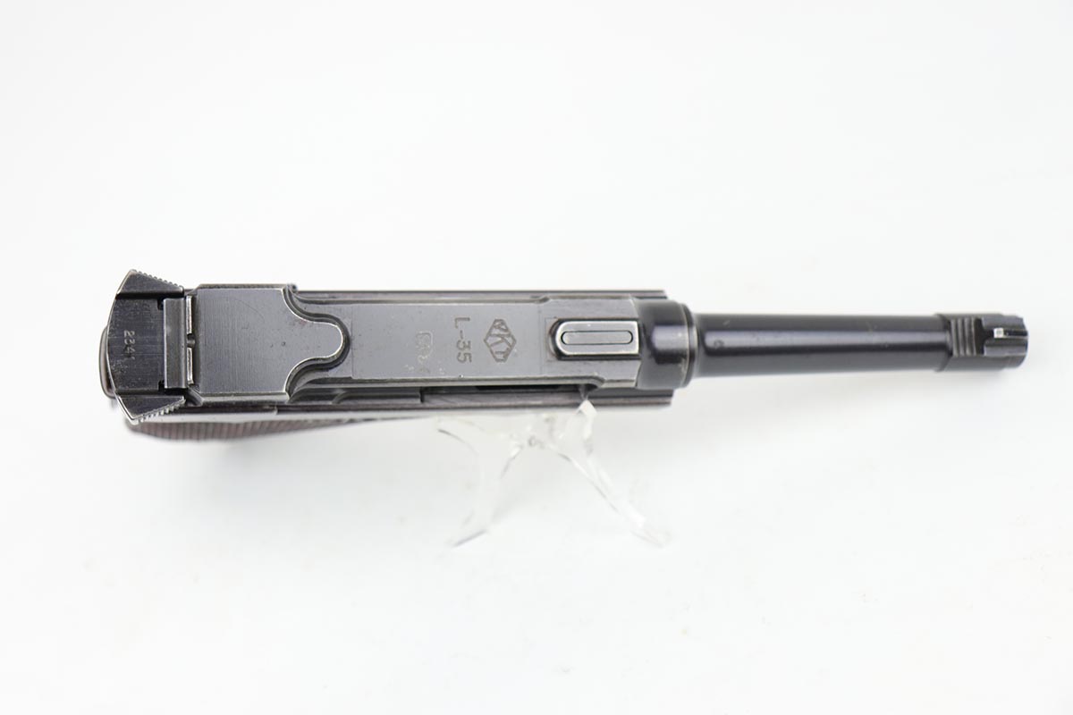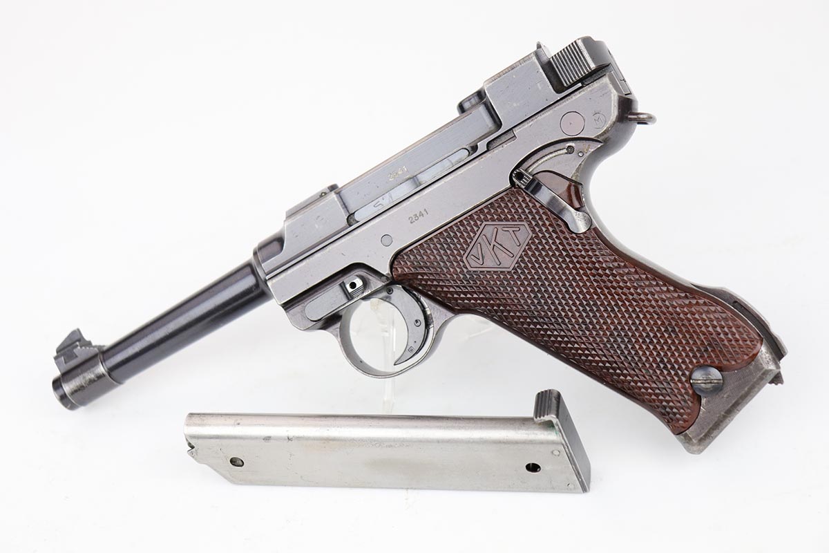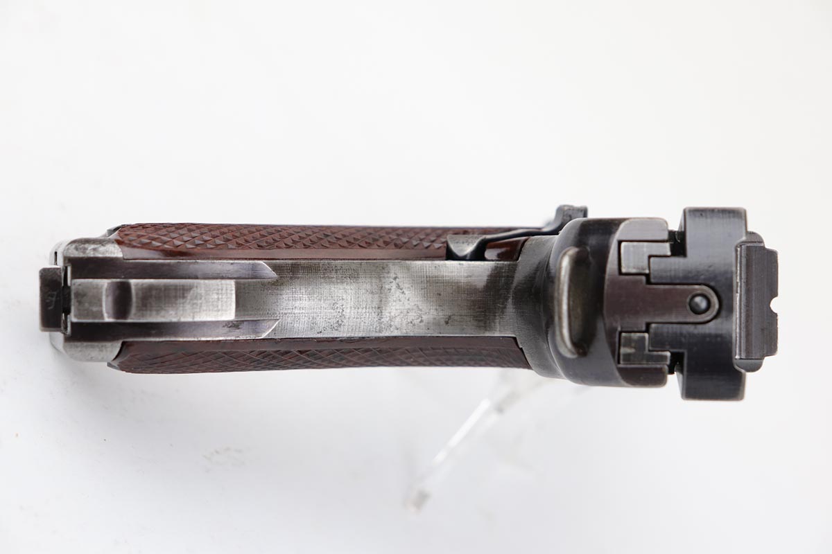 2/26/20 – This is, by far, the rarest of all Lahti pistols. The first variation Finnish military guns are practically non-existent in US, as only about 1,500 were made before the Winter War and many were lost in battle with the surviving guns either captured by Russians or still remaining in Finnish Arsenals. This particular pistol is all original and matching, retaining 85-90% of its original blue, with a very nice profile but some thinning to the straps. There is no pitting. These guns were different from the later variations in its contour on the top of the slide, in addition to having a shoulder stock lug. This gun is correctly proofed, with small parts properly serialized. It is also SA marked on top of the slide. Excellent VKT marked grips without defects. Excellent bore. The L-35 Lahti was built like a tank with an accelerator installed to assist in returning the slide to battery in frigid winter weather. This uncommon gun comes with an original, excellent condition, Finnish holster, which is SA marked on the flap as well. One of the rarest military guns to find in this country, it can be a centerpiece of any WWII collection.