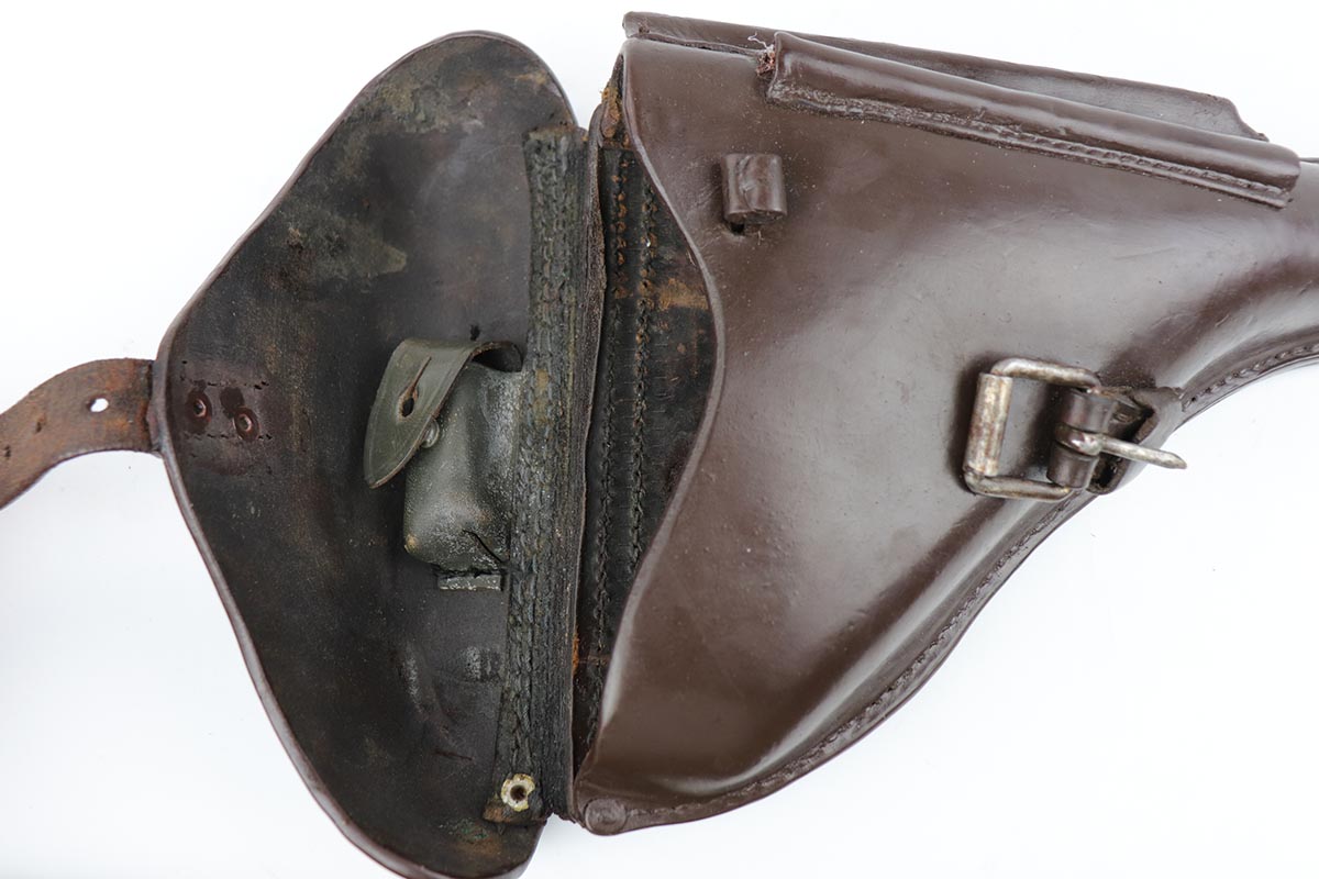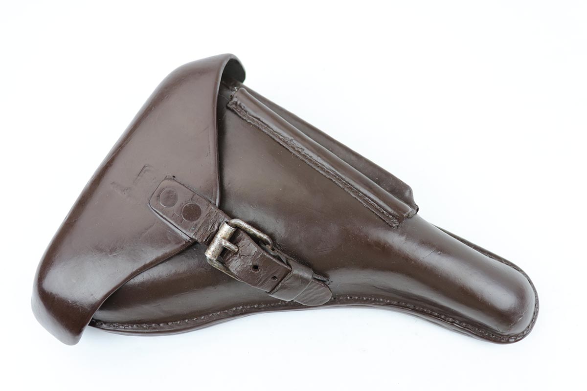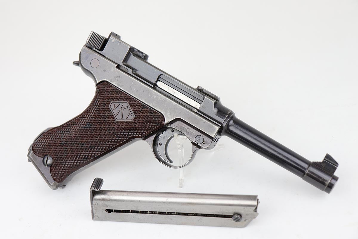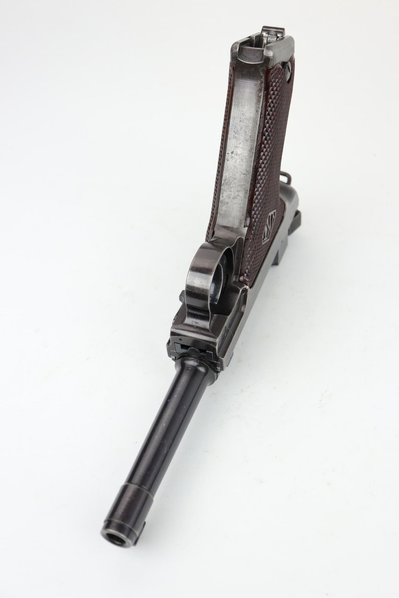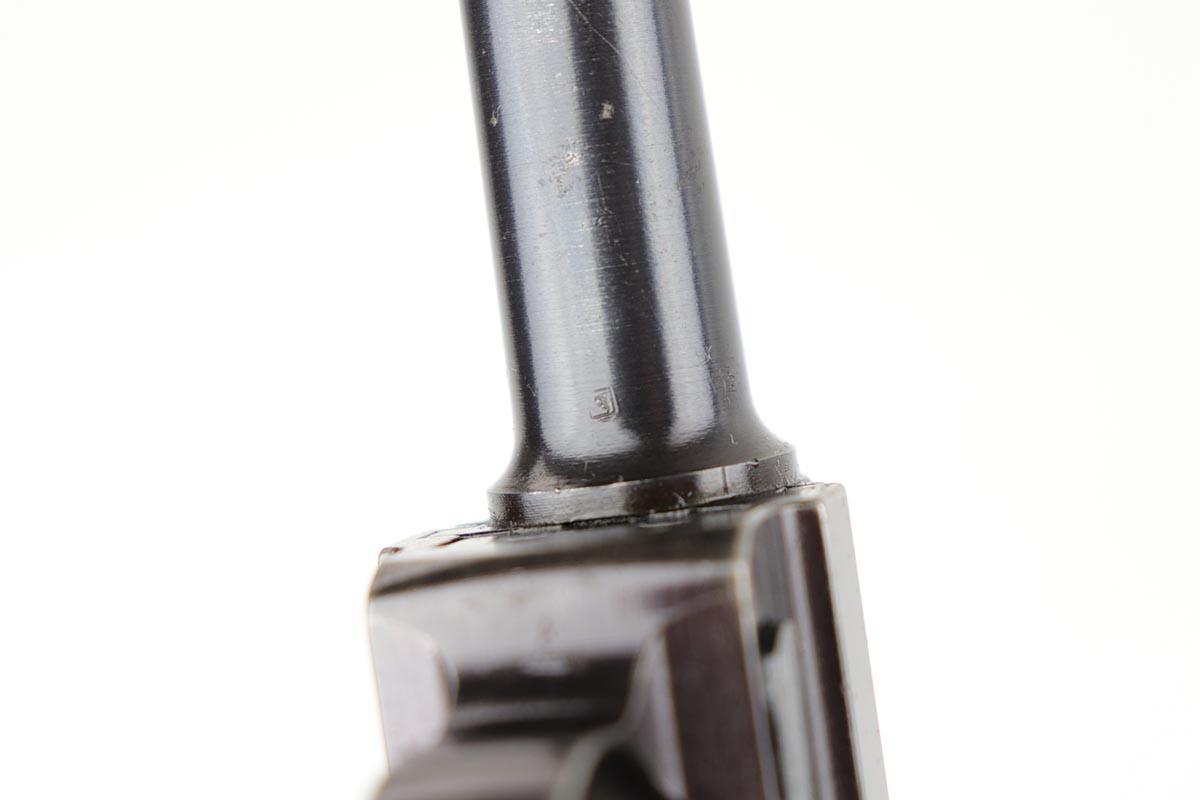 2/26/20 – This is, by far, the rarest of all Lahti pistols. The first variation Finnish military guns are practically non-existent in US, as only about 1,500 were made before the Winter War and many were lost in battle with the surviving guns either captured by Russians or still remaining in Finnish Arsenals. This particular pistol is all original and matching, retaining 85-90% of its original blue, with a very nice profile but some thinning to the straps. There is no pitting. These guns were different from the later variations in its contour on the top of the slide, in addition to having a shoulder stock lug. This gun is correctly proofed, with small parts properly serialized. It is also SA marked on top of the slide. Excellent VKT marked grips without defects. Excellent bore. The L-35 Lahti was built like a tank with an accelerator installed to assist in returning the slide to battery in frigid winter weather. This uncommon gun comes with an original, excellent condition, Finnish holster, which is SA marked on the flap as well. One of the rarest military guns to find in this country, it can be a centerpiece of any WWII collection.