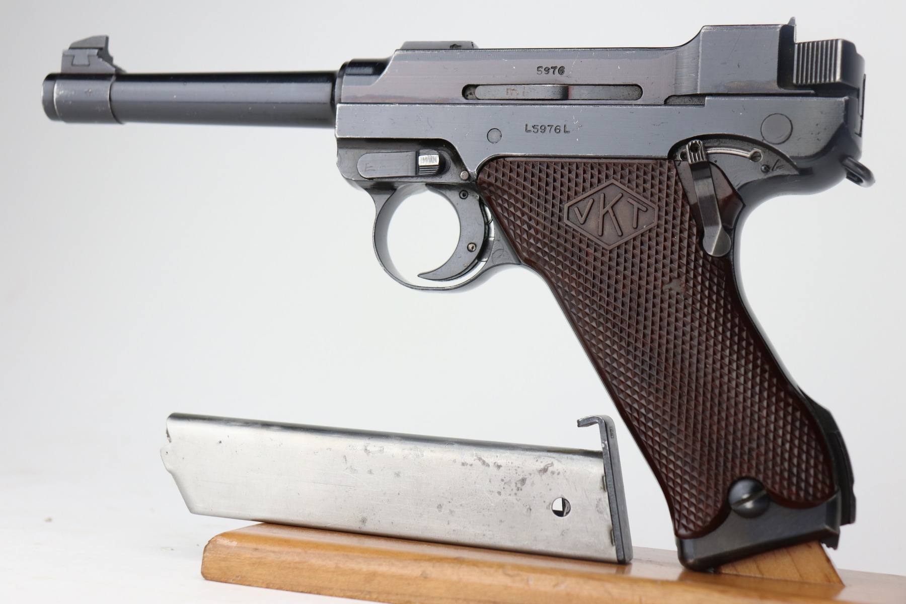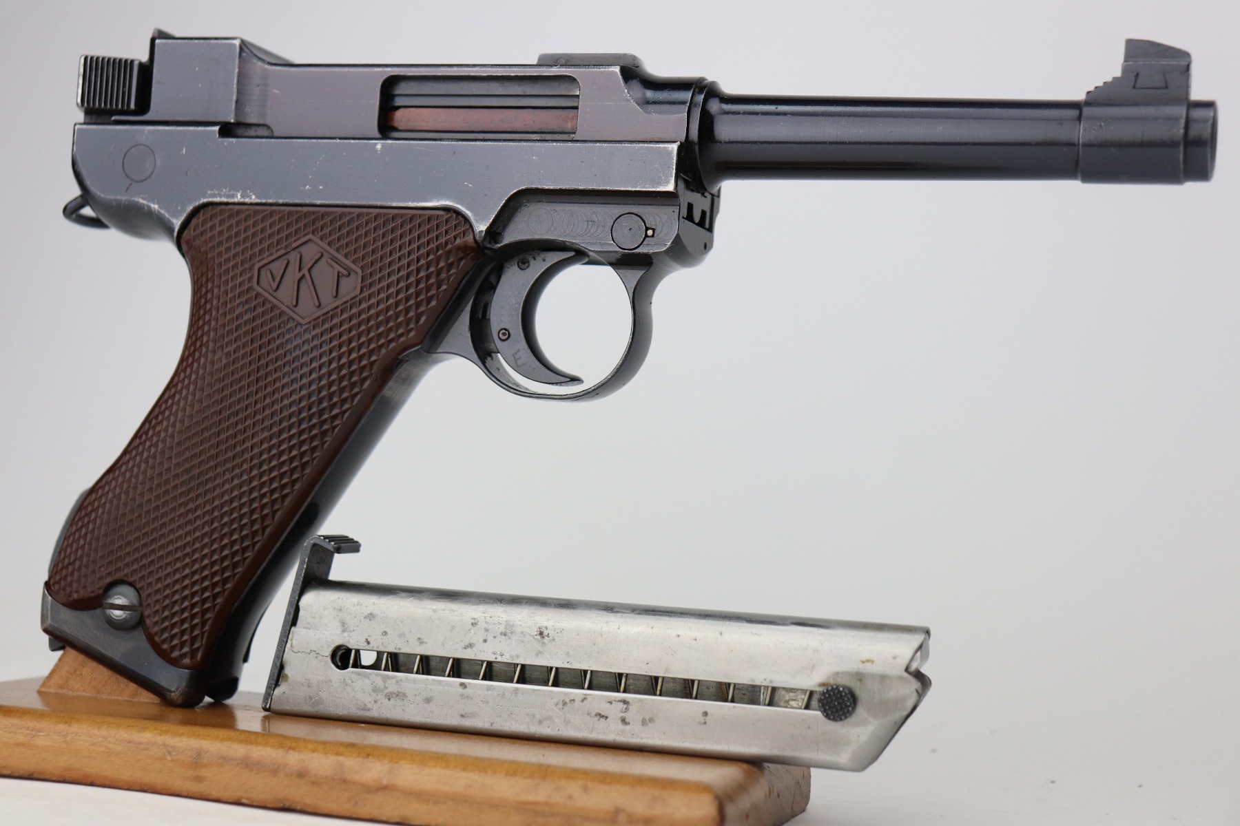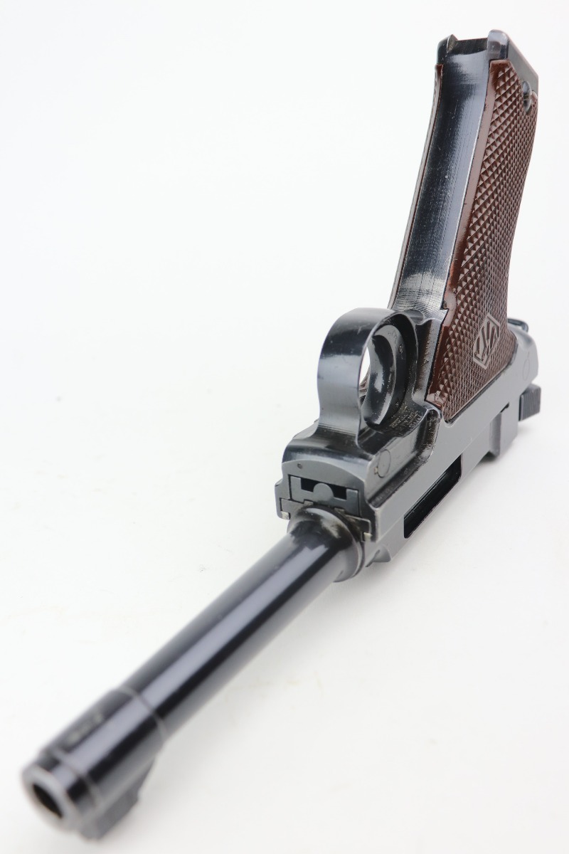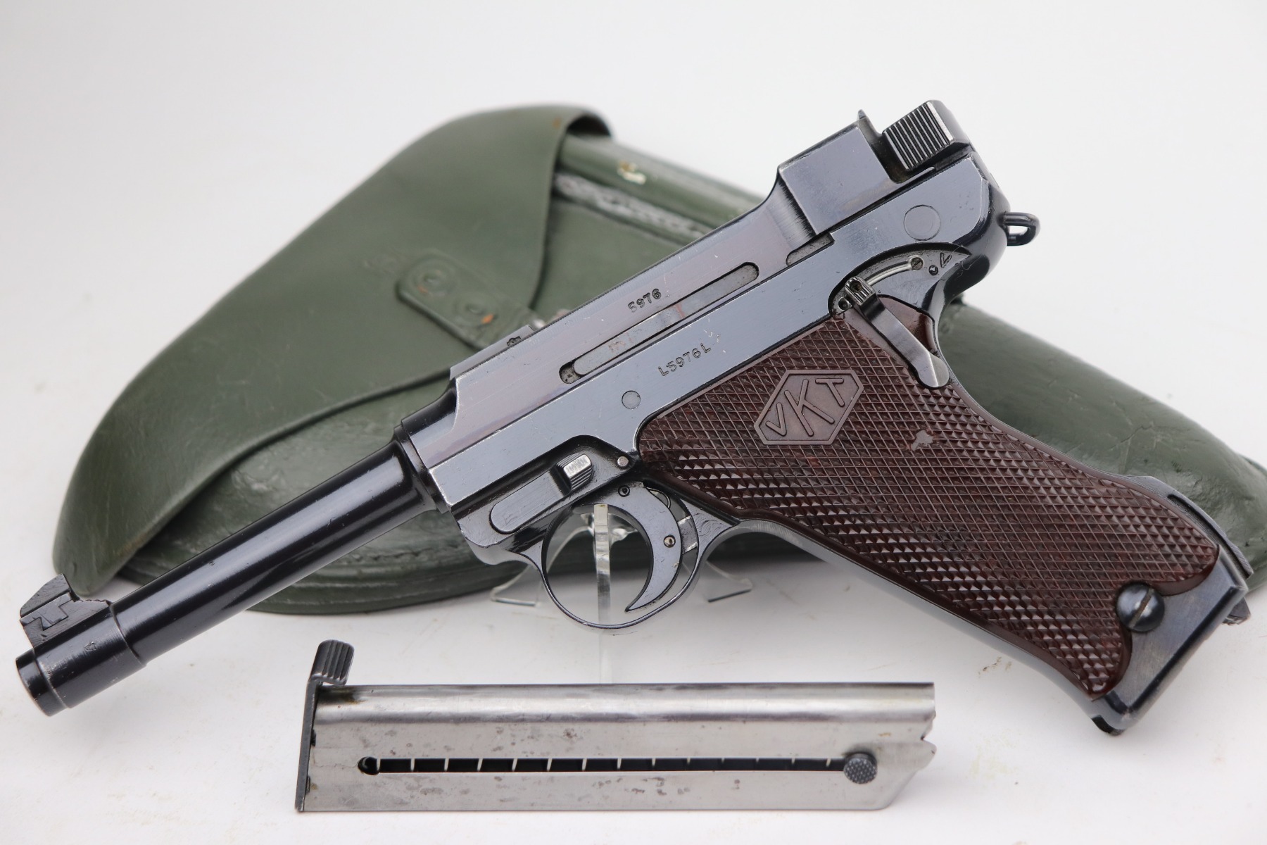 3/19/21 – This is an excellent example of a rare Finnish VKT L-35 Rig, made in the 1940’s. This Finnish designed and manufactured pistol (a copy of the Lahti) was issued to Finnish military frontline-units during Winter War (1939 – 1940) in very small numbers and in growing numbers during Continuation War (1941 – 1944). After World War it remained in use of Finnish Armed Forces until 1980’s. This is a Series 3 pistol, characterized by the VKT makers mark and SA marking on the top of the slide. Only a little more than 2,000 of these guns were manufactured. The gun is all matching and has retained about 95% of its original finish. There is minor wear on the straps, around the muzzle, and on the high edges. Some light handling marks here and there. Comes with excellent VKT grips – small chip in the left panel. The rig comes with a rare green “SA” marked holster and a proper “SA” marked magazine. The bore is excellent – shiny with strong rifling.