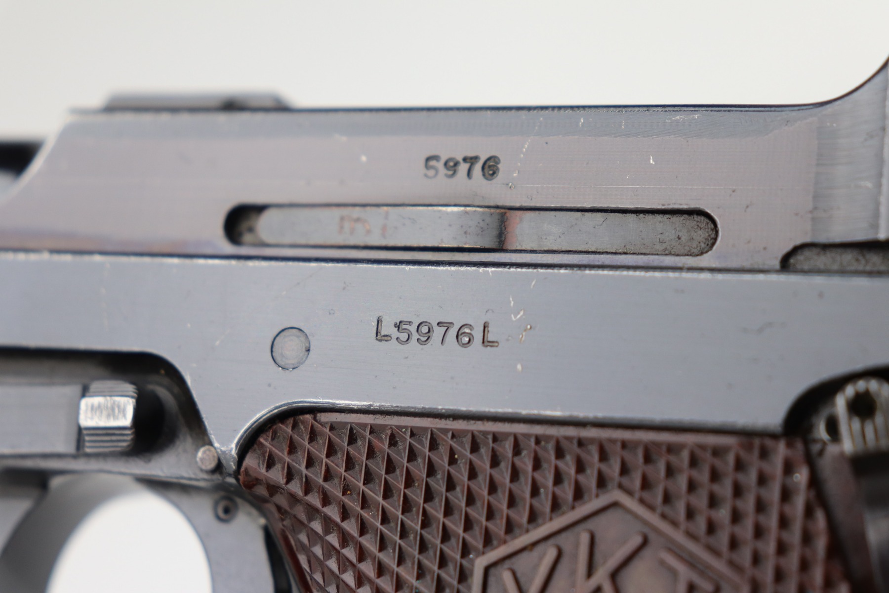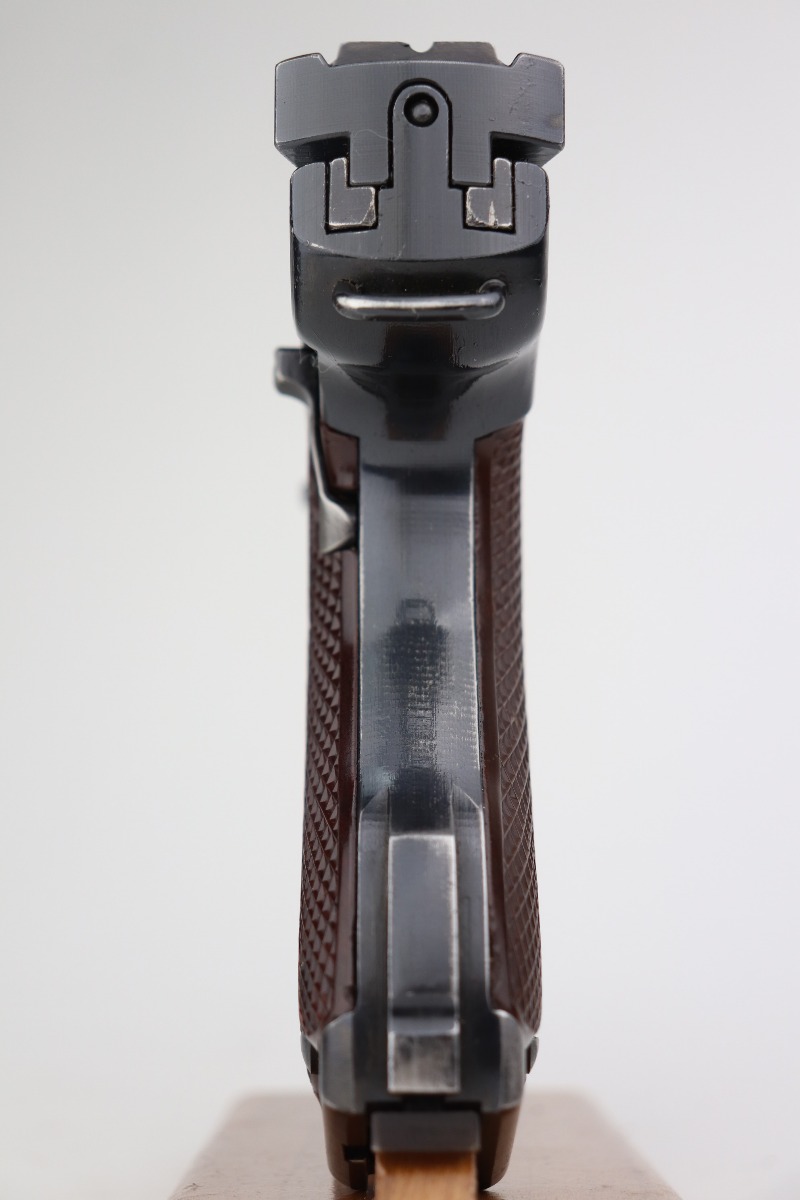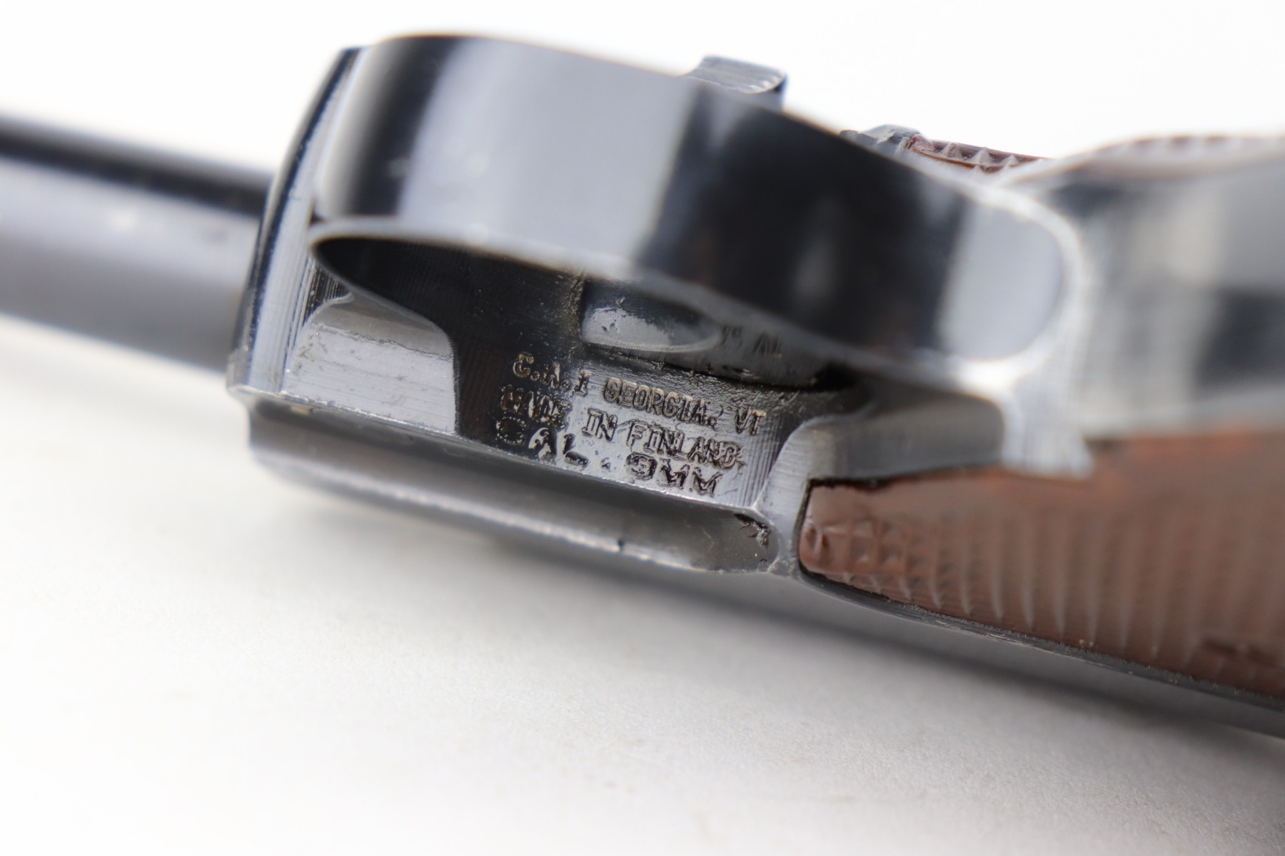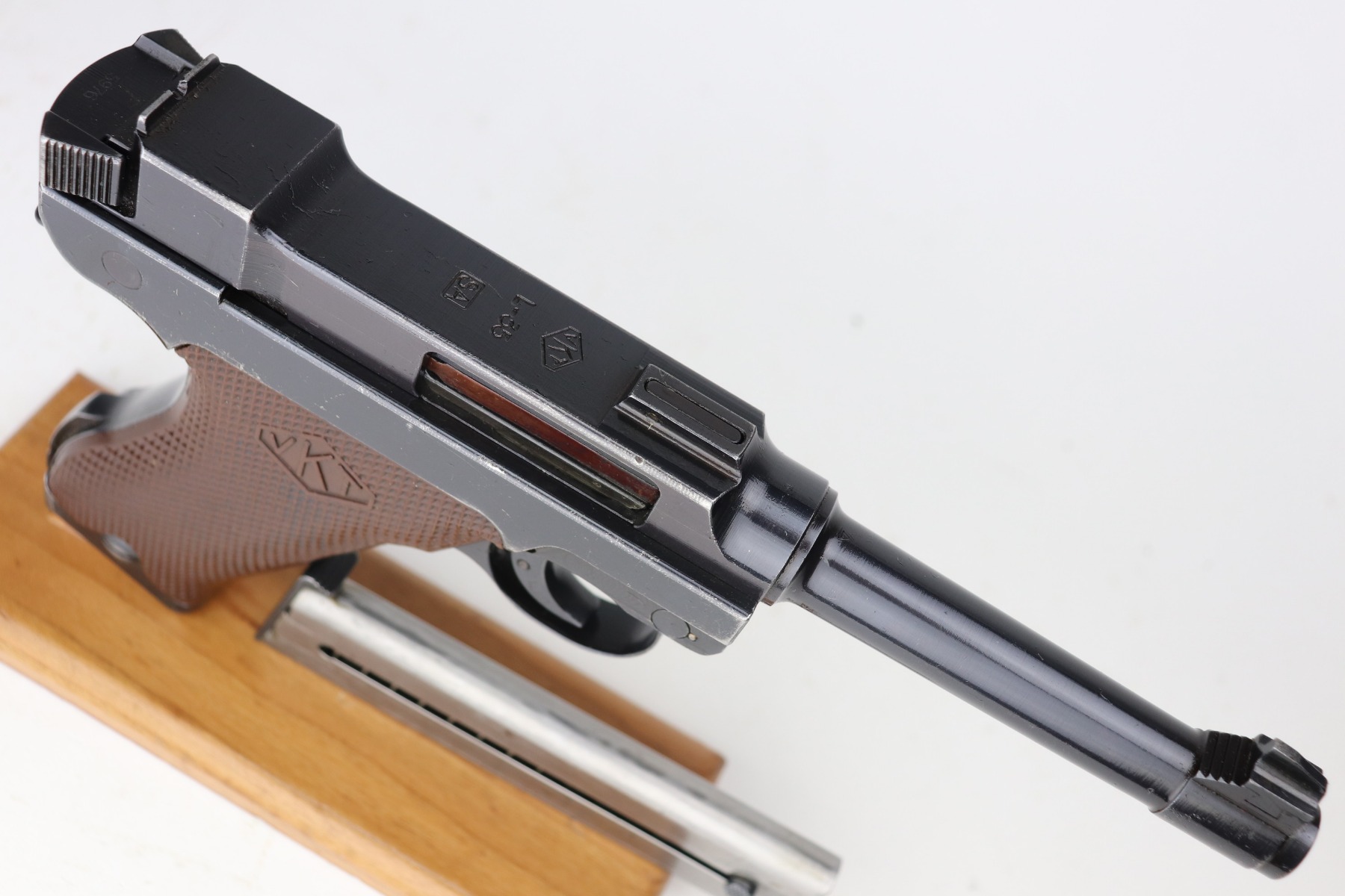 3/19/21 – This is an excellent example of a rare Finnish VKT L-35 Rig, made in the 1940’s. This Finnish designed and manufactured pistol (a copy of the Lahti) was issued to Finnish military frontline-units during Winter War (1939 – 1940) in very small numbers and in growing numbers during Continuation War (1941 – 1944). After World War it remained in use of Finnish Armed Forces until 1980’s. This is a Series 3 pistol, characterized by the VKT makers mark and SA marking on the top of the slide. Only a little more than 2,000 of these guns were manufactured. The gun is all matching and has retained about 95% of its original finish. There is minor wear on the straps, around the muzzle, and on the high edges. Some light handling marks here and there. Comes with excellent VKT grips – small chip in the left panel. The rig comes with a rare green “SA” marked holster and a proper “SA” marked magazine. The bore is excellent – shiny with strong rifling.