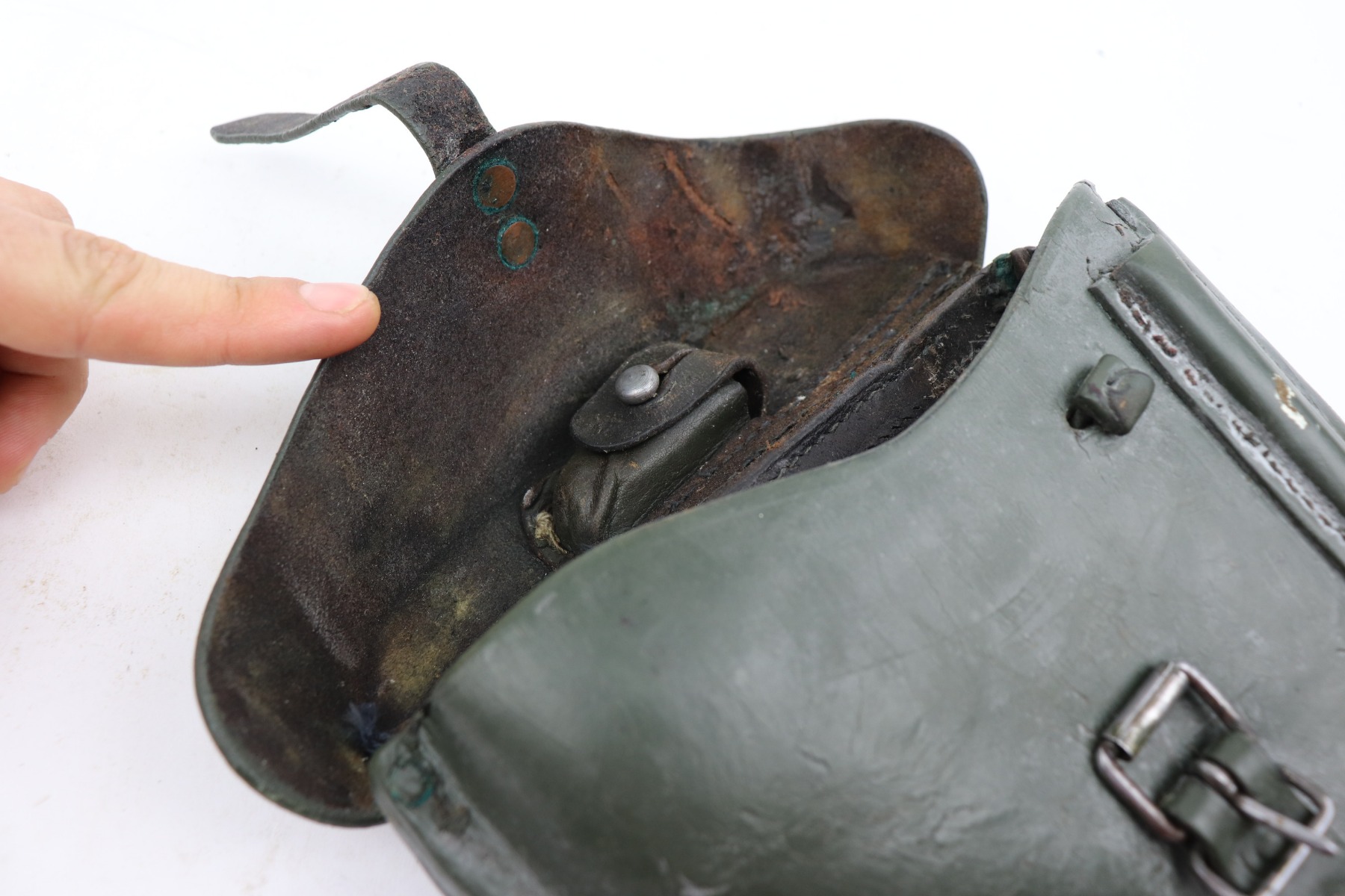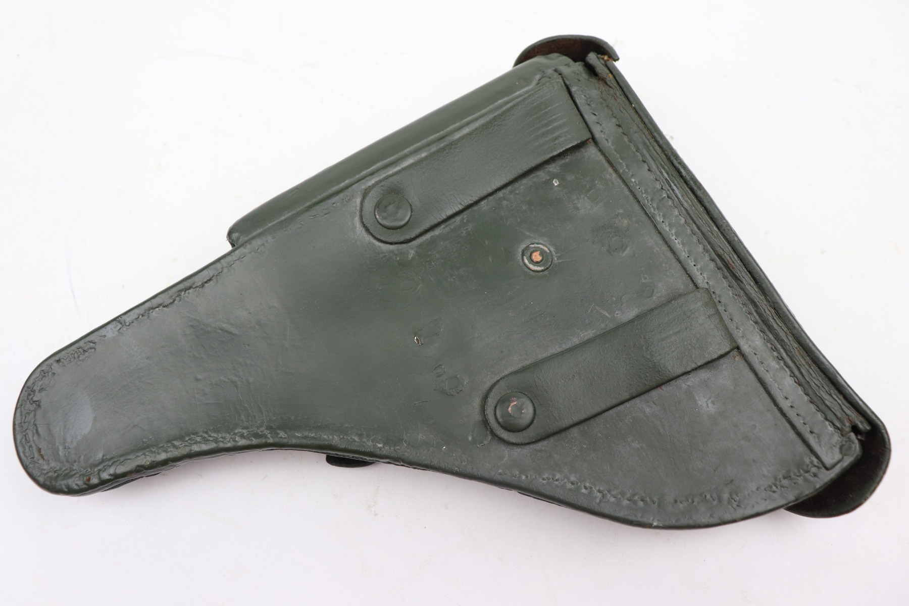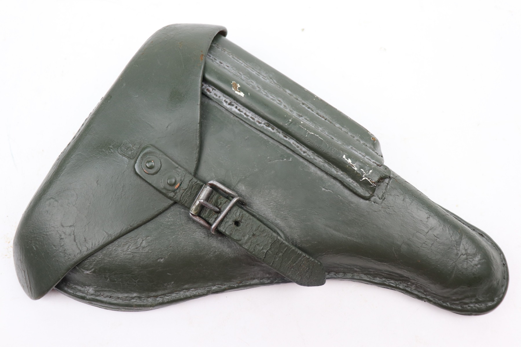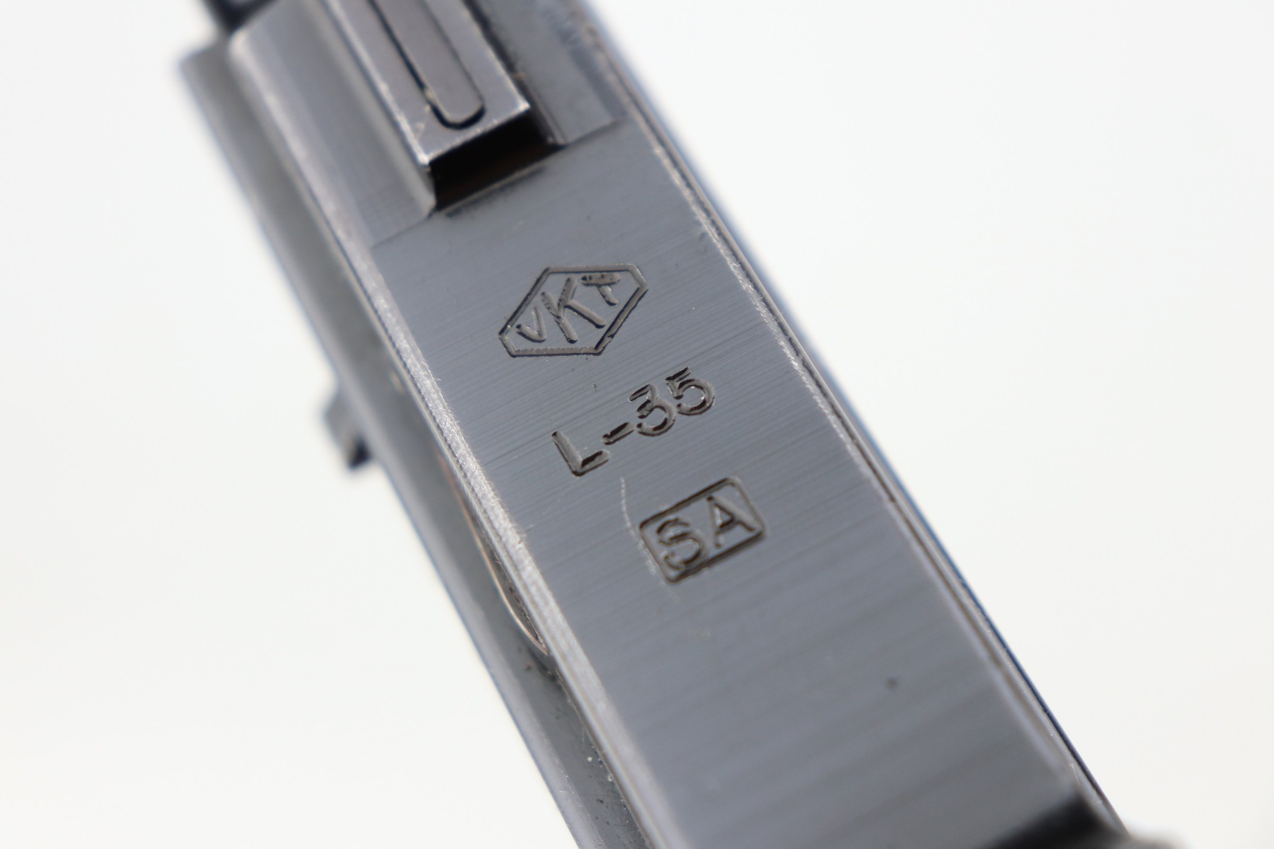 3/19/21 – This is an excellent example of a rare Finnish VKT L-35 Rig, made in the 1940’s. This Finnish designed and manufactured pistol (a copy of the Lahti) was issued to Finnish military frontline-units during Winter War (1939 – 1940) in very small numbers and in growing numbers during Continuation War (1941 – 1944). After World War it remained in use of Finnish Armed Forces until 1980’s. This is a Series 3 pistol, characterized by the VKT makers mark and SA marking on the top of the slide. Only a little more than 2,000 of these guns were manufactured. The gun is all matching and has retained about 95% of its original finish. There is minor wear on the straps, around the muzzle, and on the high edges. Some light handling marks here and there. Comes with excellent VKT grips – small chip in the left panel. The rig comes with a rare green “SA” marked holster and a proper “SA” marked magazine. The bore is excellent – shiny with strong rifling.