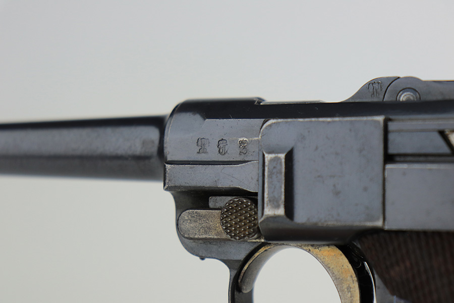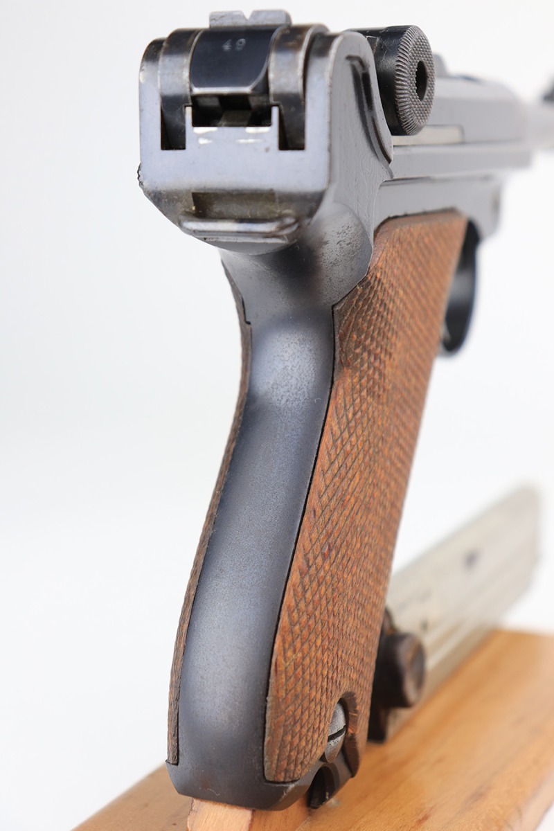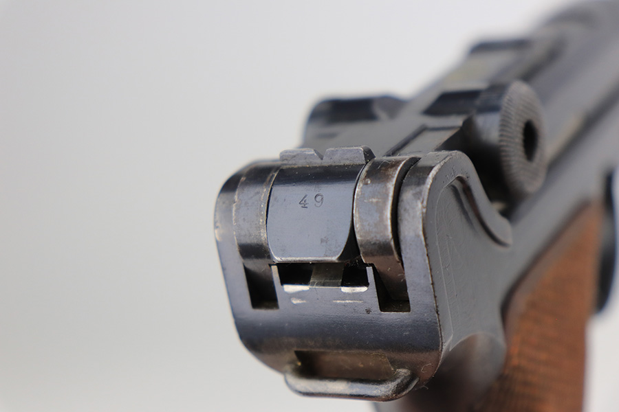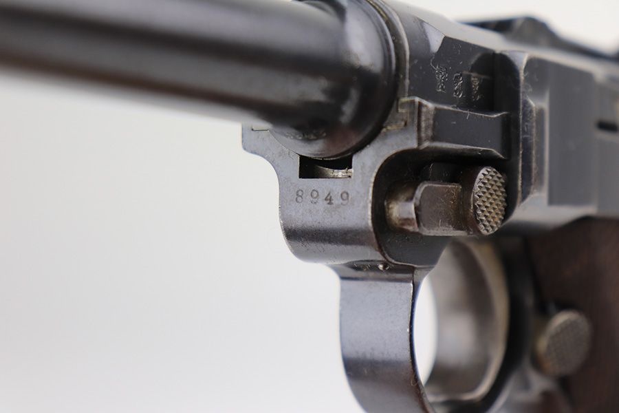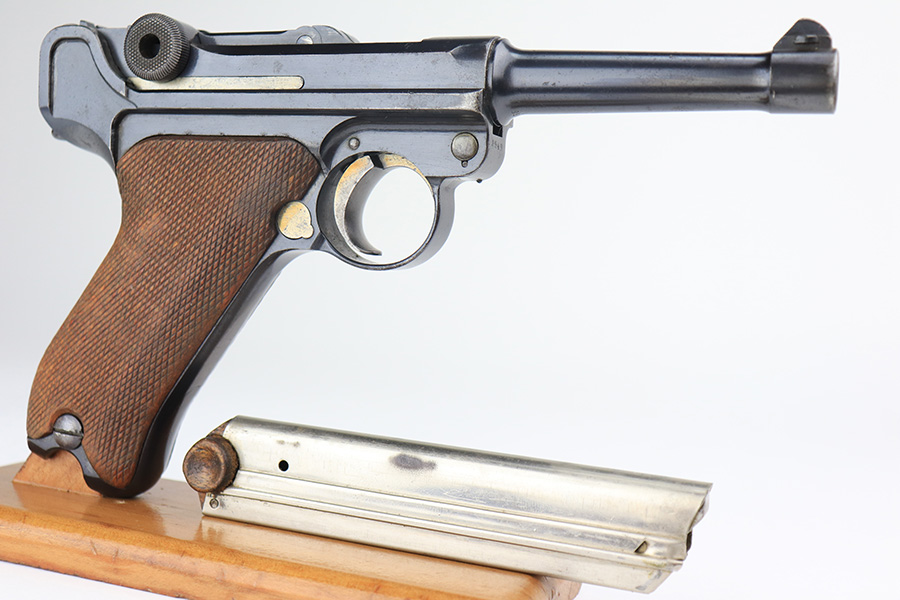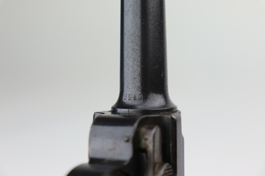 4/7/22 – This is a rare 1908 First Issue DWM military Luger in good condition. There were only 25,000 1st issue examples produced, and roughly 6,000 were unit marked. This one appears to have had a unit marking on the front strap that was removed for unknown reason. The first issue Lugers were the first military produced Lugers in 9mm, as this was one of the most requested changes in response to the earlier 1902 and 1906 models. The pistol is all matching except for the firing pin, which is mismatched. Toggle pin is correctly unnumbered, and the gun correctly has no hold open or stock lug. The bluing on the gun is excellent overall, aside from the scrubbed marking on front strap. There is freckling all around the barrel though. The grips are unmarked with minor smoothing but no cracks or chips. WW1-era magazine with unmarked wood base. Bore shows notable wear with freckling and frost throughout.