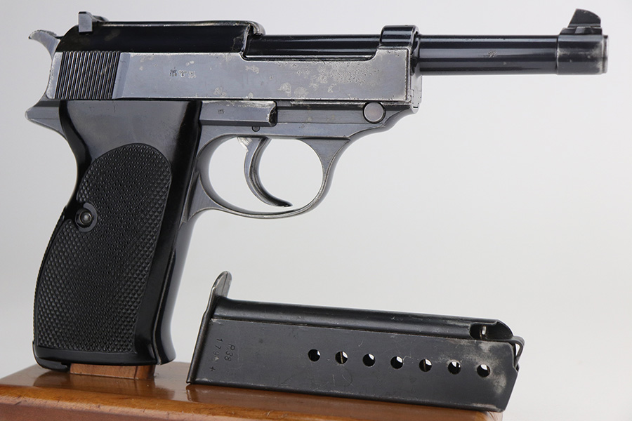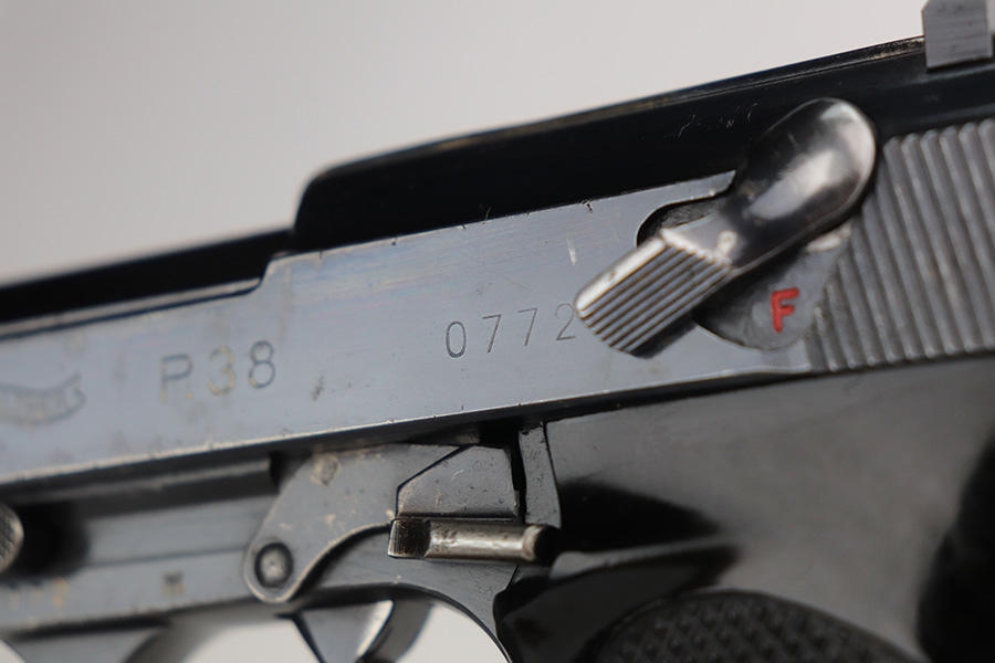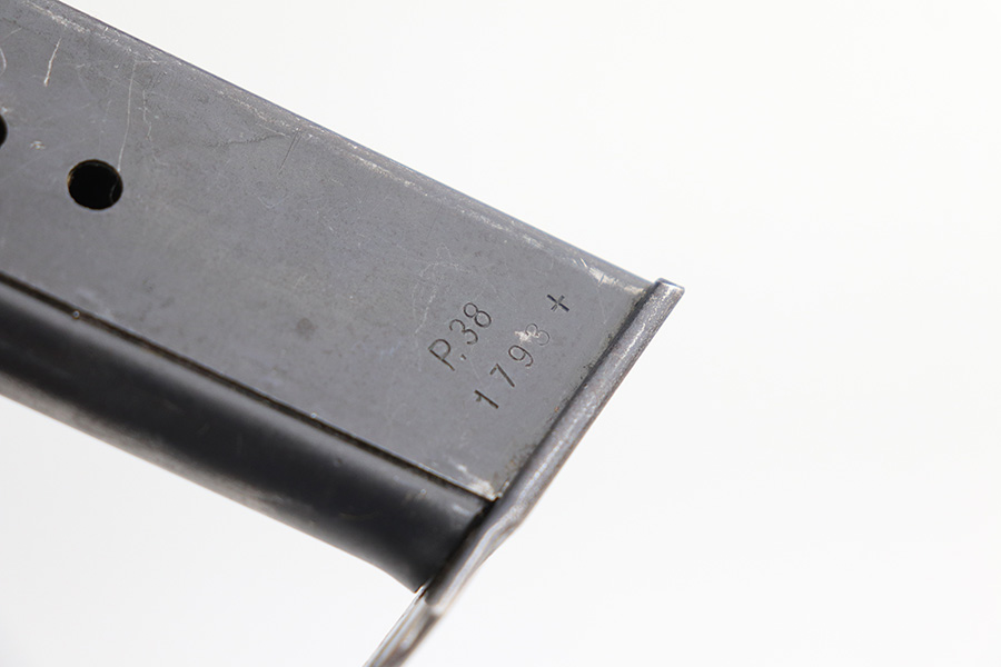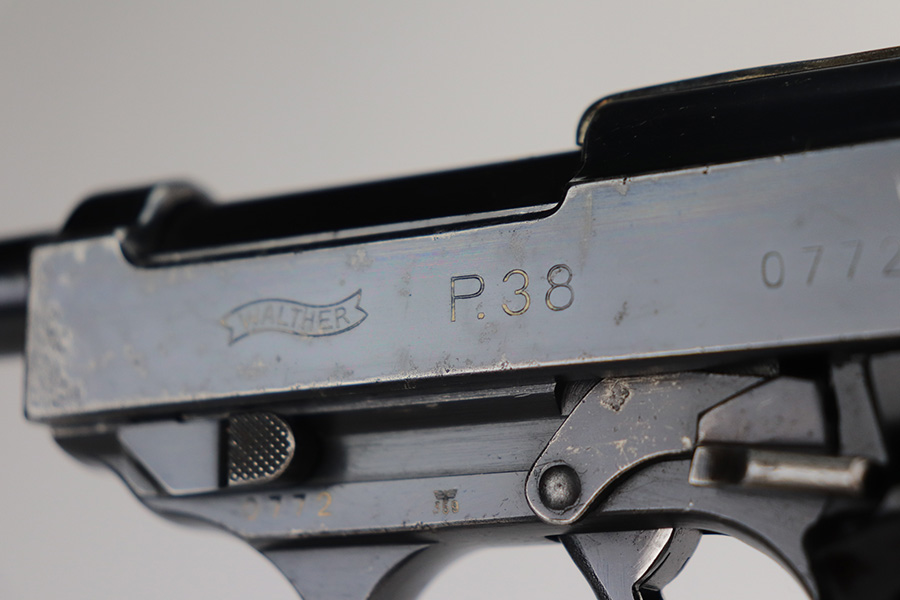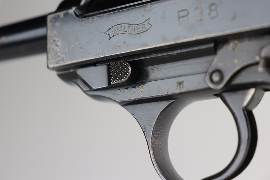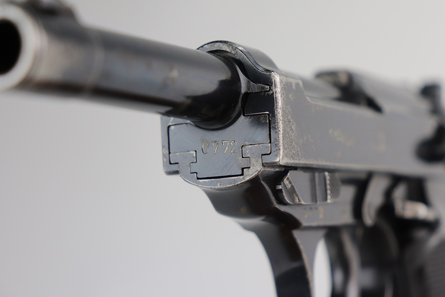 4/7/22 – This is a rare and highly desirable Zero Series Walther P.38, part of the first variation run of these pistols. Only about 1,000 of these pistols were produced. The First Variation Zero Series is characterized by this serial range, the rectangular firing pin, and a hidden extractor. This one is all matching and has retained roughly 80-85% of its original finish. There are areas of spotty discoloration and minor pitting on both sides of the slide, on the barrel, on the safety lever, around the muzzle, and the underside of the trigger guard. The gun comes with its original matching grips and a proper Zero Series magazine that does not match the gun. The bore has strong rifling with spotty freckling throughout. De-cocker is functional.